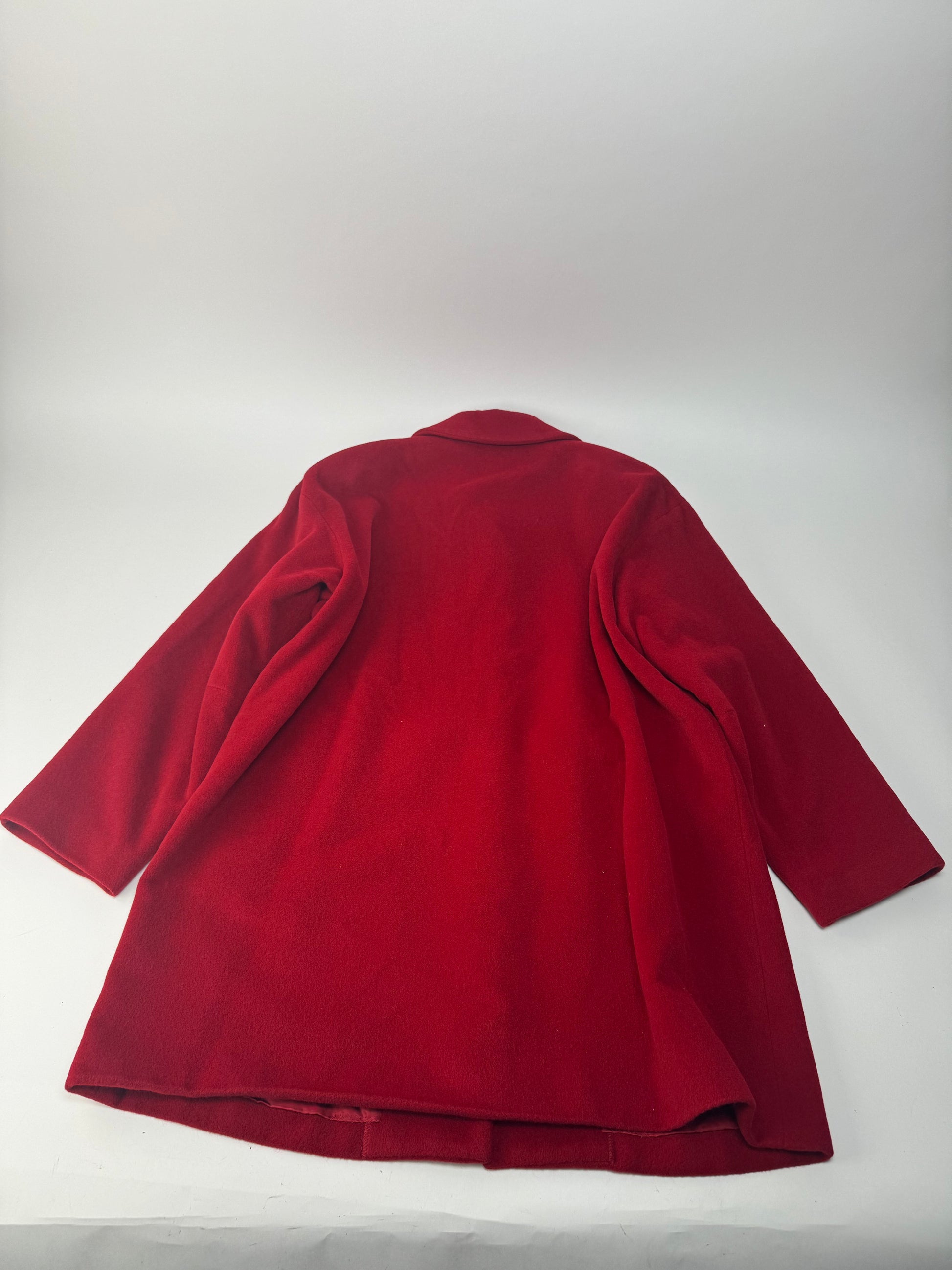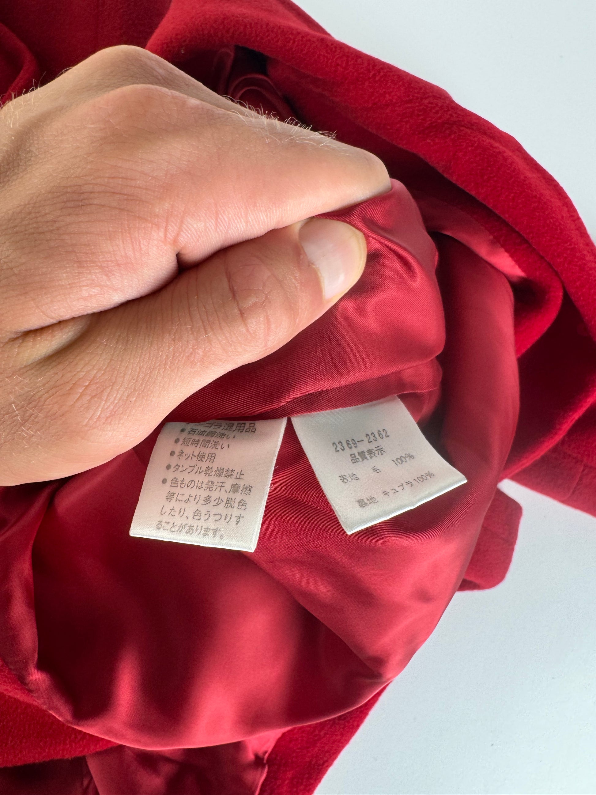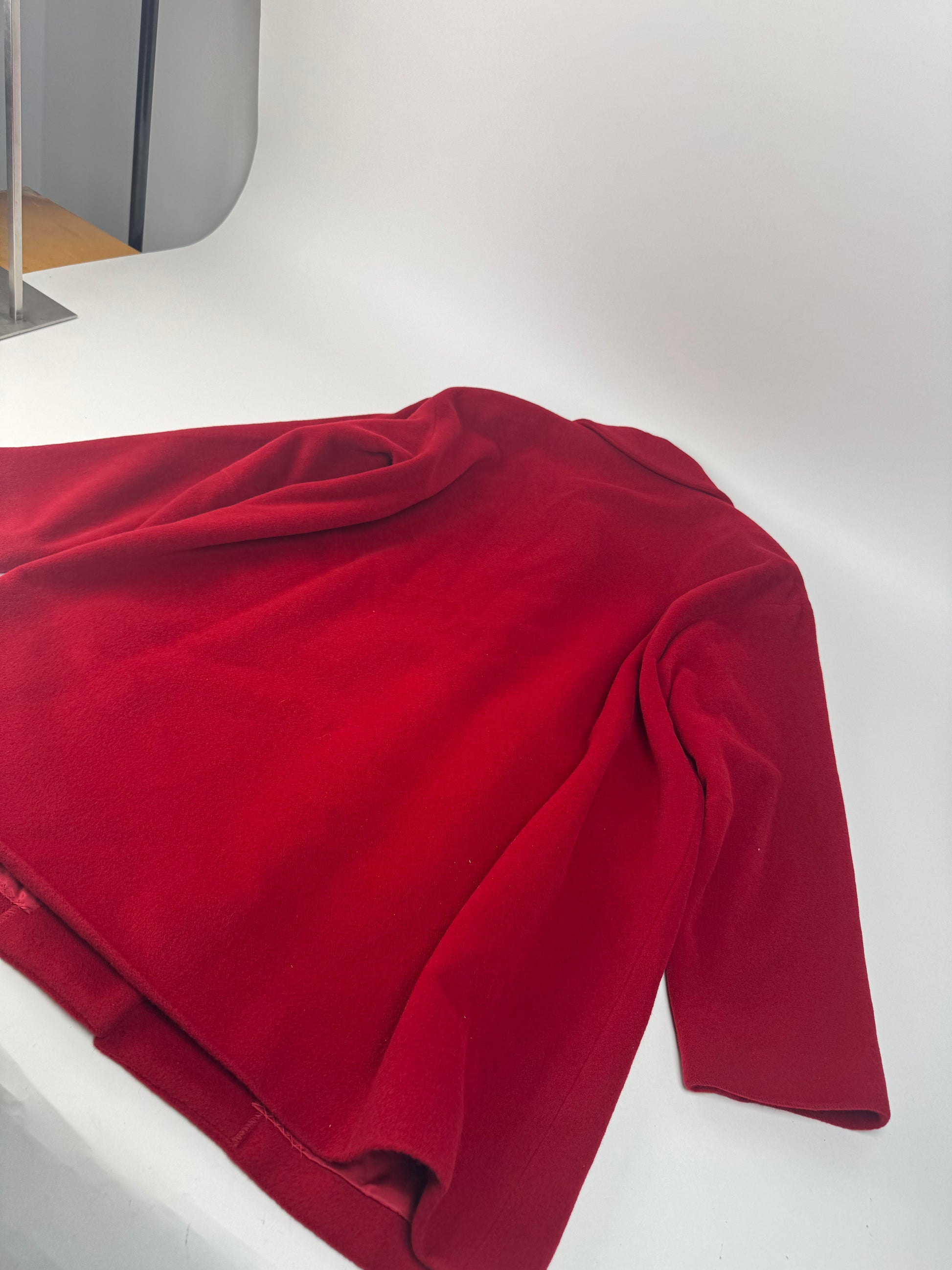 BALENCIAGA Wool-Blend Coat with Red Buttons. This elegant vintage coat is crafted from a rich wool or llama hair blend in bold red. It features red plastic buttons and a soft viscose lining for added comfort.