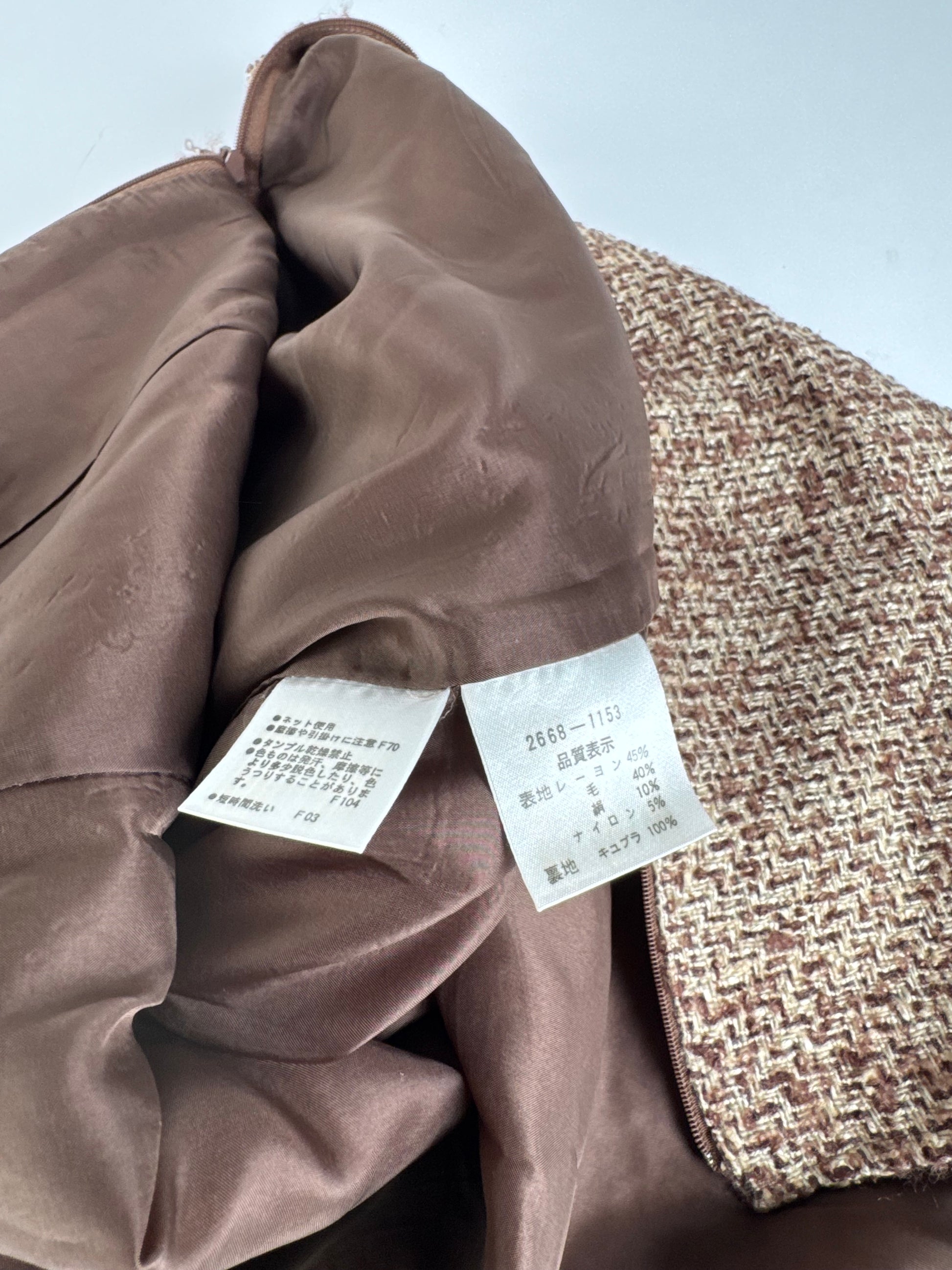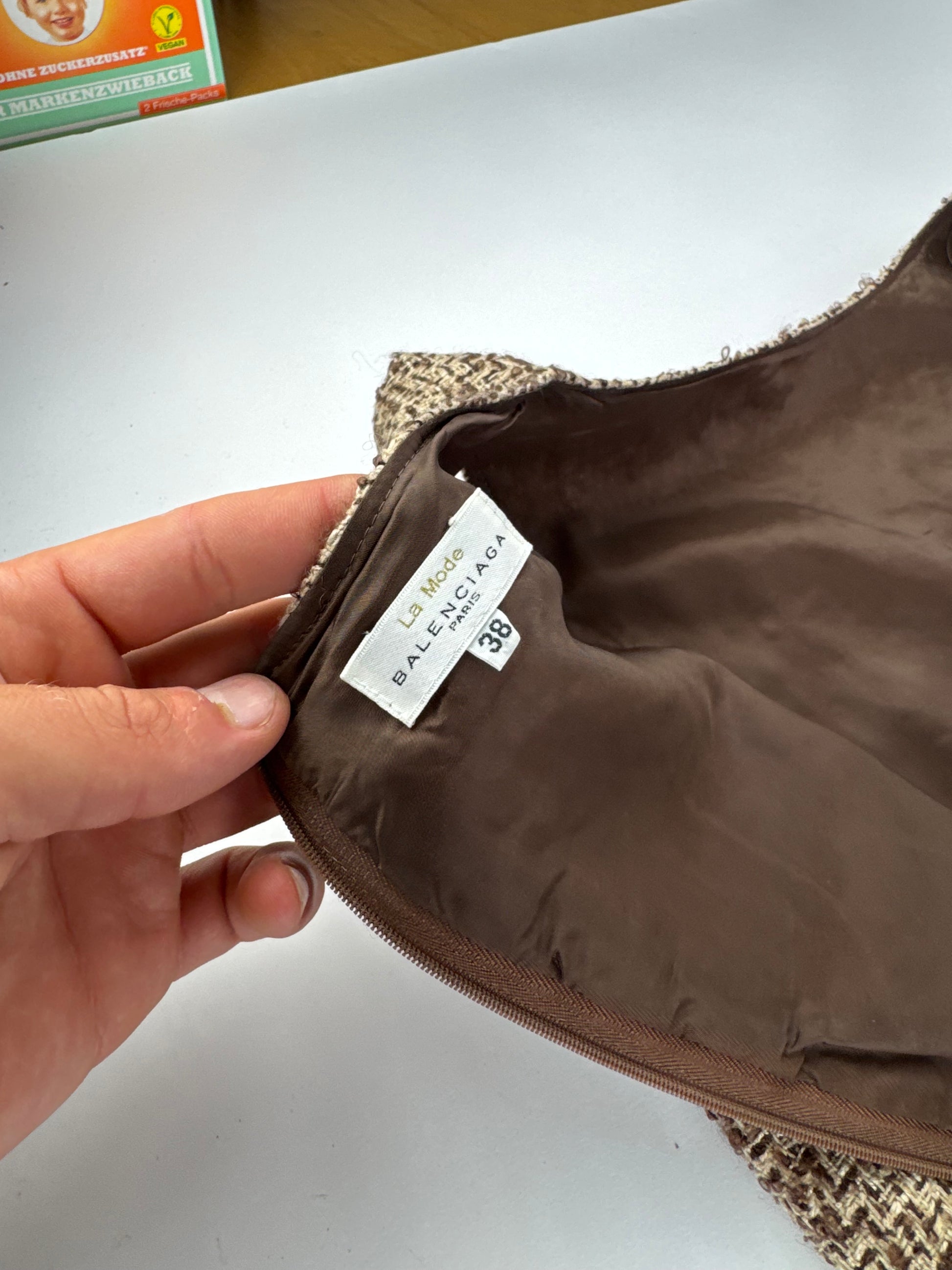 BALENCIAGA Vintage Wool Dress. This elegant vintage dress is finely crafted of brown and white patterned wool with a large rear zipper. The lining is made of viscose.
