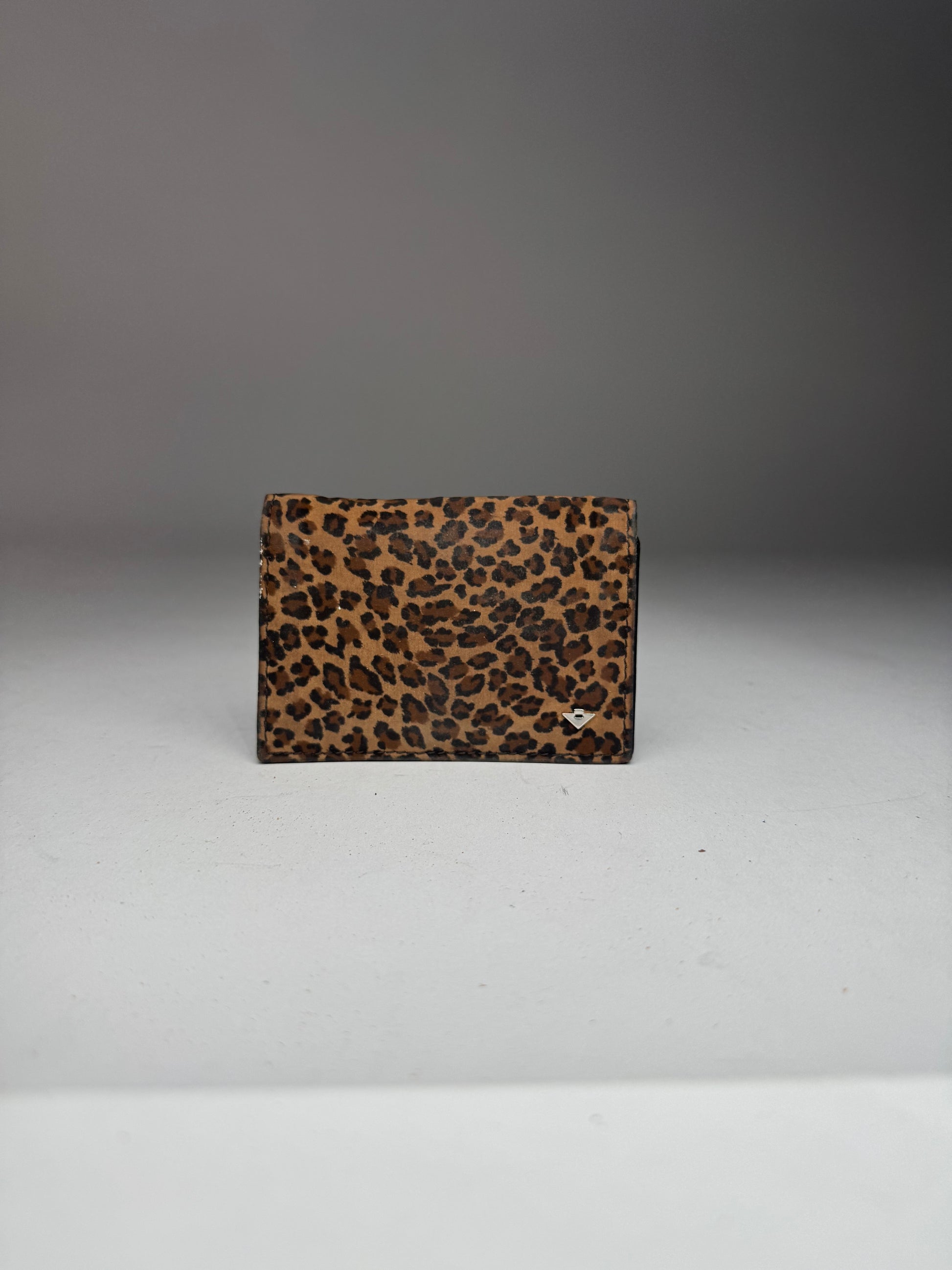 BOTTEGA VENETA Vintage Card Holder. This vintage Bottega Veneta card holder is crafted from leopard-print canvas, paired with silver-tone steel hardware for a bold yet refined look. The interior is lined with brown leather, offering a luxurious finish. Made in Italy, it is a stylish and practical unisex accessory.