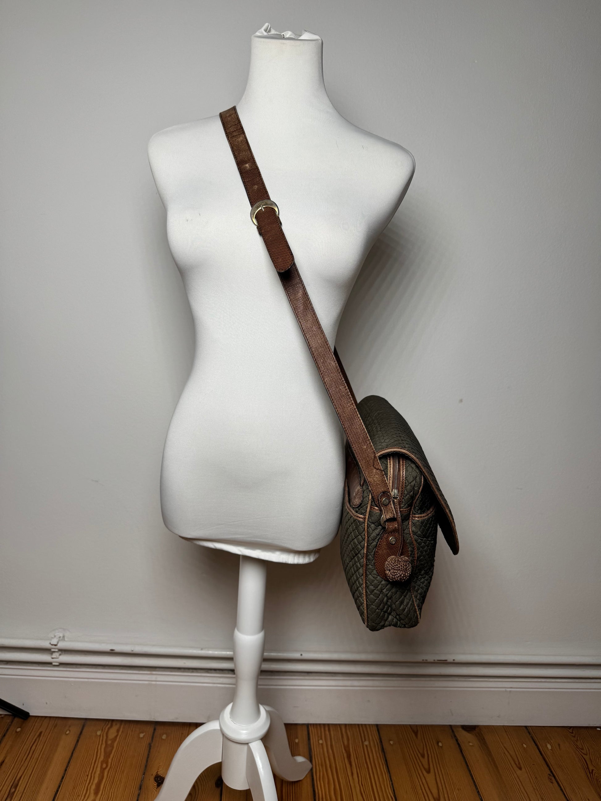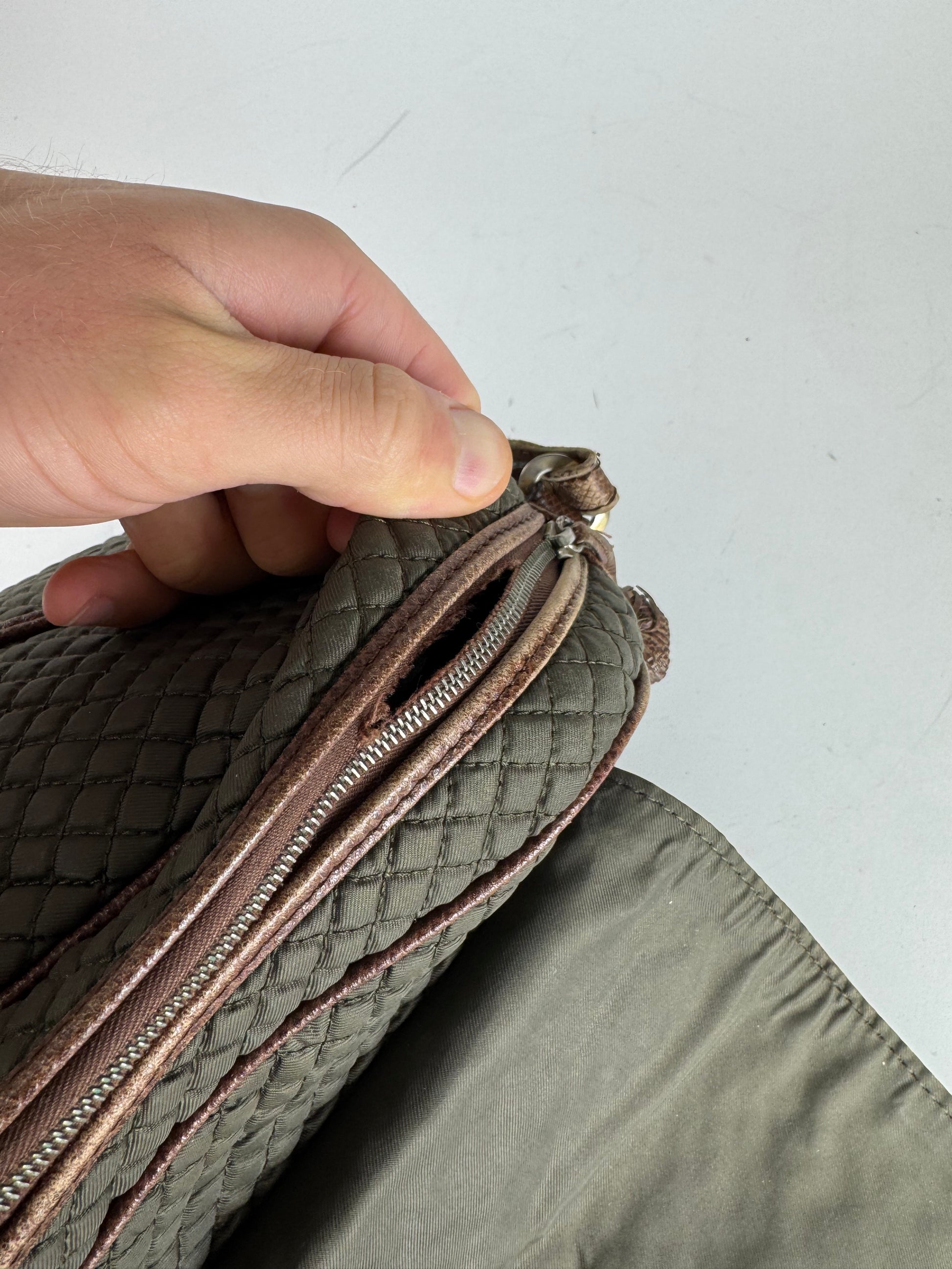 BOTTEGA VENETA Vintage Puffer Bag. This chic handbag is finely crafted of dark green padded canvas with brown leather details and gold-tone steel hardware. It features a top zipper closure (partially damaged, as shown in photos), a twist-lock fastening, and an adjustable shoulder strap.
