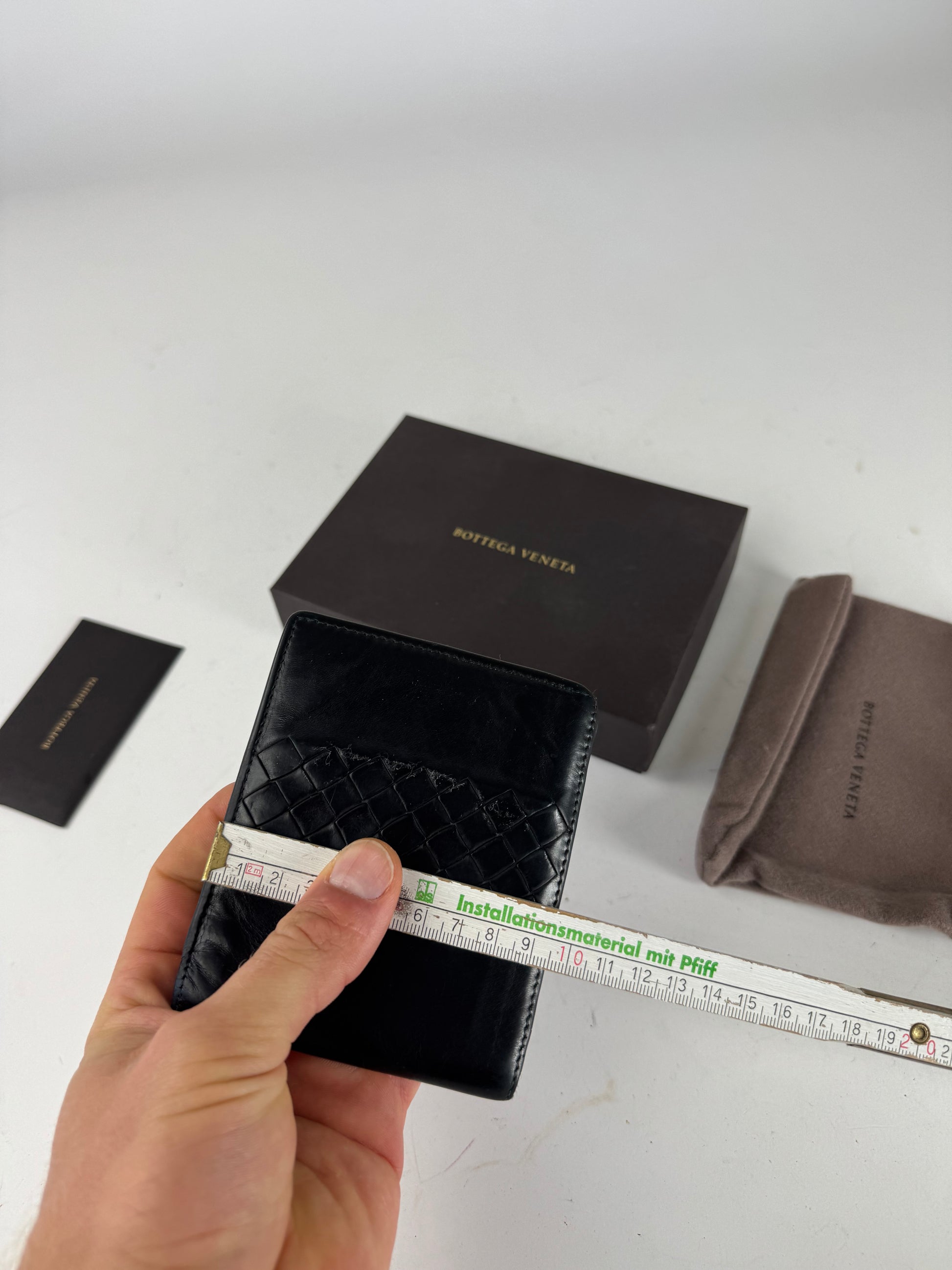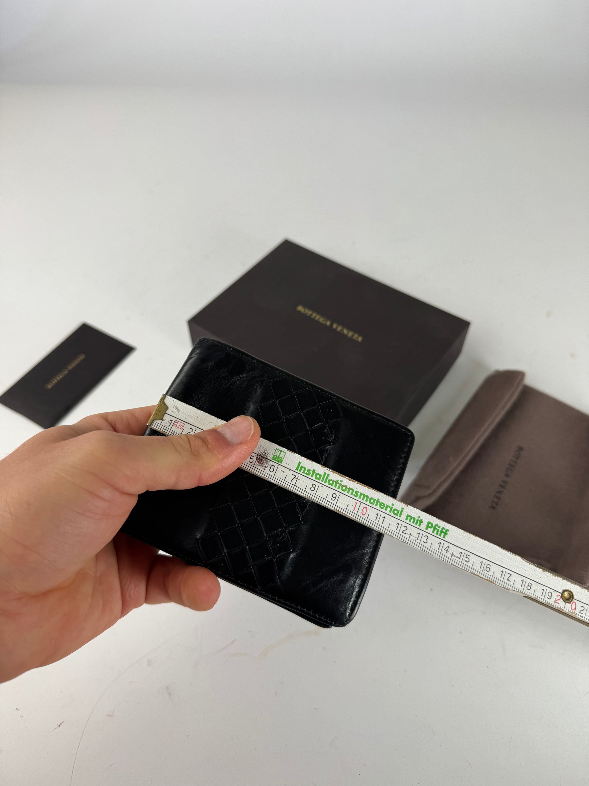 This elegant vintage wallet by Bottega Veneta is crafted from high-quality black leather. It comes with the original Bottega Veneta box, dustbag, and authentication card. The wallet is unisex, made in Italy, and in very good condition, showing only normal signs of wear.