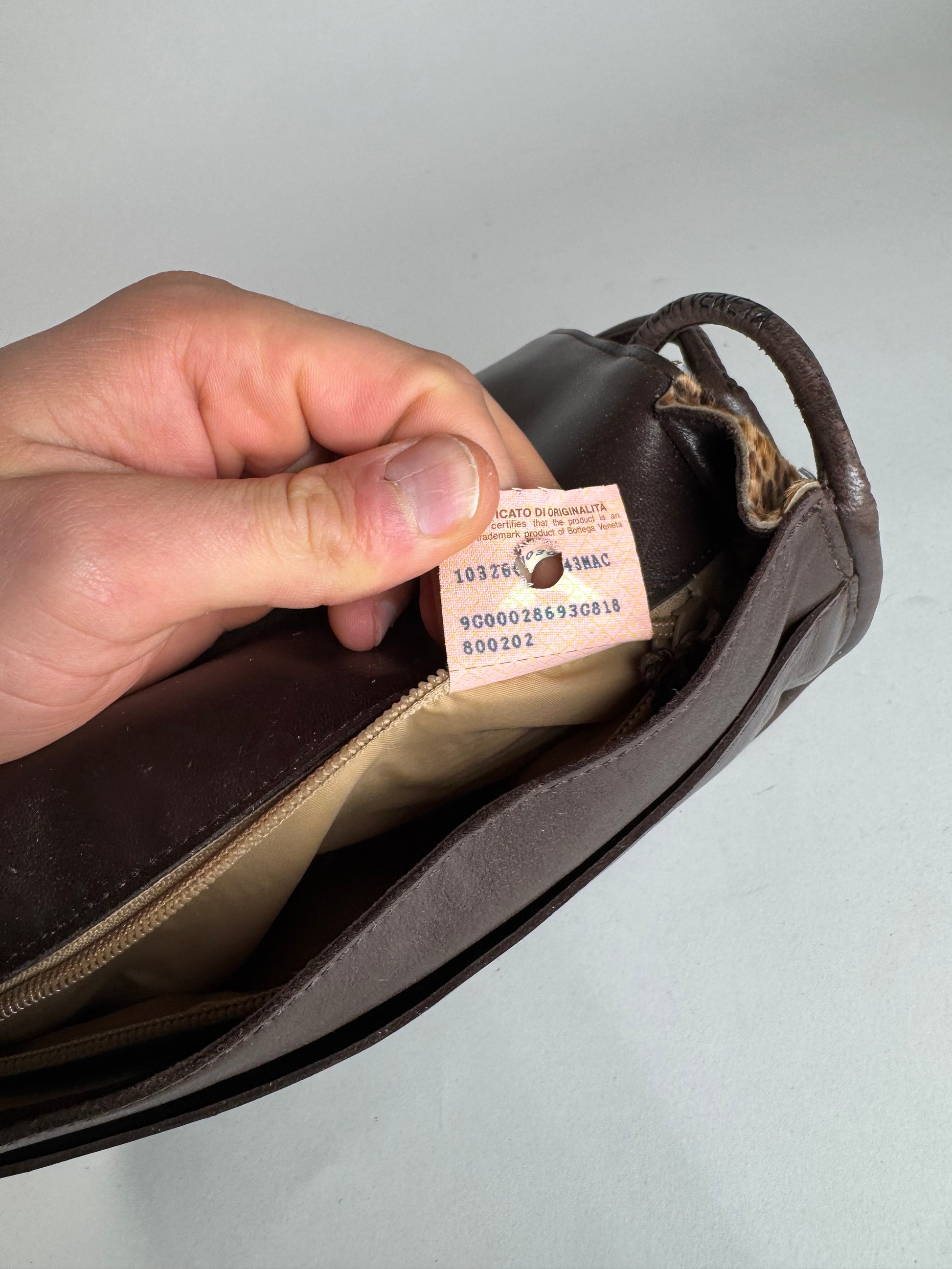 This vintage handbag is finely crafted from brown leopard-print fur, complemented by brown leather details. The gold-tone stainless steel hardware adds a luxurious touch. The interior is lined with coated canvas, though it shows significant peeling and damage. Made in Italy, this statement piece embodies Bottega Veneta’s timeless elegance.