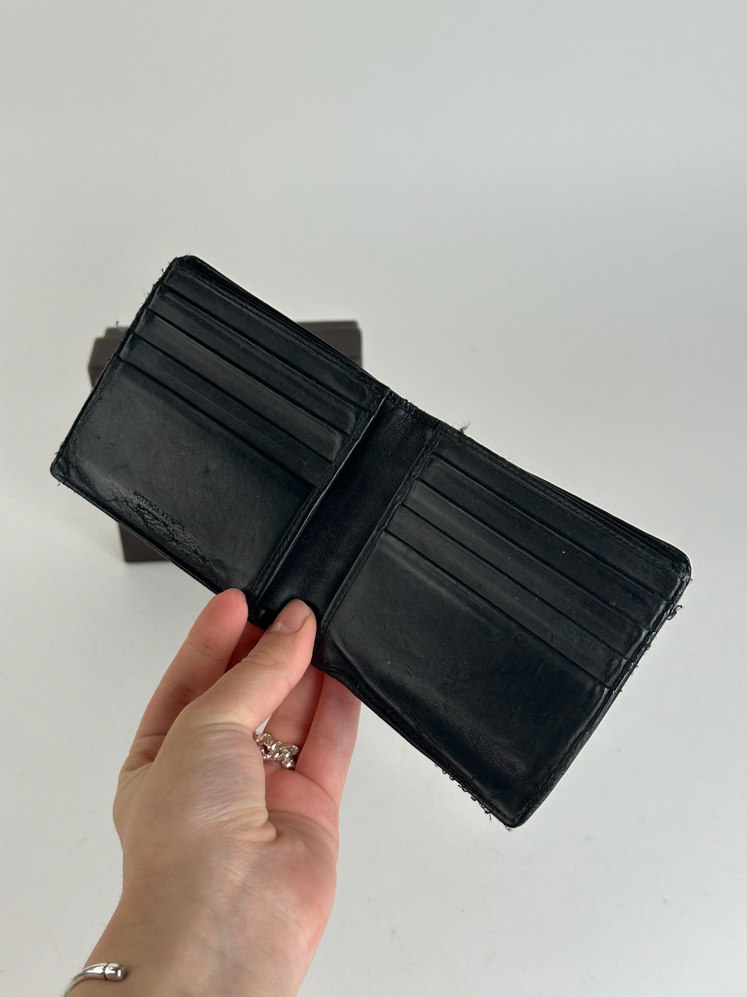 BOTTEGA VENETA Vintage Intrecciato Leather Wallet. This vintage wallet is finely crafted of black leather in Bottega Veneta’s signature Intrecciato weave – a handwoven leather technique developed in the 1960s that exemplifies the brand’s commitment to craftsmanship, discretion, and timeless design. It features compartments for bills and cards but does not include a coin pocket. The piece is designed to be used unisex.