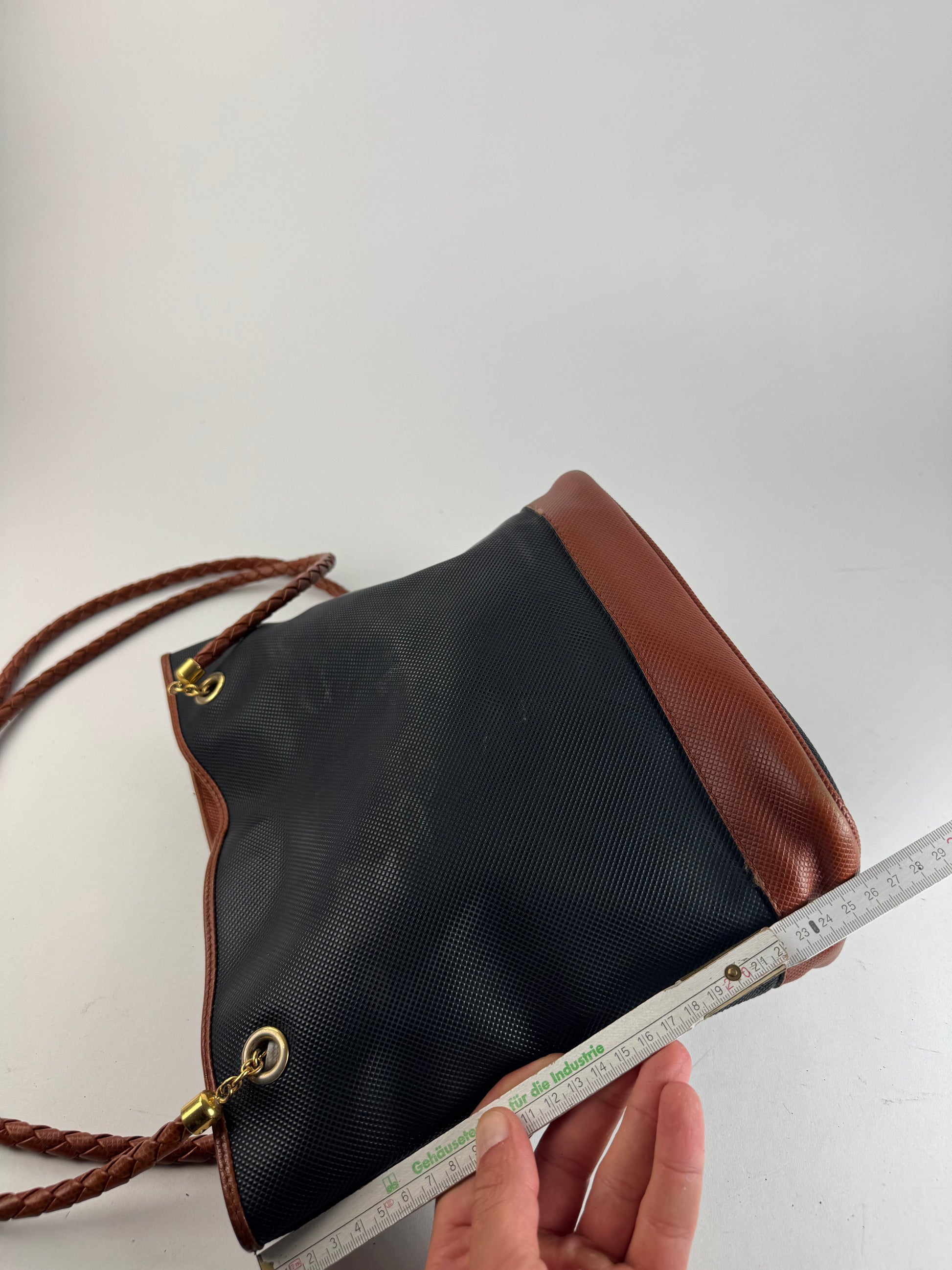 BOTTEGA VENETA Vintage Shoulder Bag. This chic handbag is finely crafted of brown and black leather. The shoulder bag features two long braided brown leather handles and can be worn over the shoulder. It has a magnetic snap closure. The bag is finished with gold-tone steel hardware.