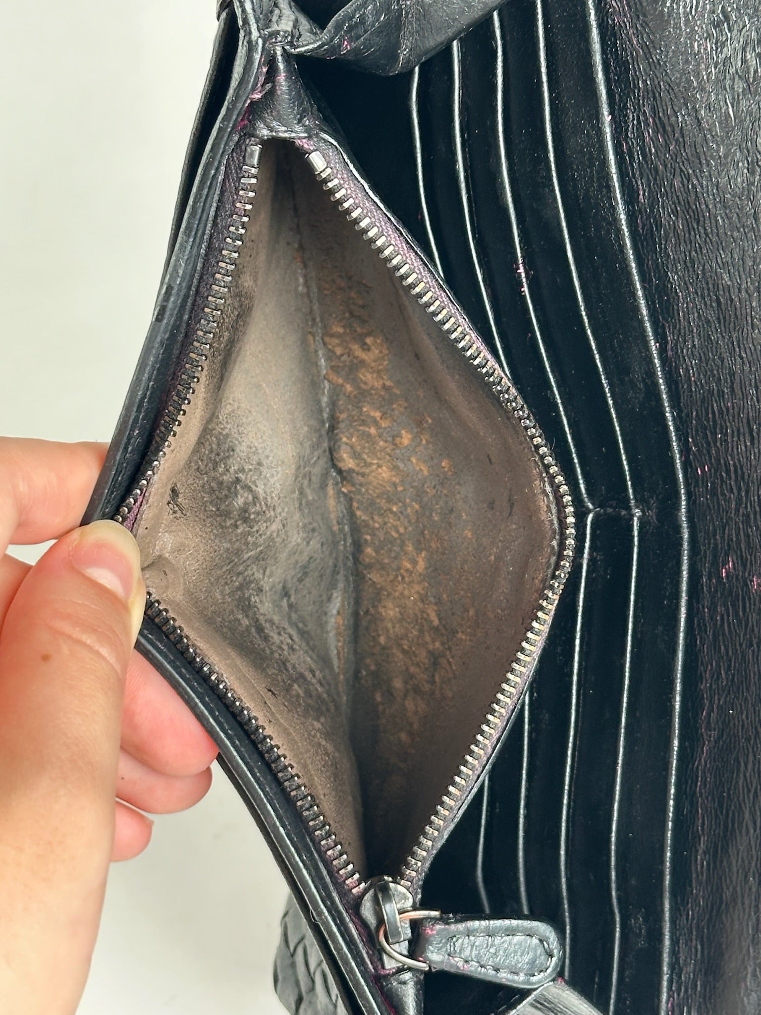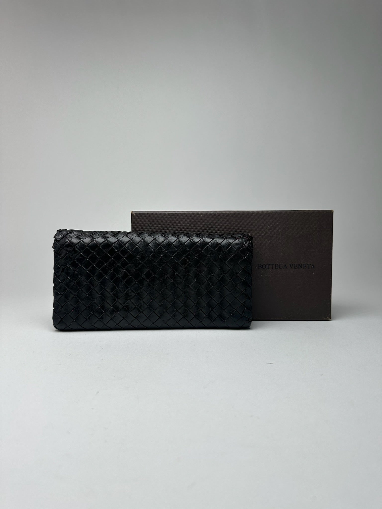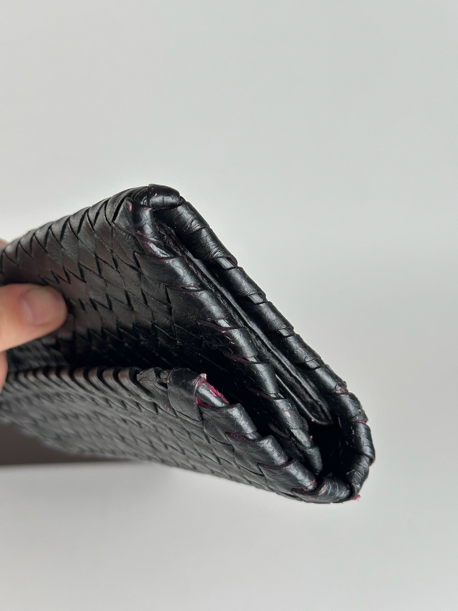 BOTTEGA VENETA Vintage Intrecciato Leather Wallet. This chic wallet is finely crafted of black leather in Bottega Veneta’s iconic Intrecciato weave. Introduced in the 1970s, the Intrecciato technique—an intricate handwoven leather pattern—has become a signature of the brand, symbolizing understated luxury and craftsmanship. The wallet features a snap button closure and opens to a black leather interior with a zipper compartment.