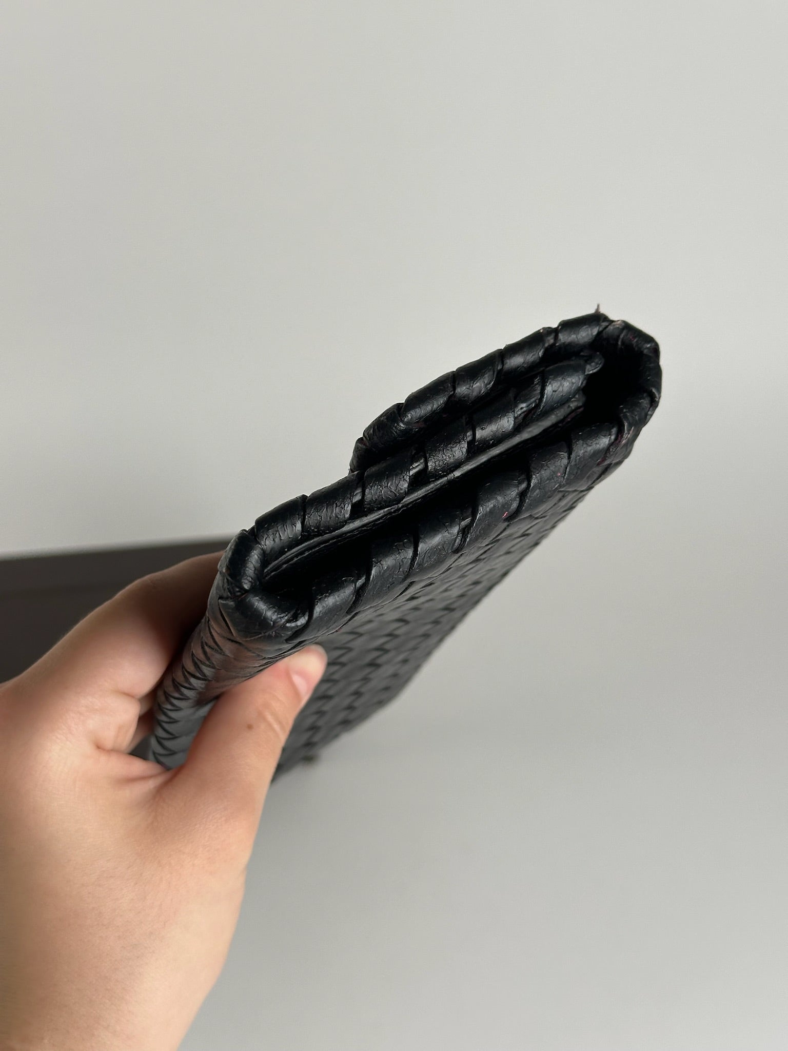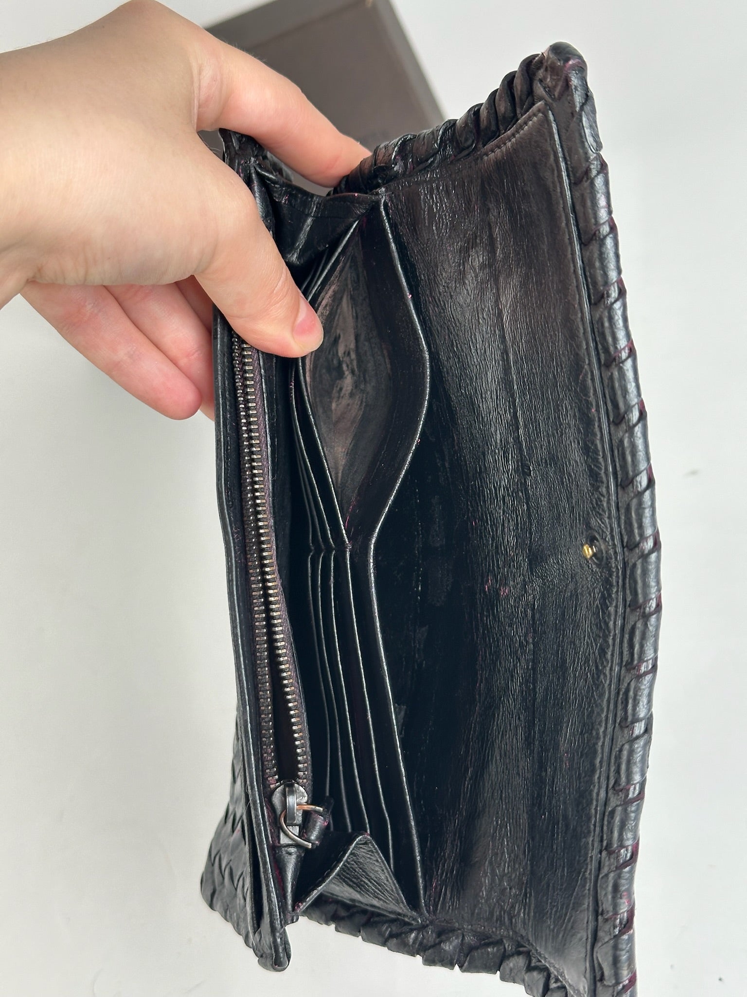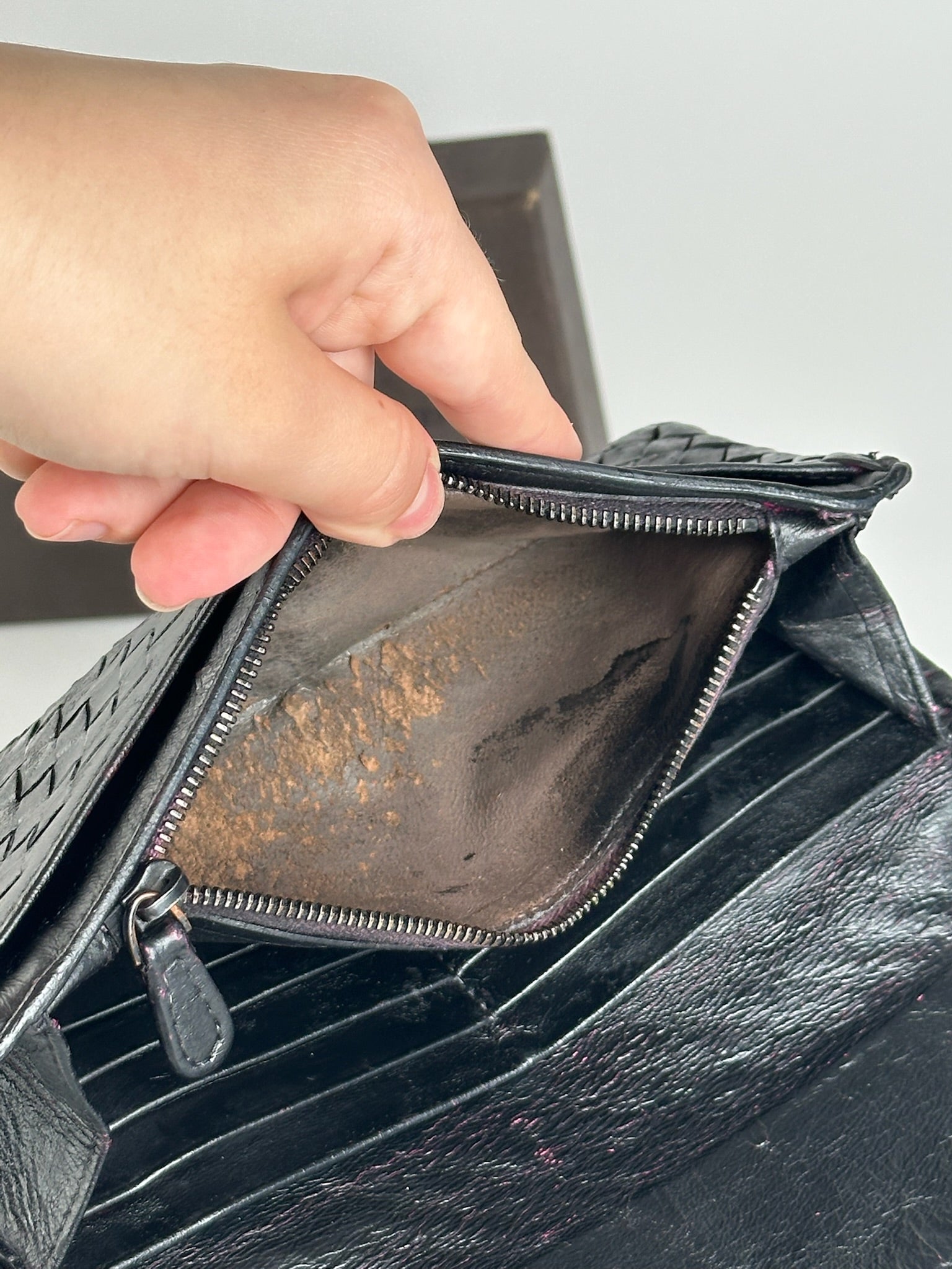 BOTTEGA VENETA Vintage Intrecciato Leather Wallet. This chic wallet is finely crafted of black leather in Bottega Veneta’s iconic Intrecciato weave. Introduced in the 1970s, the Intrecciato technique—an intricate handwoven leather pattern—has become a signature of the brand, symbolizing understated luxury and craftsmanship. The wallet features a snap button closure and opens to a black leather interior with a zipper compartment.