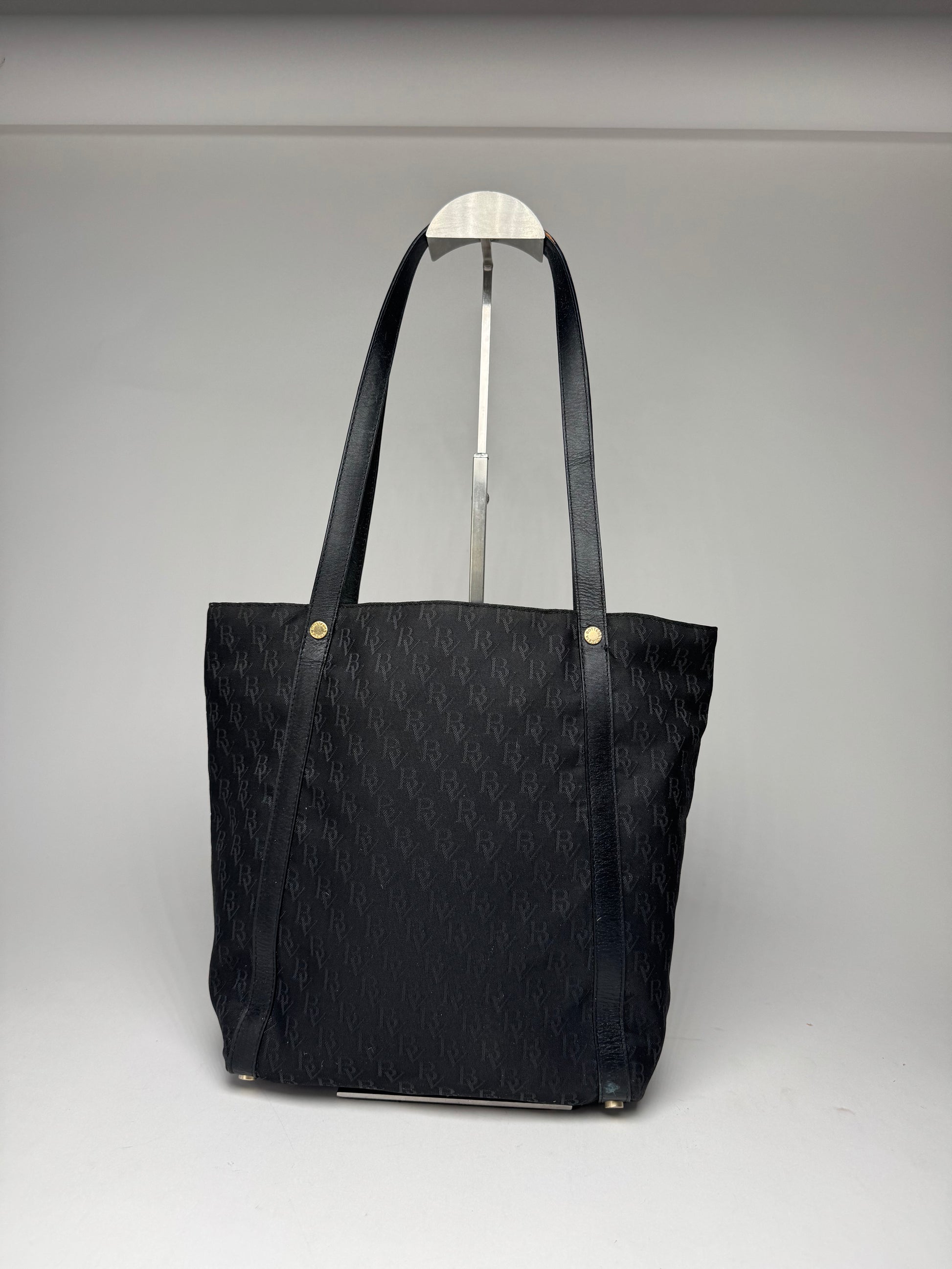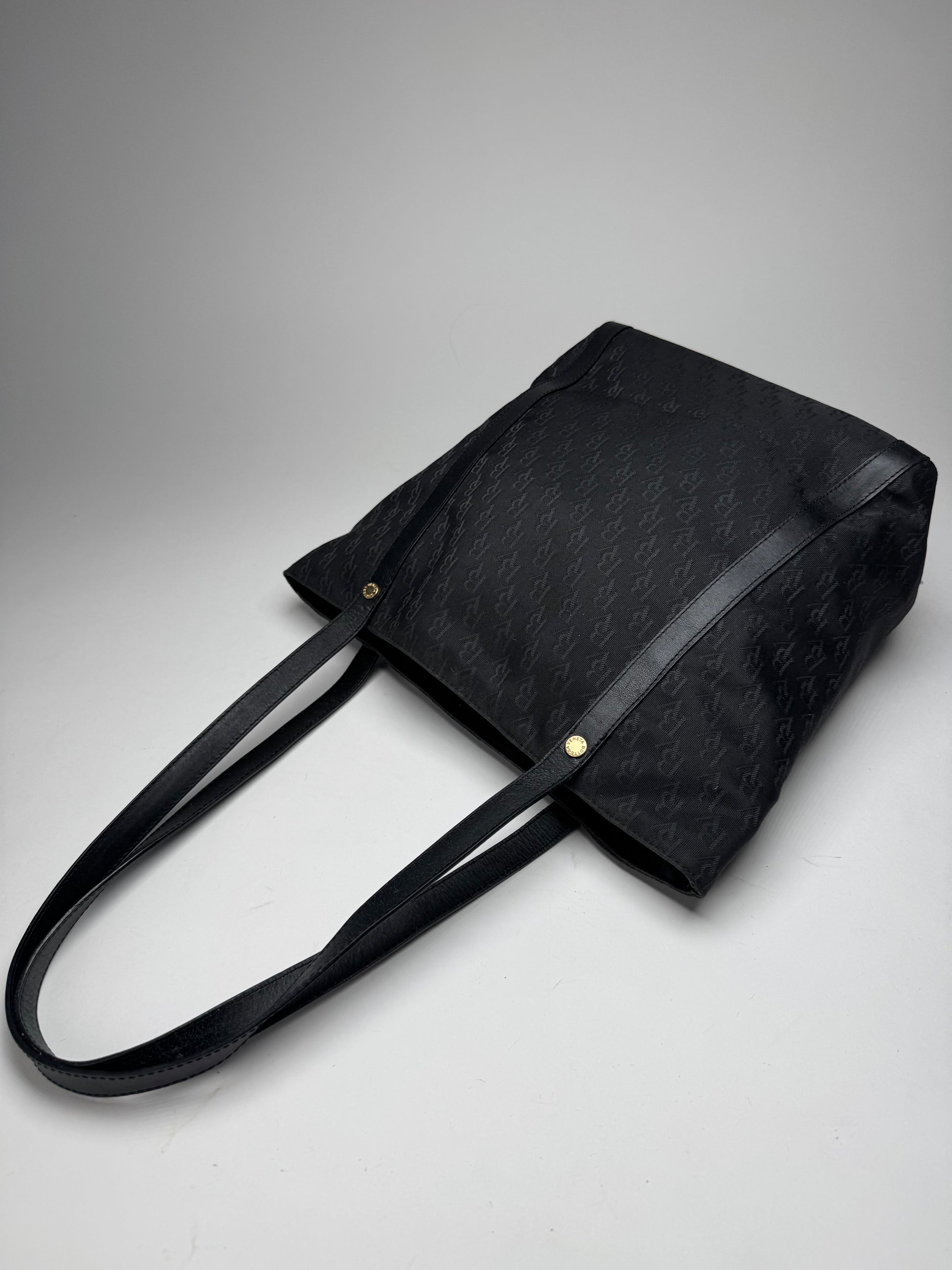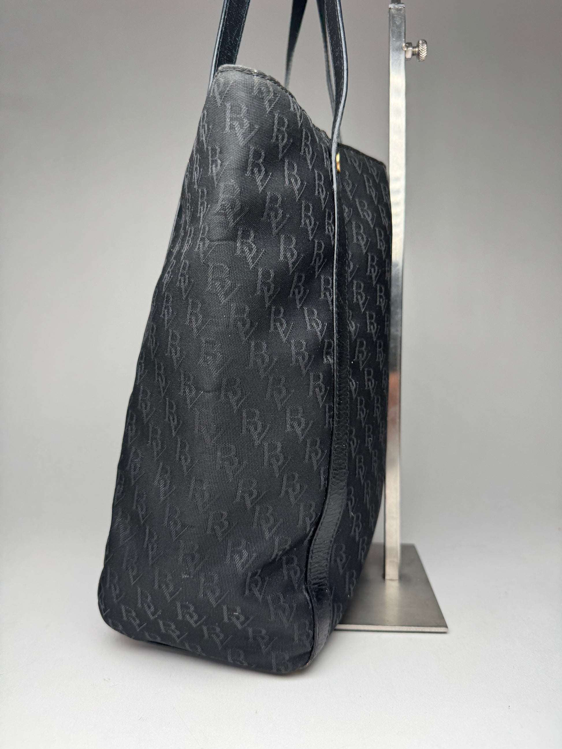 This vintage shopper bag is crafted from black canvas featuring the Bottega Veneta BV monogram. The design includes long black leather handles and gold-tone steel hardware. The interior is lined with black polyester, offering a spacious and practical layout. Made in Italy.