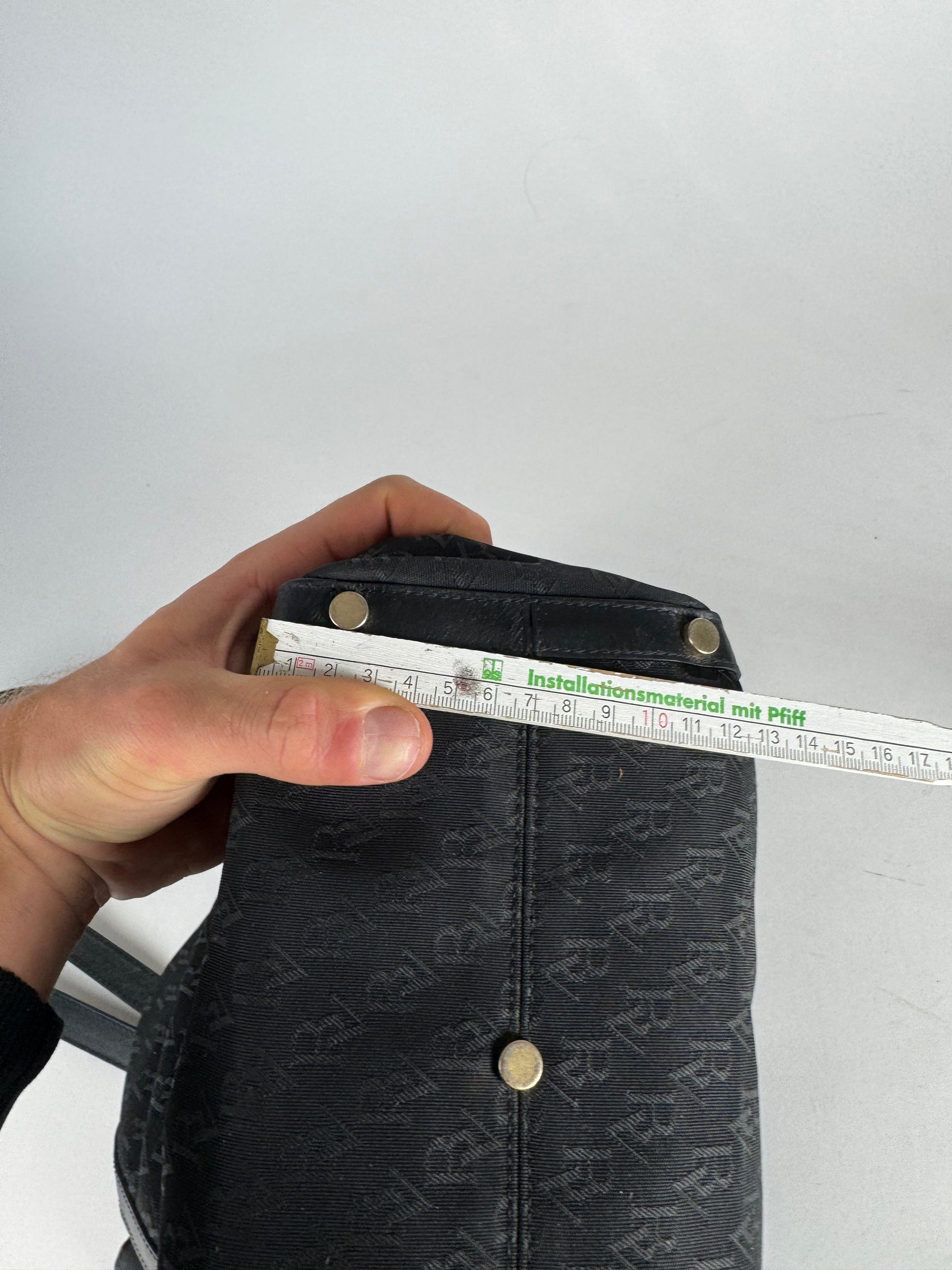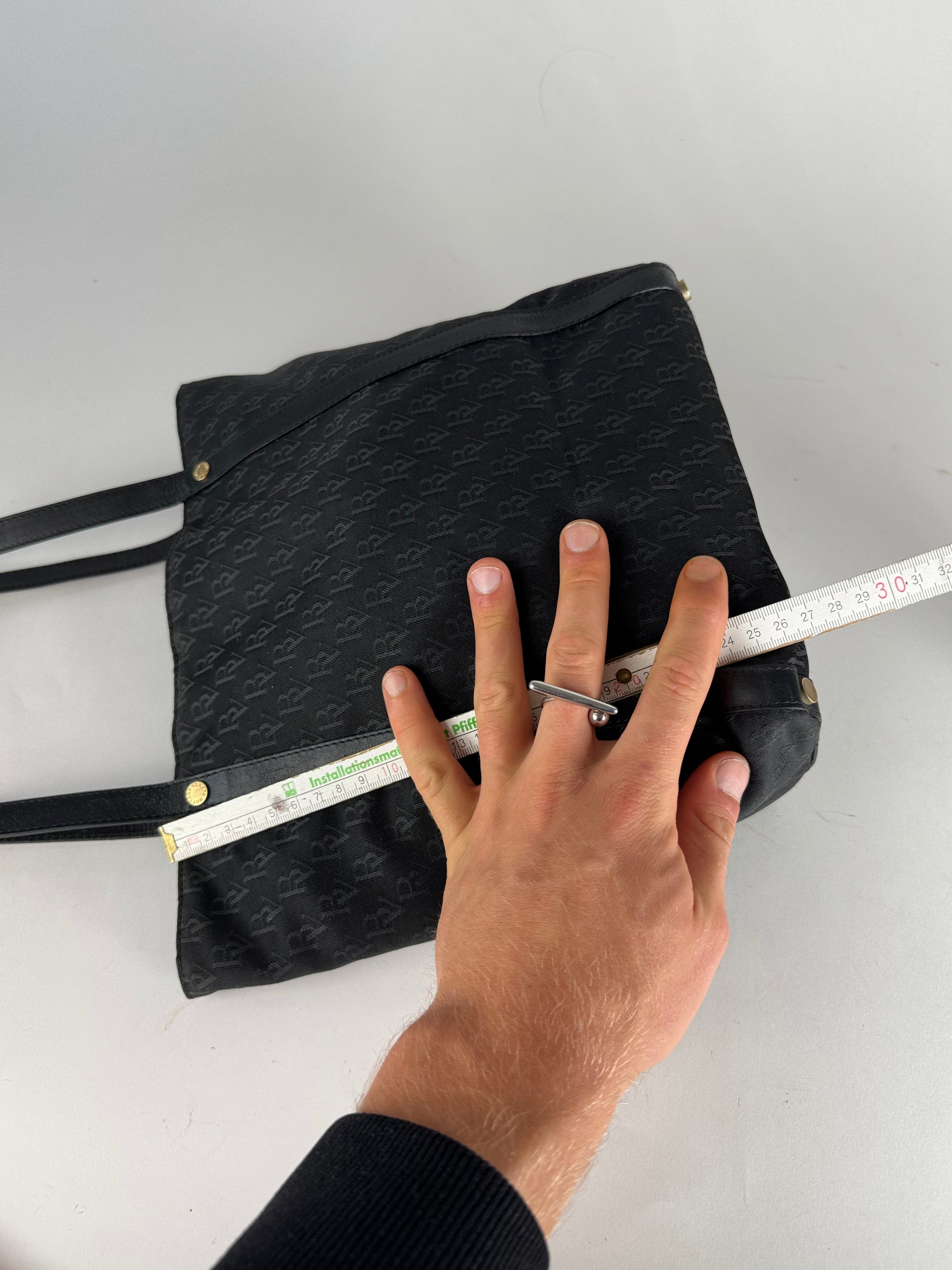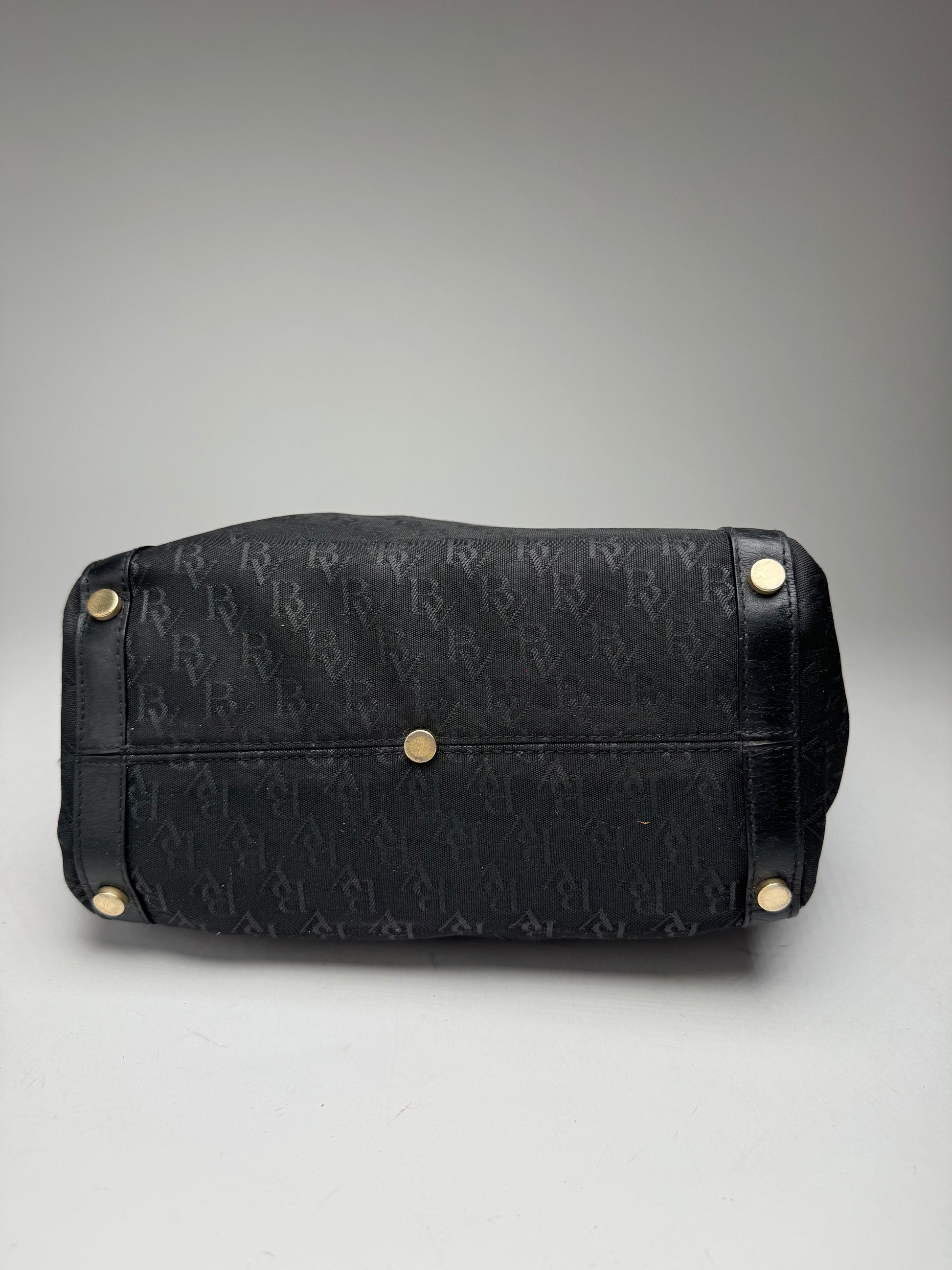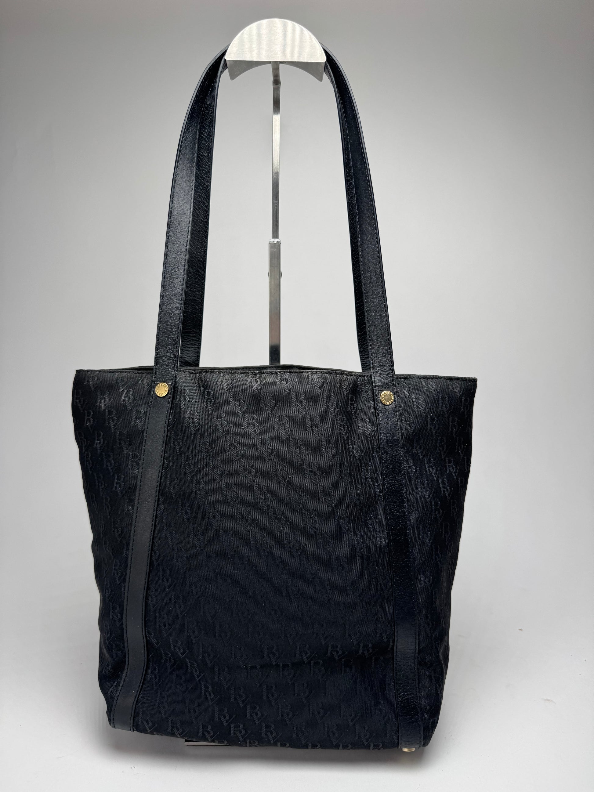 This vintage shopper bag is crafted from black canvas featuring the Bottega Veneta BV monogram. The design includes long black leather handles and gold-tone steel hardware. The interior is lined with black polyester, offering a spacious and practical layout. Made in Italy.