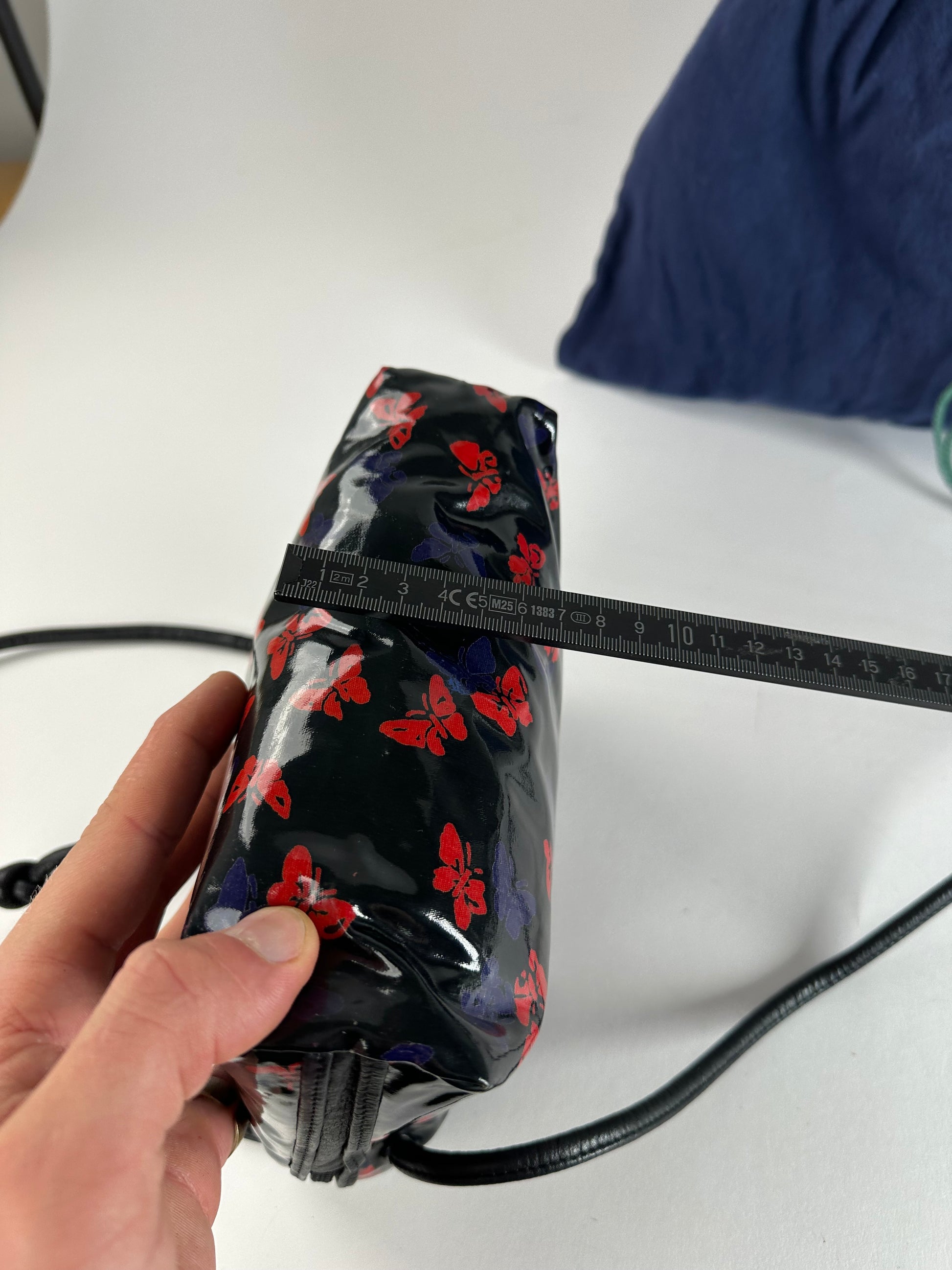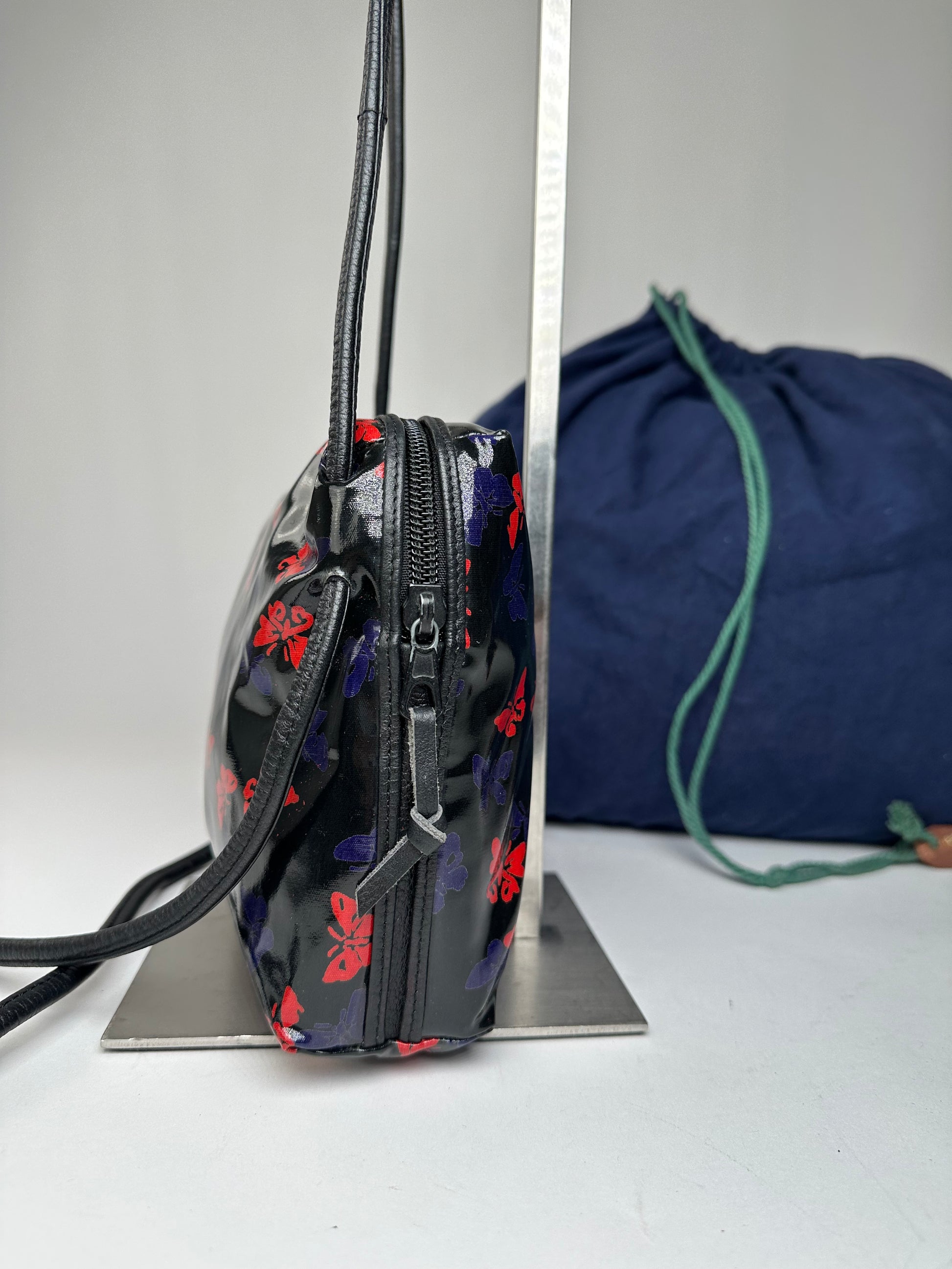 BOTTEGA VENETA Vintage Multiway Handbag. This distinctive handbag is crafted of black patent leather adorned with blue and red butterfly motifs. The bag features adjustable handles that can be shortened or lengthened, a top zip closure, and gold and black-tone steel hardware. The interior opens to a black leather lining.