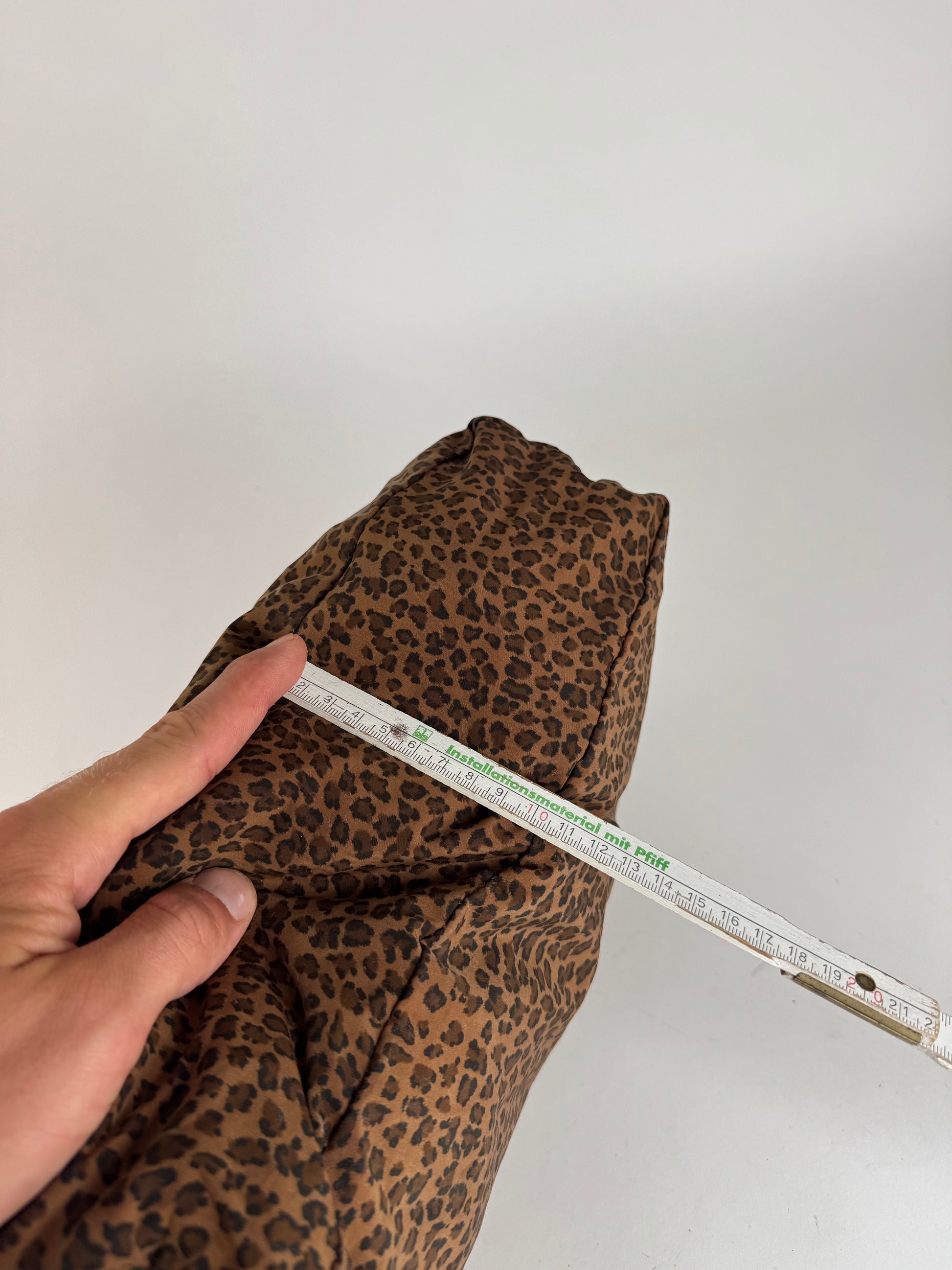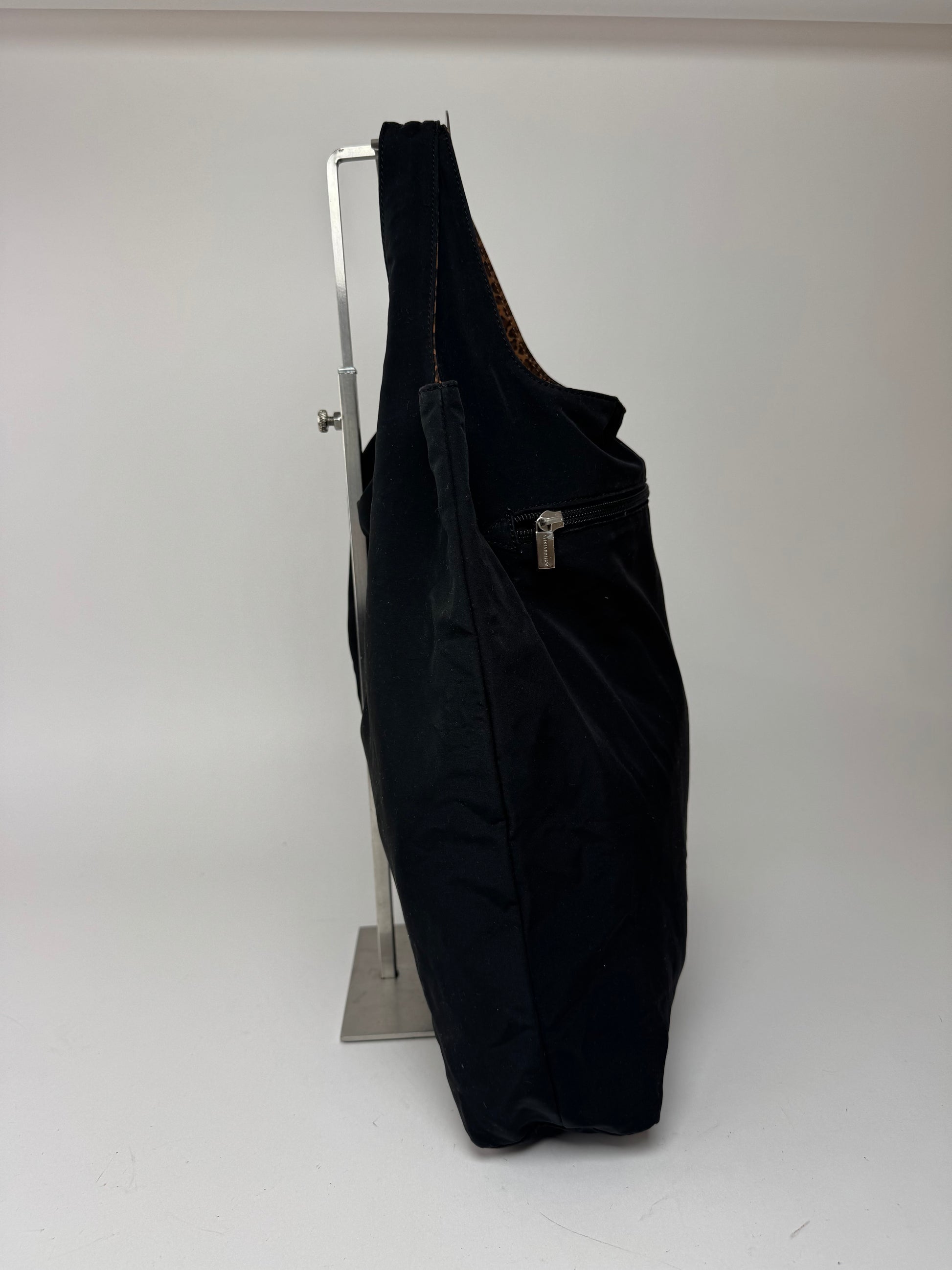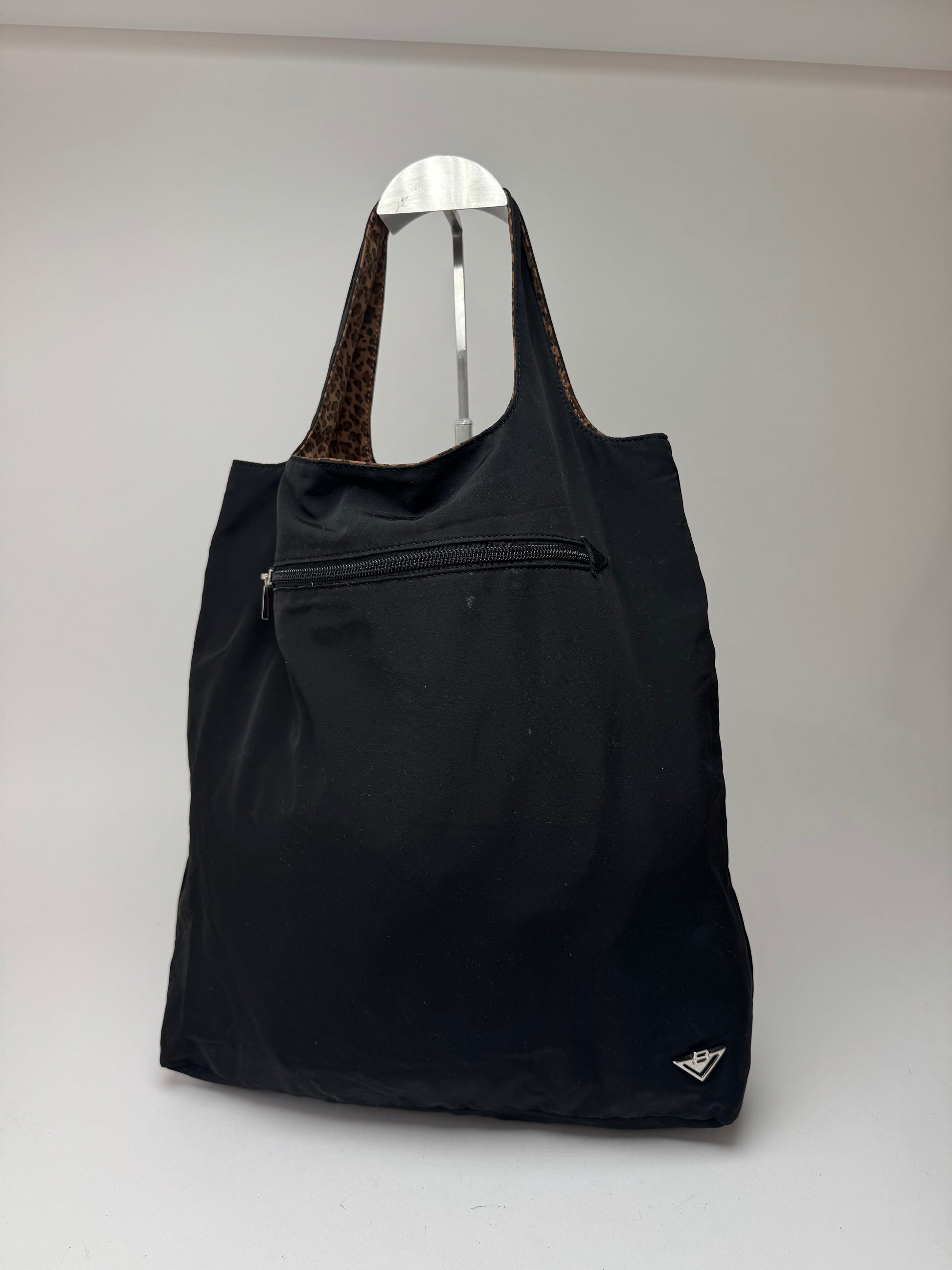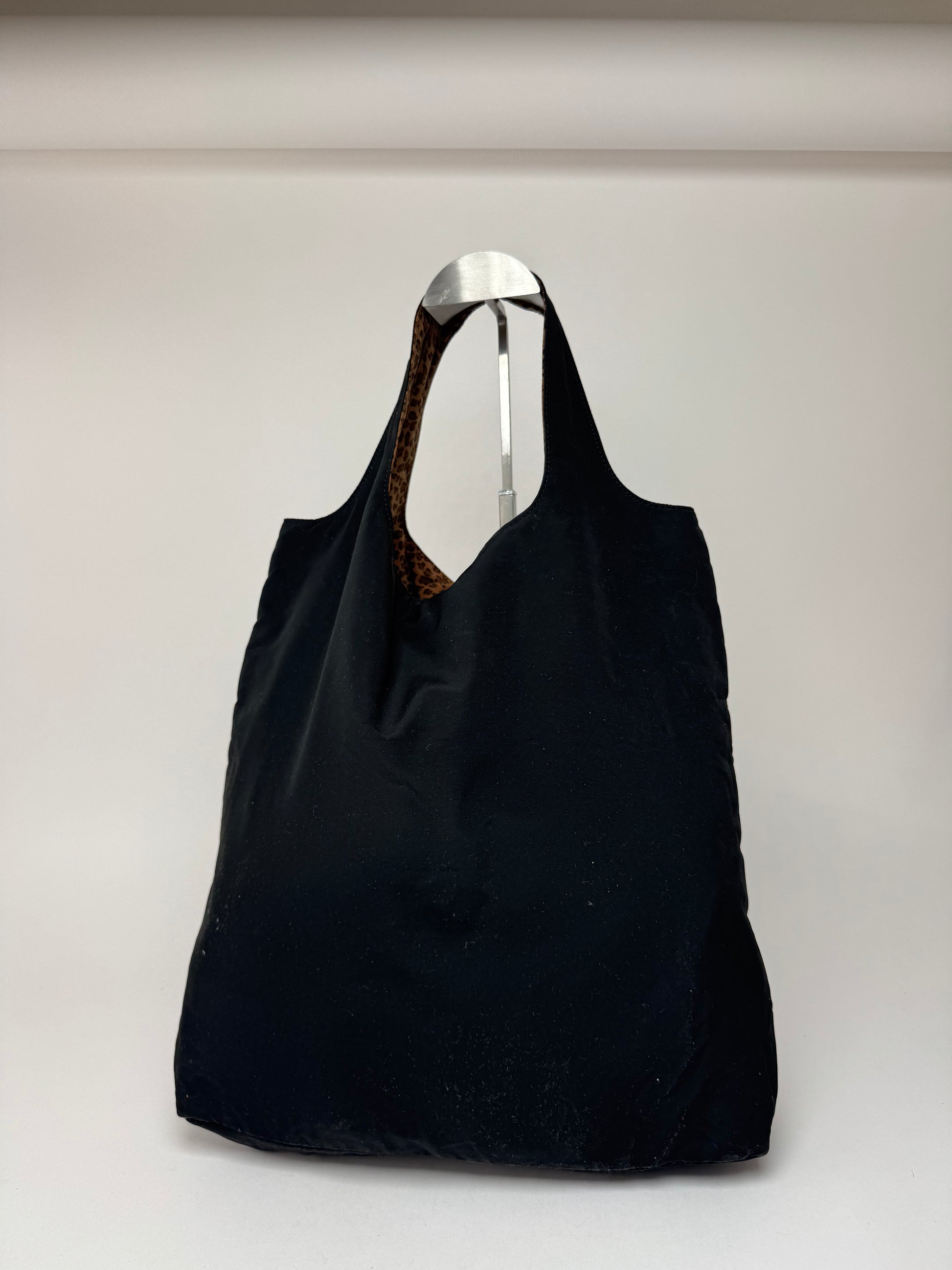 BOTTEGA VENETA Vintage Reversible Tote Bag. This versatile vintage tote features a reversible design with one side in black polyester and the other in brown leopard print. Finished with silver-tone steel hardware. Made in Italy.