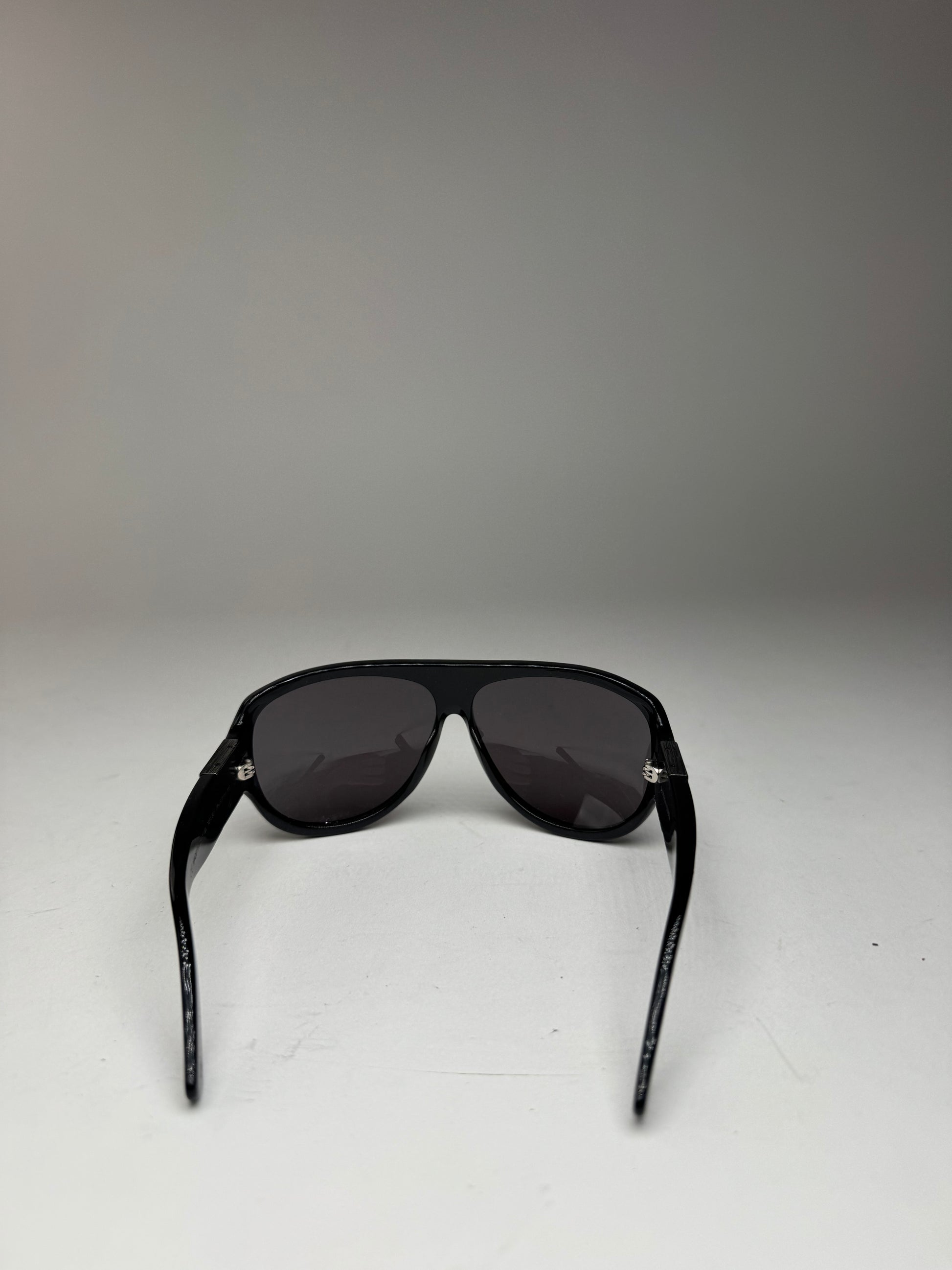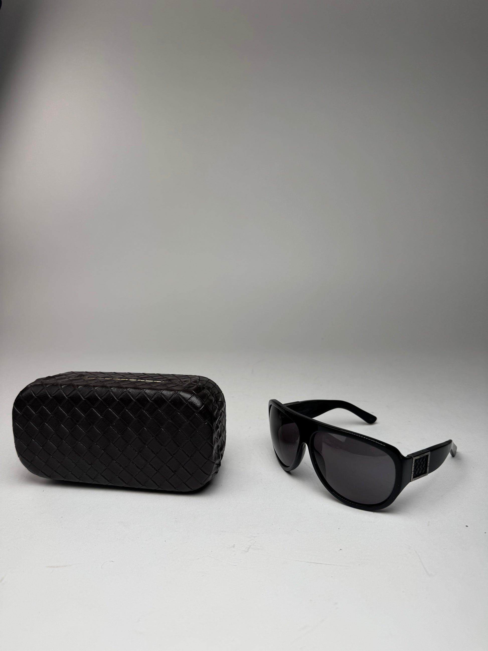 BOTTEGA VENETA Vintage Intrecciato Aviator Sunglasses. These unisex aviator-style sunglasses feature dark-tinted lenses and a black acetate frame. The temples are accented with black Intrecciato leather inlays, framed by silver-tone steel. Intrecciato, Bottega Veneta’s iconic woven leather technique, was developed in the 1960s to reinforce fine leather and has since become a hallmark of the brand’s refined craftsmanship and understated luxury. Made in Italy.
