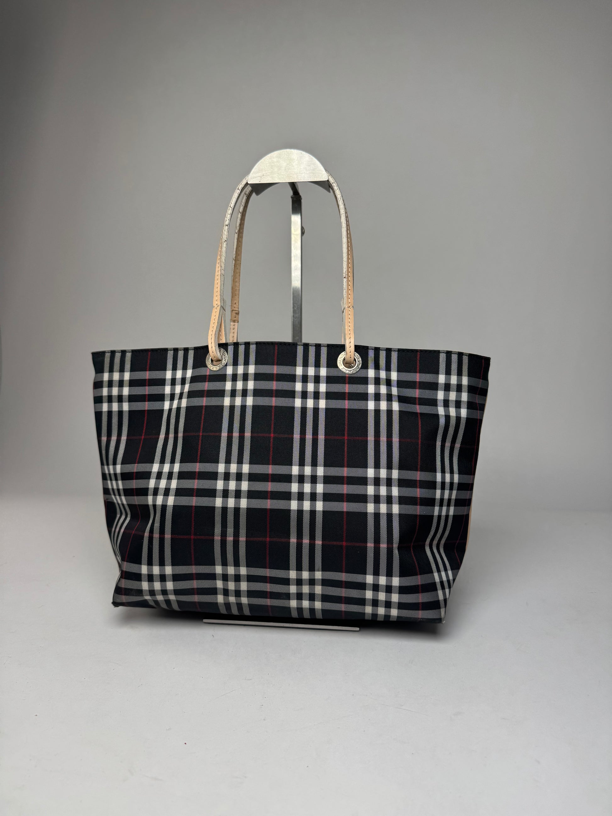 BURBERRY Vintage Nova Check Tote Bag. This timeless tote is finely crafted of Burberry signature Nova Check canvas in white, red and black. Burberry was founded in 1856 and is renowned for its iconic check pattern and heritage craftsmanship. The bag features beige leather top handles and trim, silver-tone steel hardware, and an open top for easy access. The interior opens to a spacious black polyester lining.