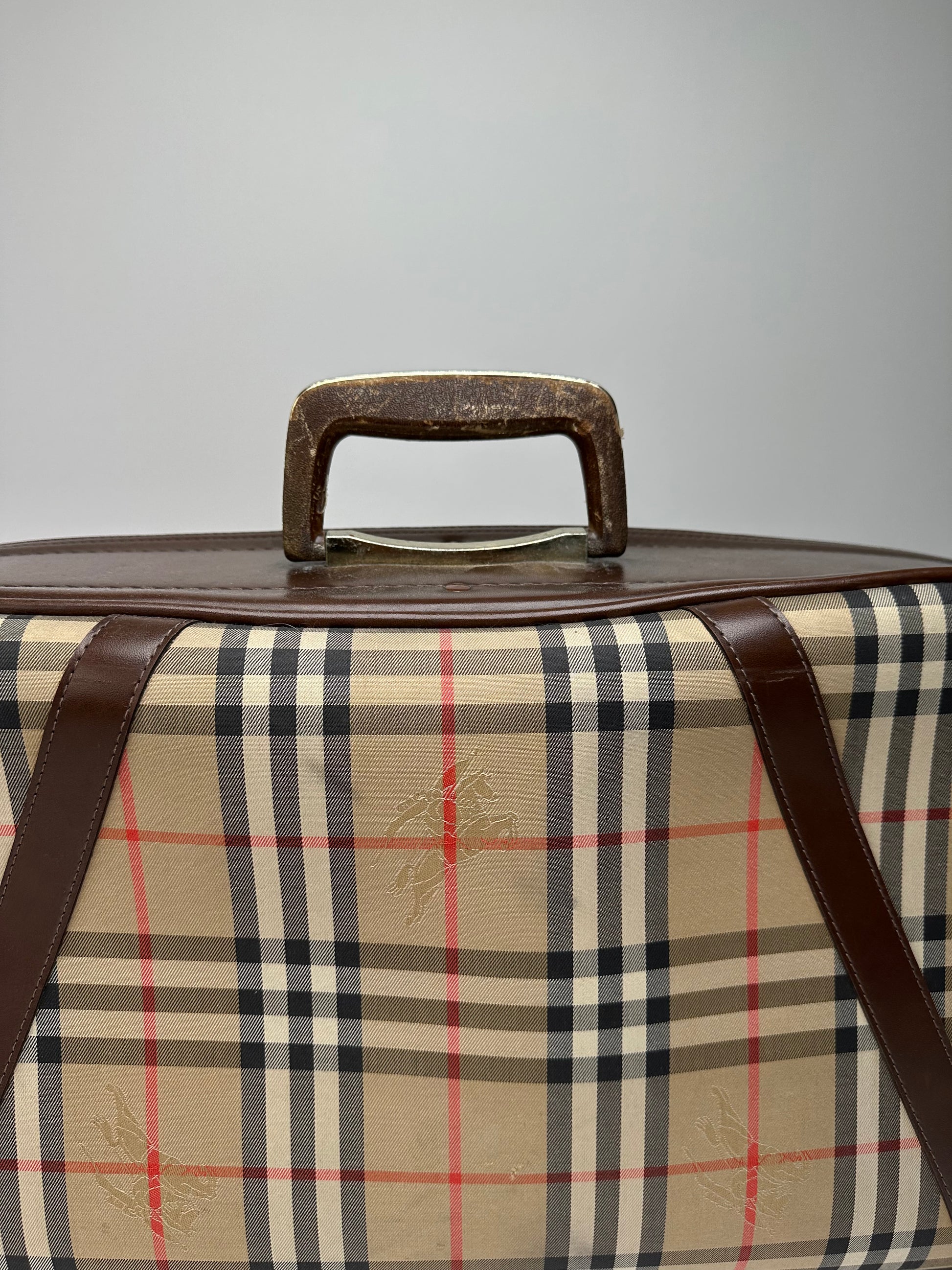 BURBERRY Vintage Travel Bag. This distinctive travel bag is crafted of canvas in the iconic Novacheck pattern with brown leather trimming. The bag features the Burberry Equestrian Knight logo on the front and is constructed in a structured suitcase-inspired silhouette with top handles positioned over a frame-style body. The interior is lined in black leather. The Novacheck pattern was introduced in the 1920s as a trench coat lining and has since become one of Burberry’s most recognizable house signatures, symbolizing British heritage and timeless style.