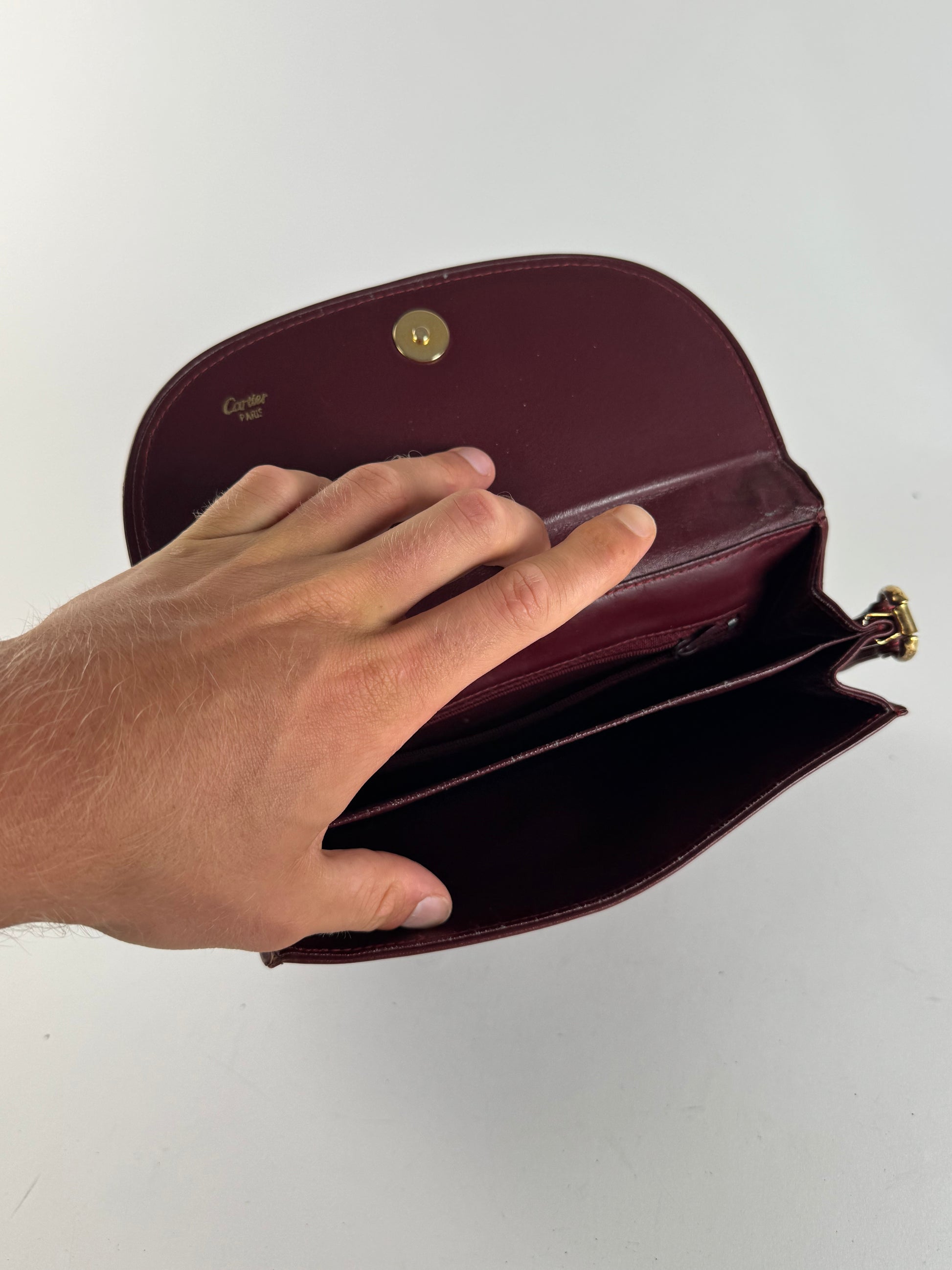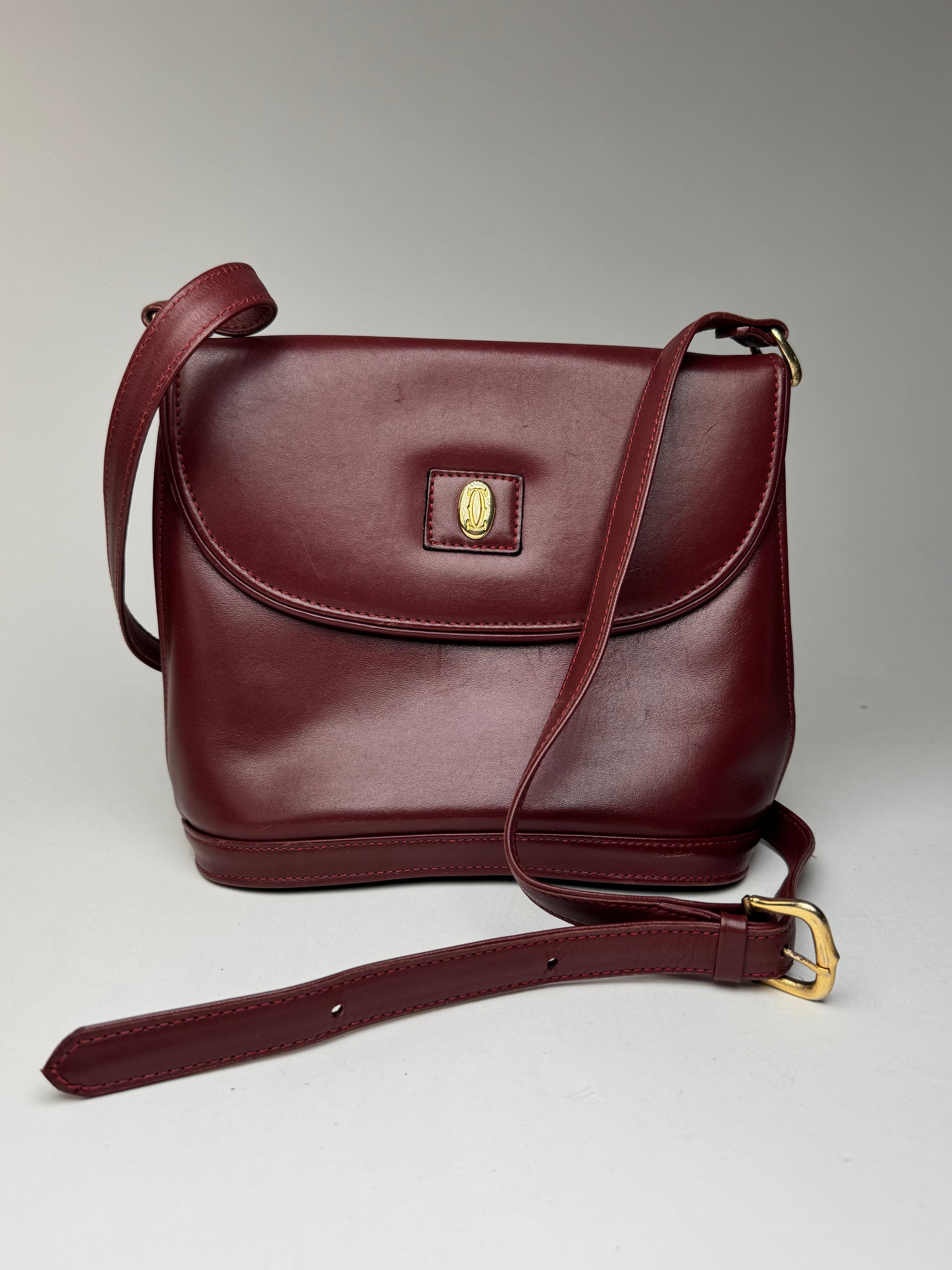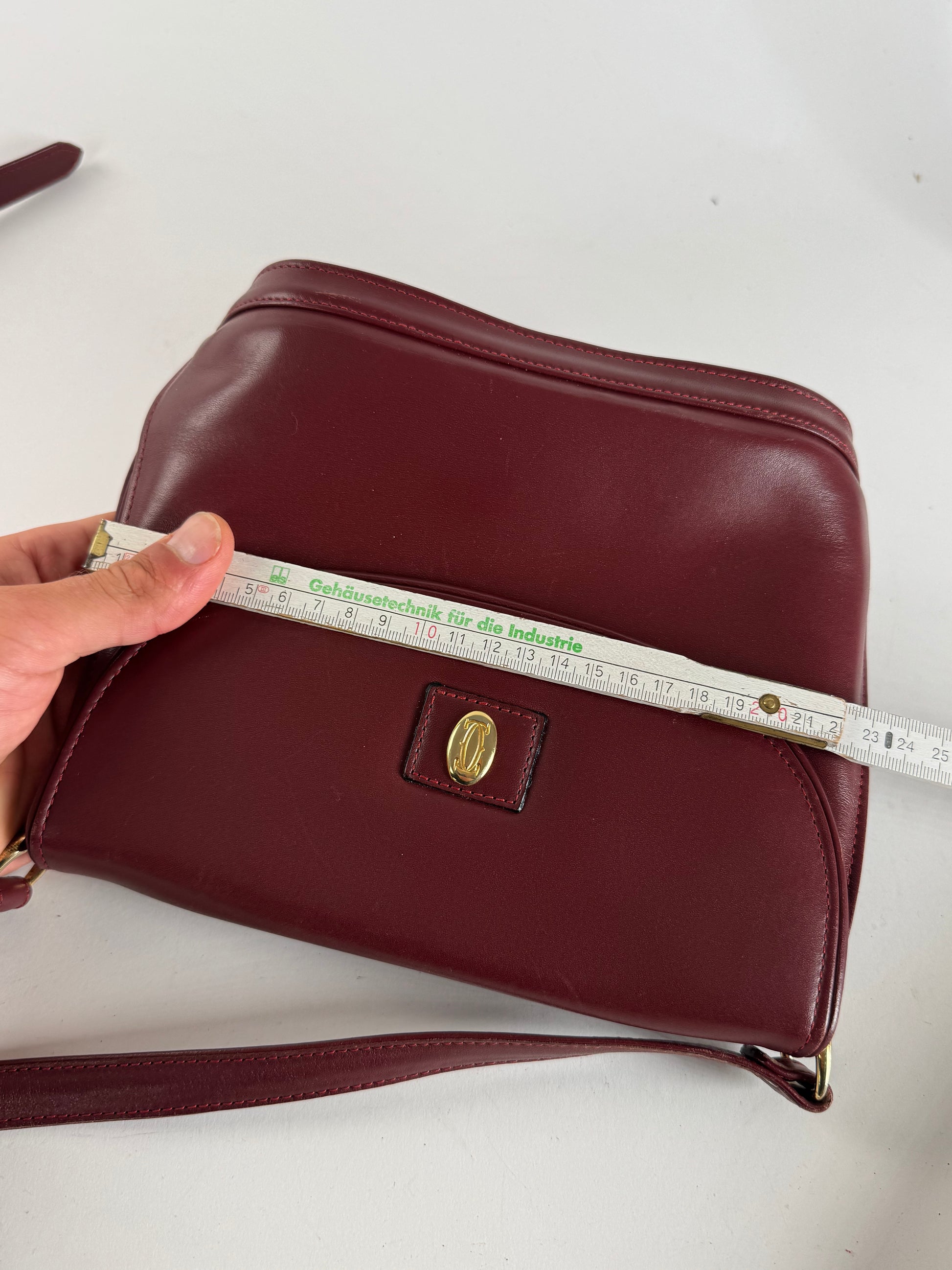 This chic handbag is finely crafted of burgundy leather. The front features the iconic double C Cartier logo in gold-tone steel—a design first introduced in the 1970s that has since become a symbol of timeless elegance and refined French luxury. The bag has a magnetic flap closure and an adjustable leather shoulder strap.