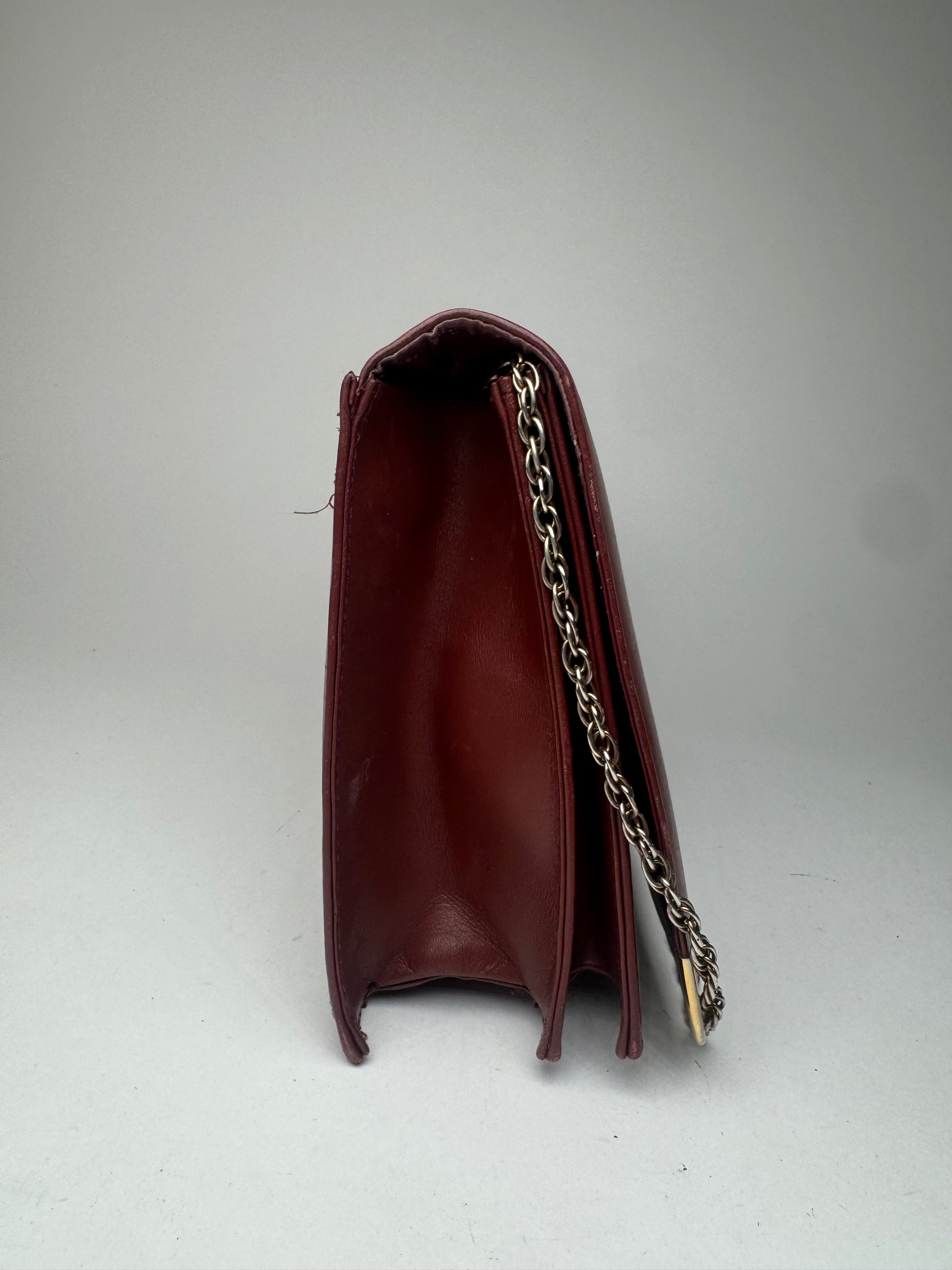 CARTIER Must de Cartier Leather Shoulder Bag. This vintage handbag is crafted from deep burgundy leather and features the iconic Cartier logo embossed on the front — a hallmark of the "Must de Cartier" line, introduced in the 1970s to bring the house’s timeless elegance into everyday luxury accessories. The piece is detailed with gold-tone hardware on the bottom corners and has a silver-tone steel chain strap. It closes with a magnetic snap and is lined with matching burgundy leather.