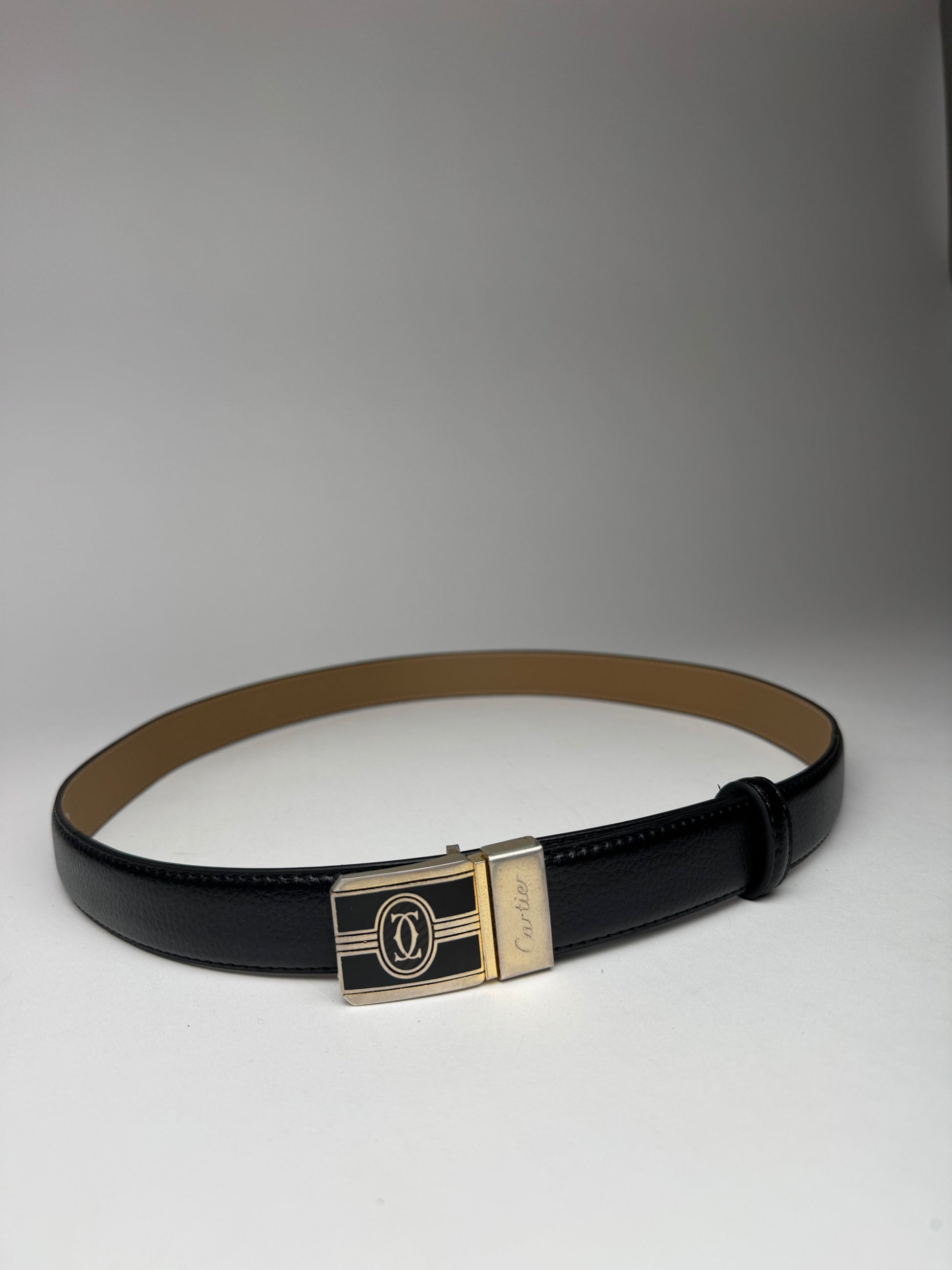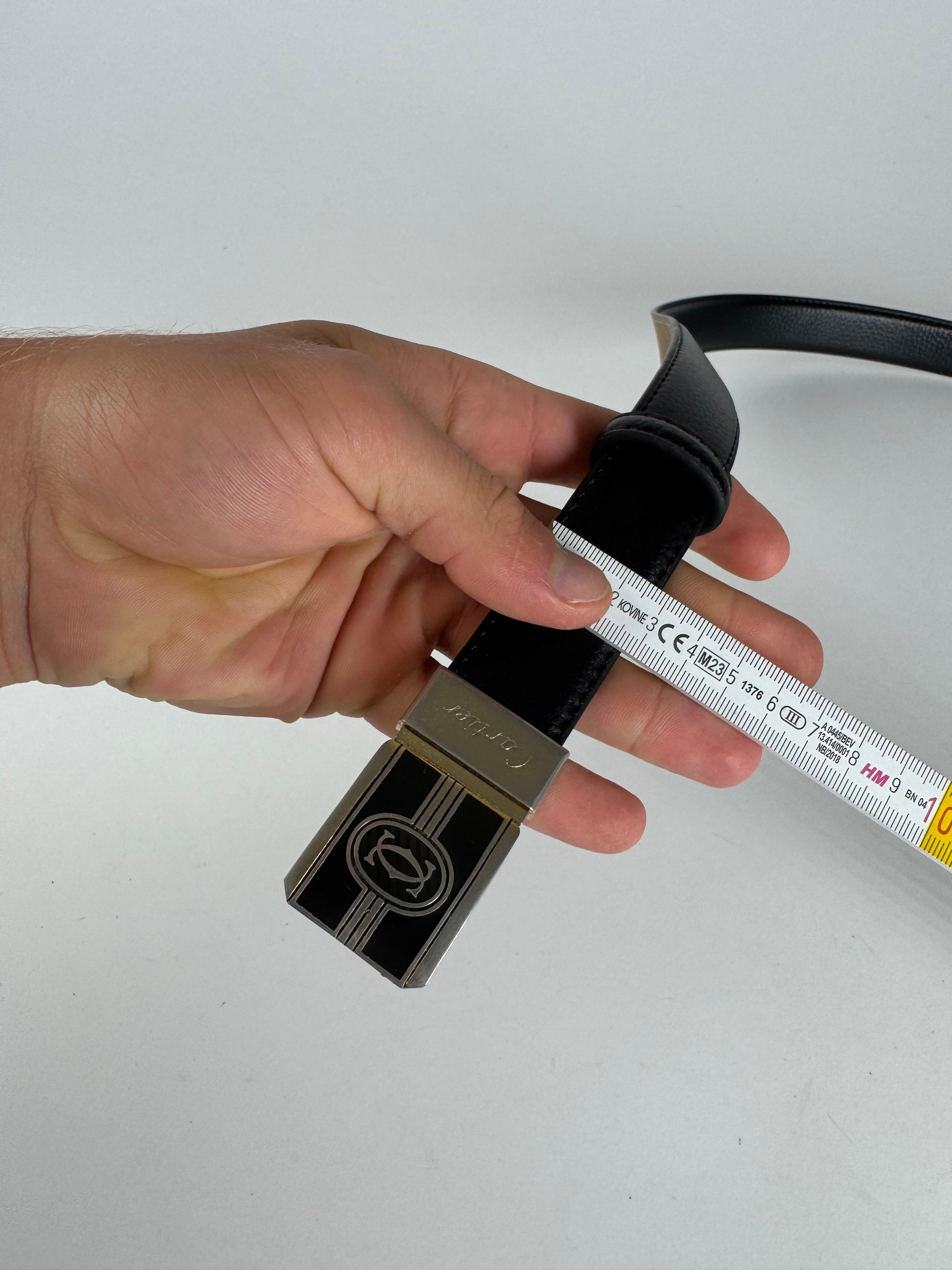 This chic belt features a silver-tone steel buckle with partial black coating and the Cartier logo engraved on the front. The buckle is original, while the black leather strap with beige interior is a later replacement and not by Cartier.