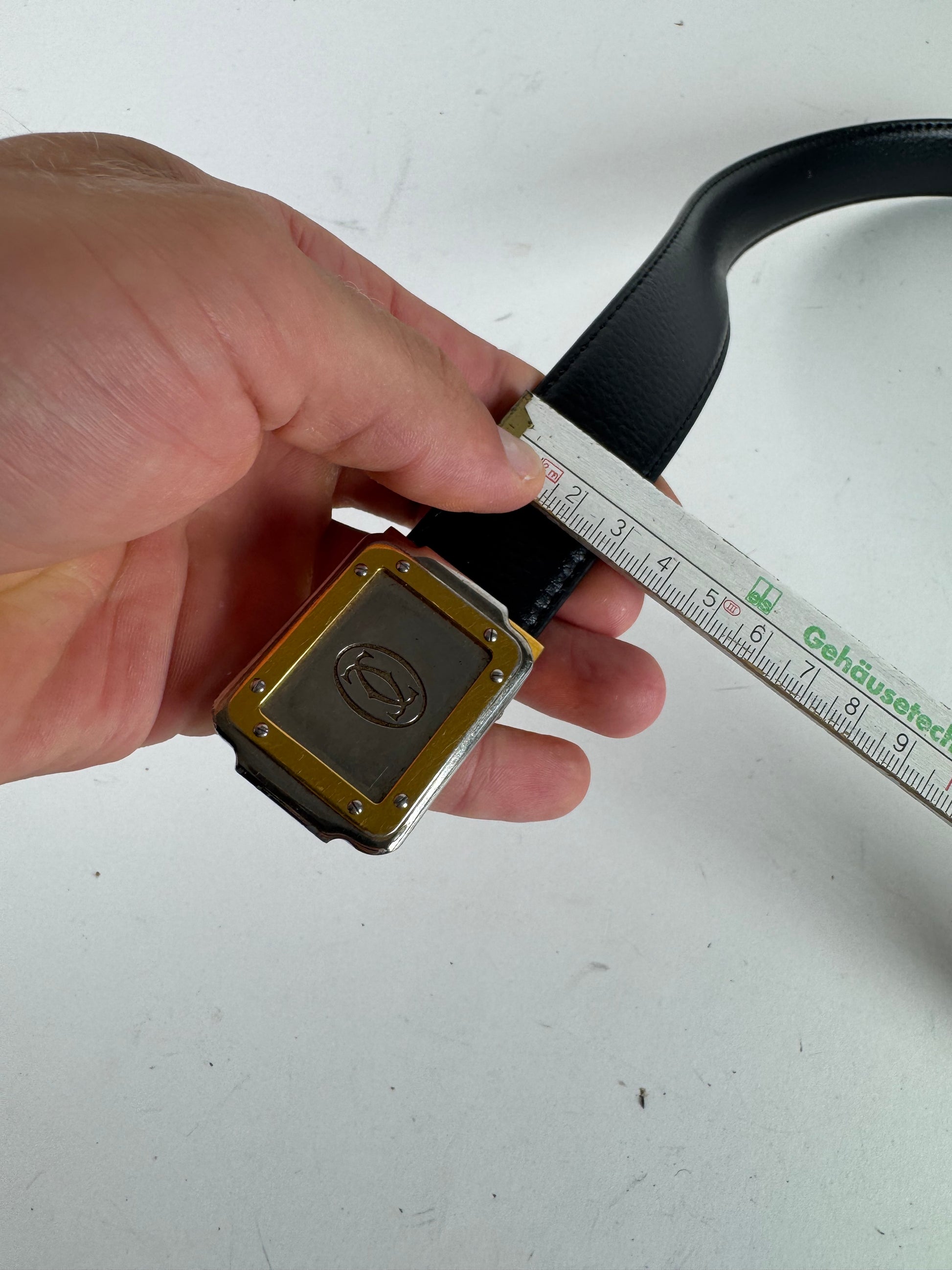 This vintage belt features the original silver- and gold-tone steel buckle engraved with the Cartier logo—an emblem of Parisian elegance and fine craftsmanship since 1847. The leather strap has been replaced and is not the original Cartier piece. It is crafted in black leather with a beige leather lining.