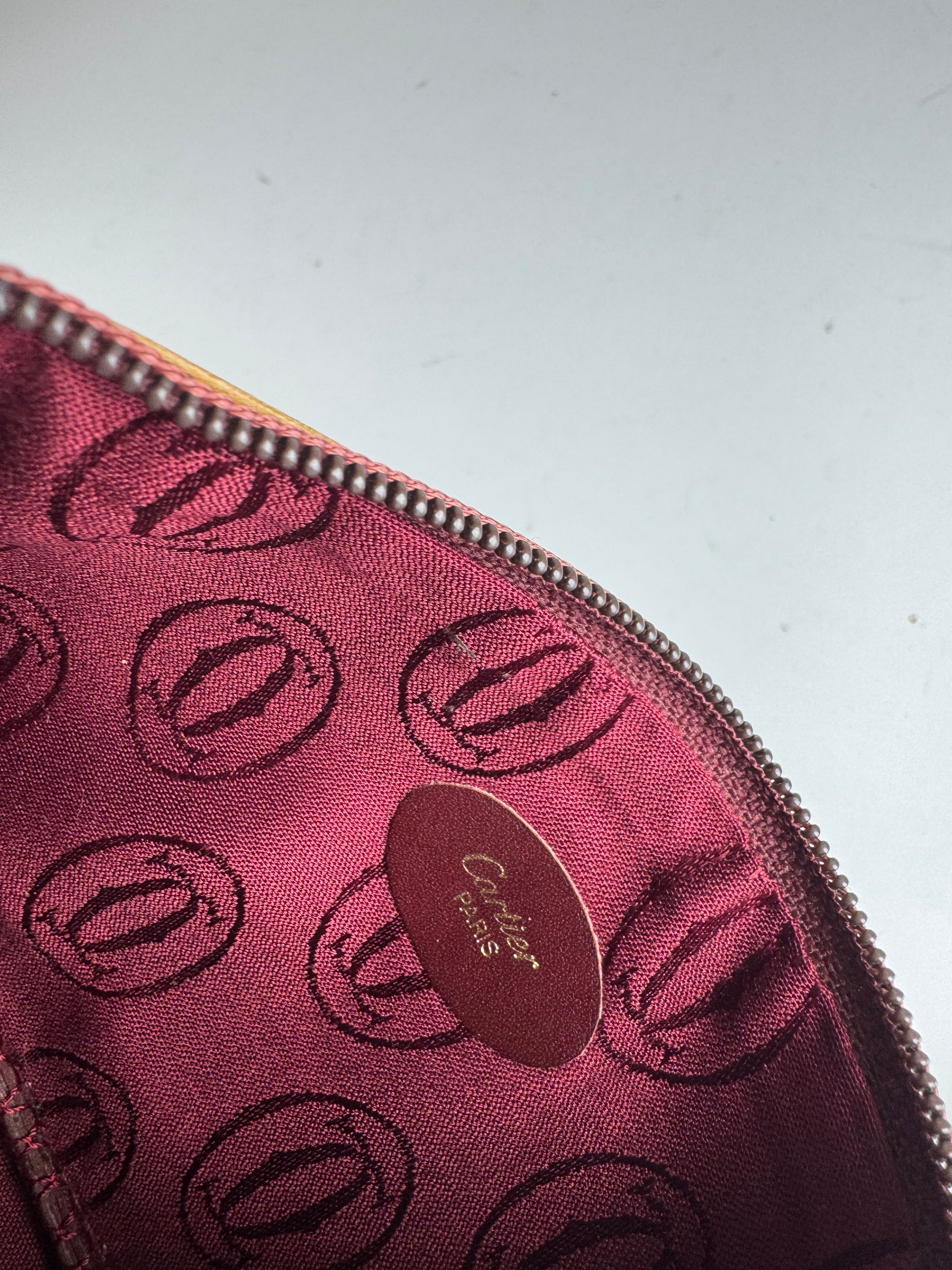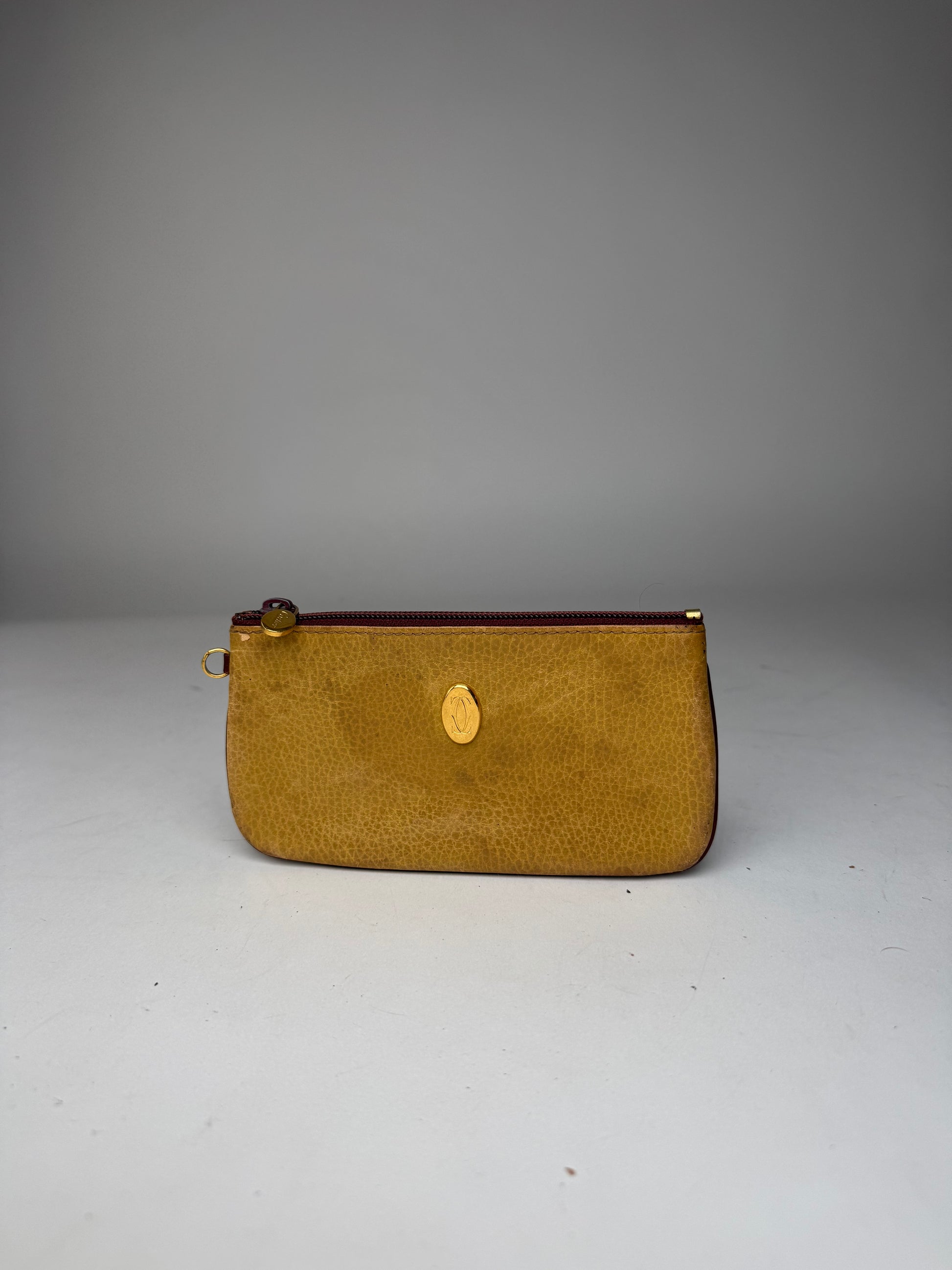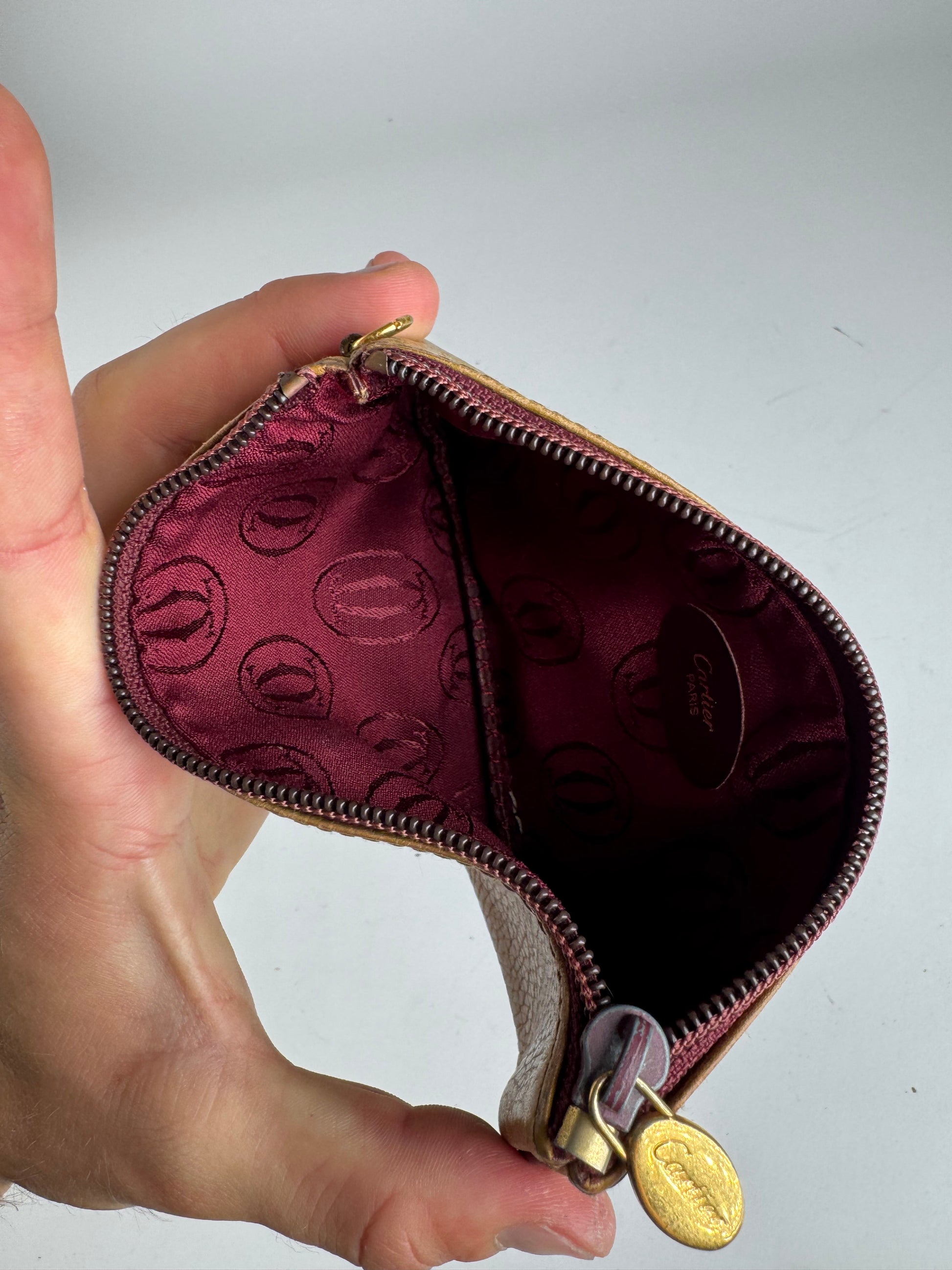 This elegant vintage card holder is finely crafted of yellow snakeskin-effect leather. The front is adorned with the Cartier logo in gold-tone steel. First designed in the early 20th century, the Cartier logo has become an enduring emblem of the house’s timeless refinement and luxury. The piece features a top zipper closure and opens to a lilac polyester interior with Cartier logo monogram.