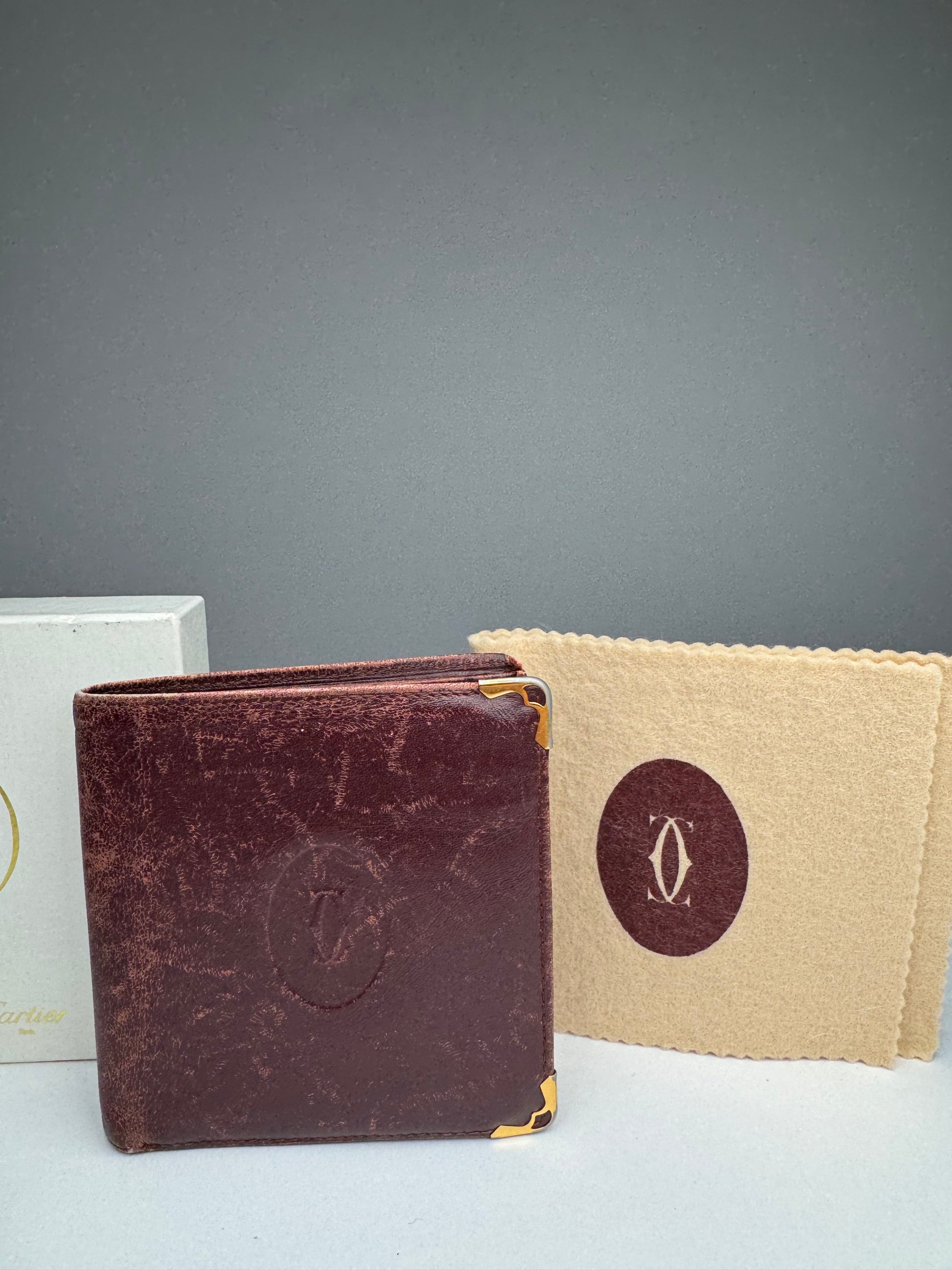 This elegant vintage wallet is finely crafted from burgundy leather. The flap design adds a classic touch to this timeless accessory. Despite visible scratches, the overall condition remains good. A unisex piece, it comes complete with its original Cartier box, dust bag, and authentication card.