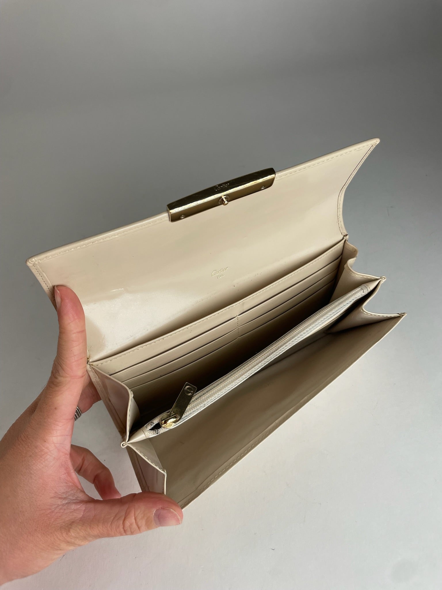 CARTIER Vintage Wallet. This elegant vintage wallet is crafted of smooth white structured leather and features a gold-tone decorative appliqué above the snap button closure on the front. The wallet offers compartments for cards, banknotes, and coins. Likely made in France.