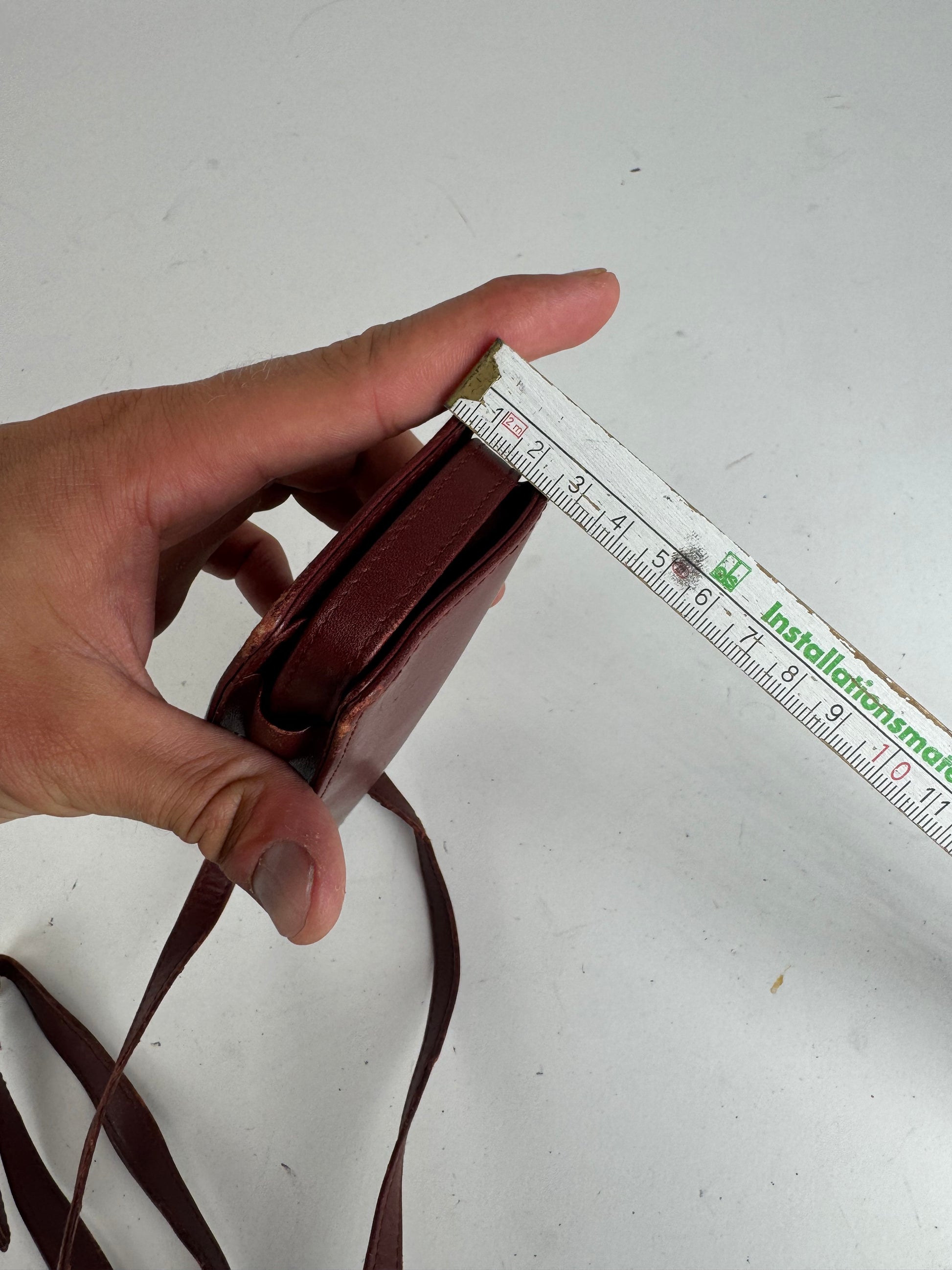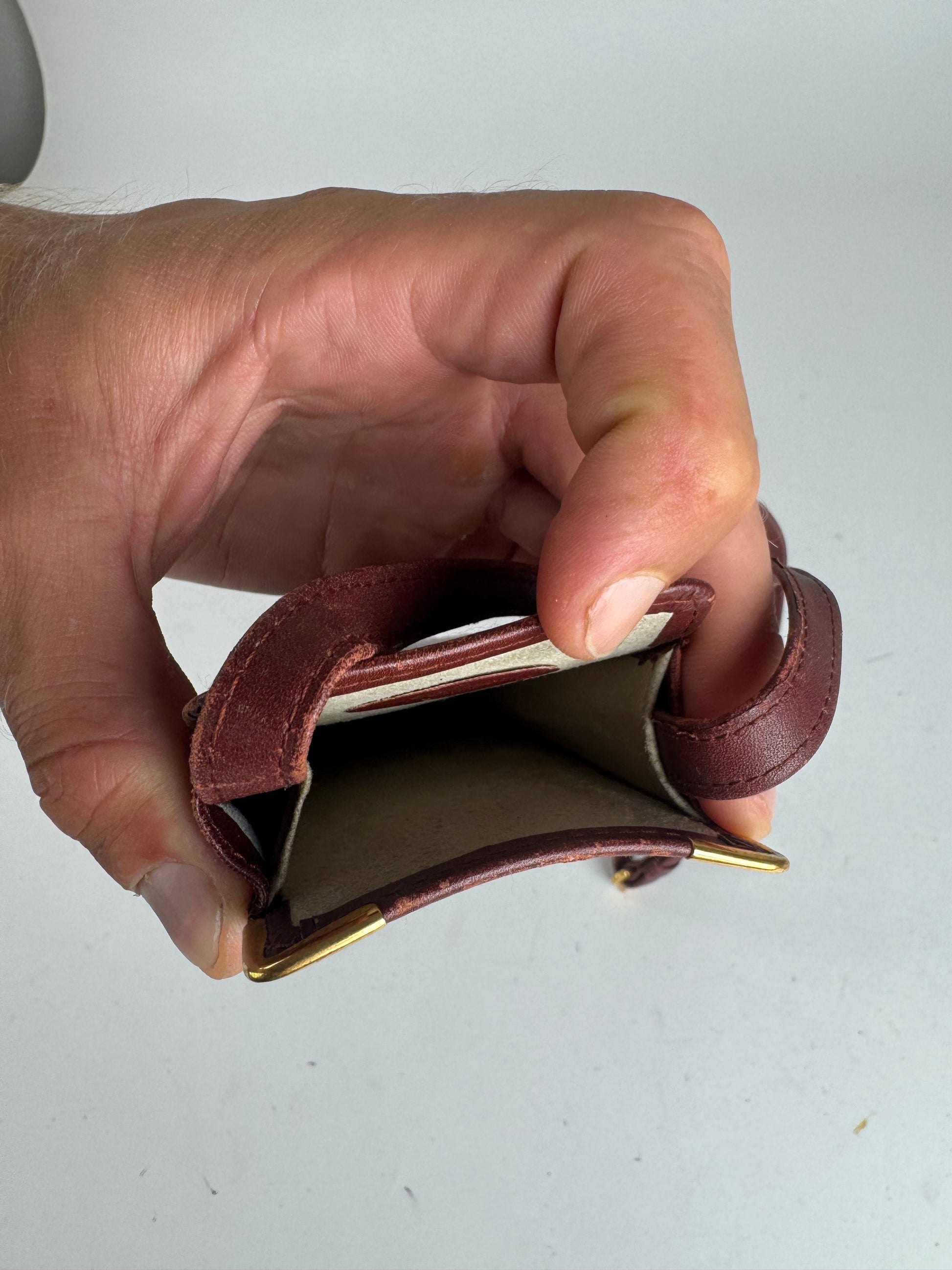CARTIER Vintage Bordeaux Leather Mini Shoulder Bag. This elegant mini shoulder bag is finely crafted of bordeaux leather with the Cartier logo embossed on the front. The bag features gold-tone steel hardware and an adjustable shoulder strap. The interior is lined in beige felt-like material.