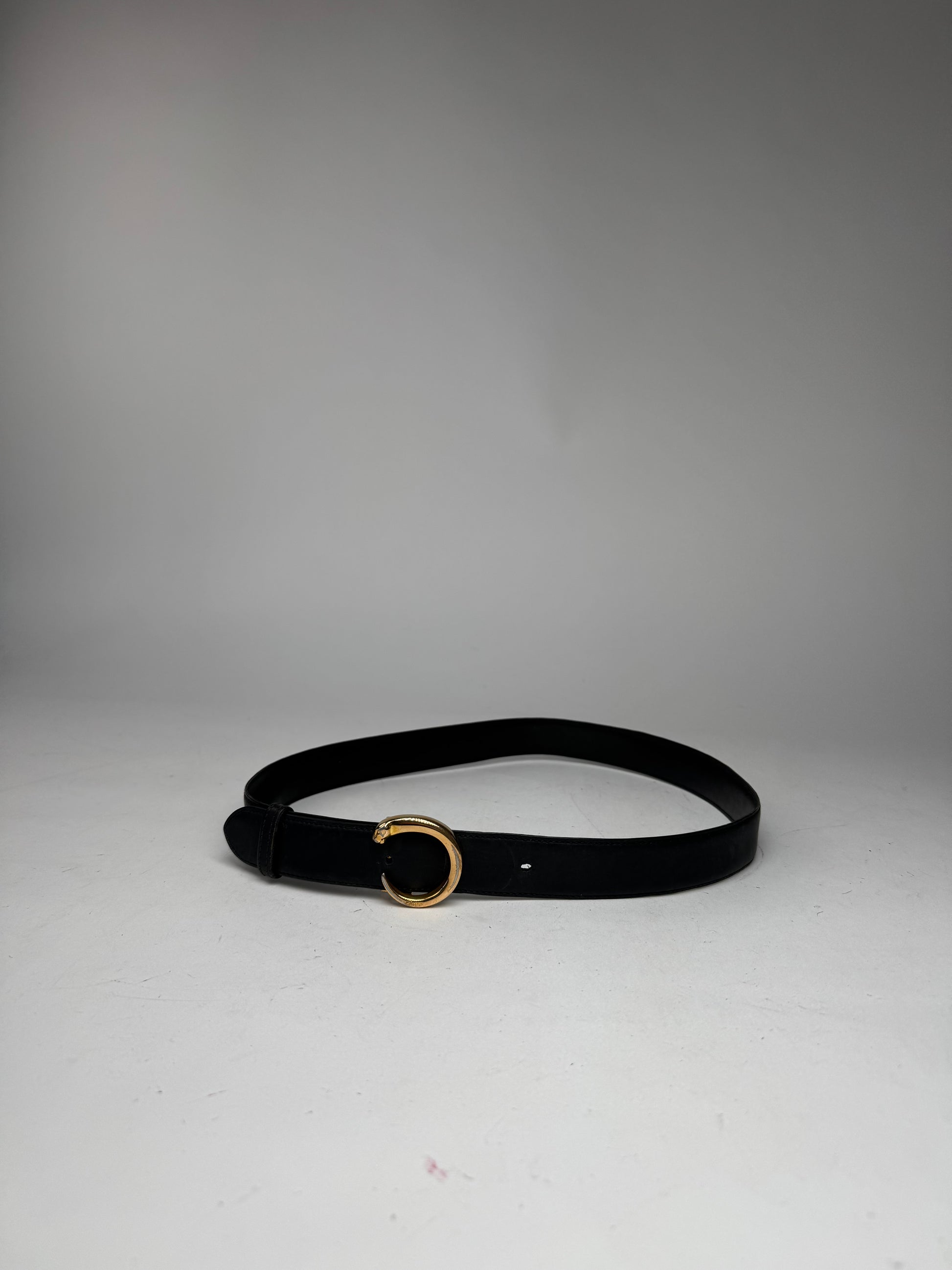 CARTIER Vintage Panthère Belt. This elegant vintage belt is crafted from black leather and features the iconic Panthère logo as a gold-tone steel buckle, embodying Cartier’s timeless luxury.
