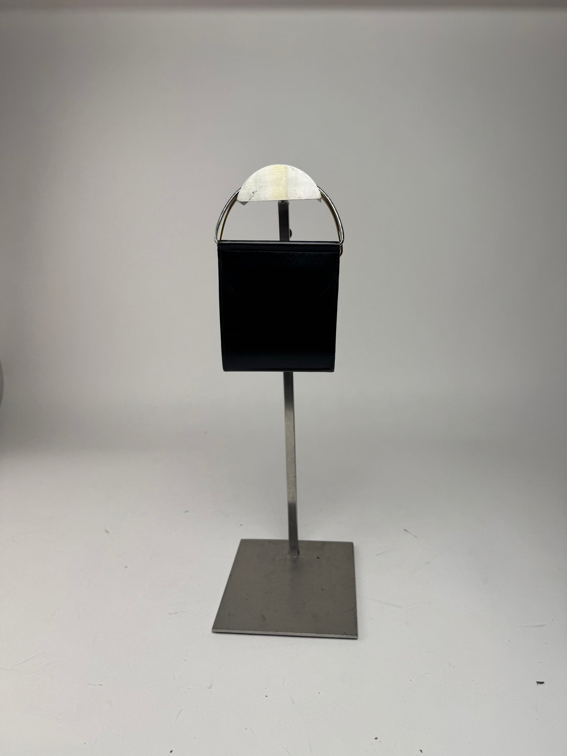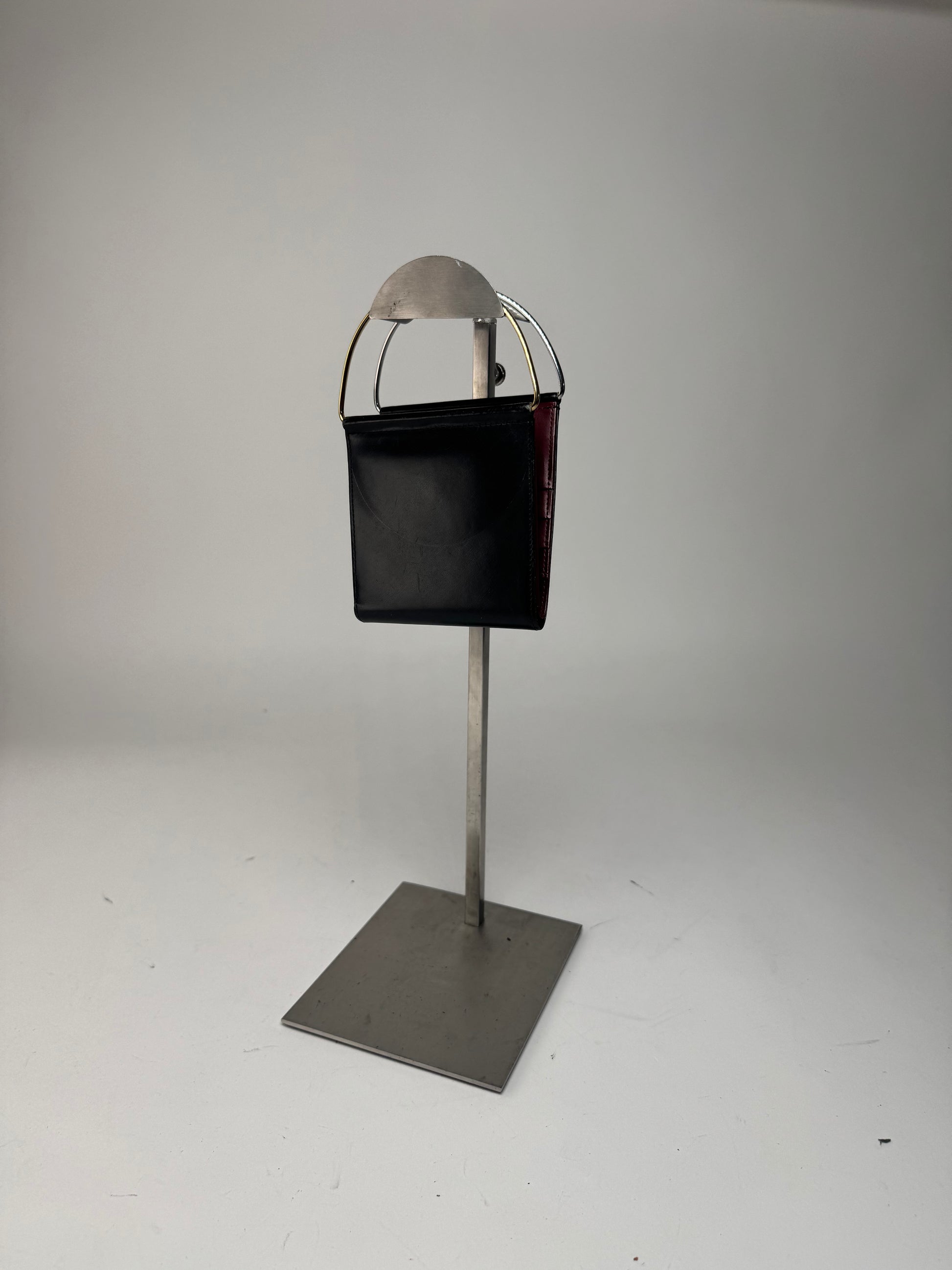 This elegant vintage piece is foldable and features dual steel half-ring handles in silver and gold tones. The interior is crafted in black and lilac leather, offering a refined contrast.