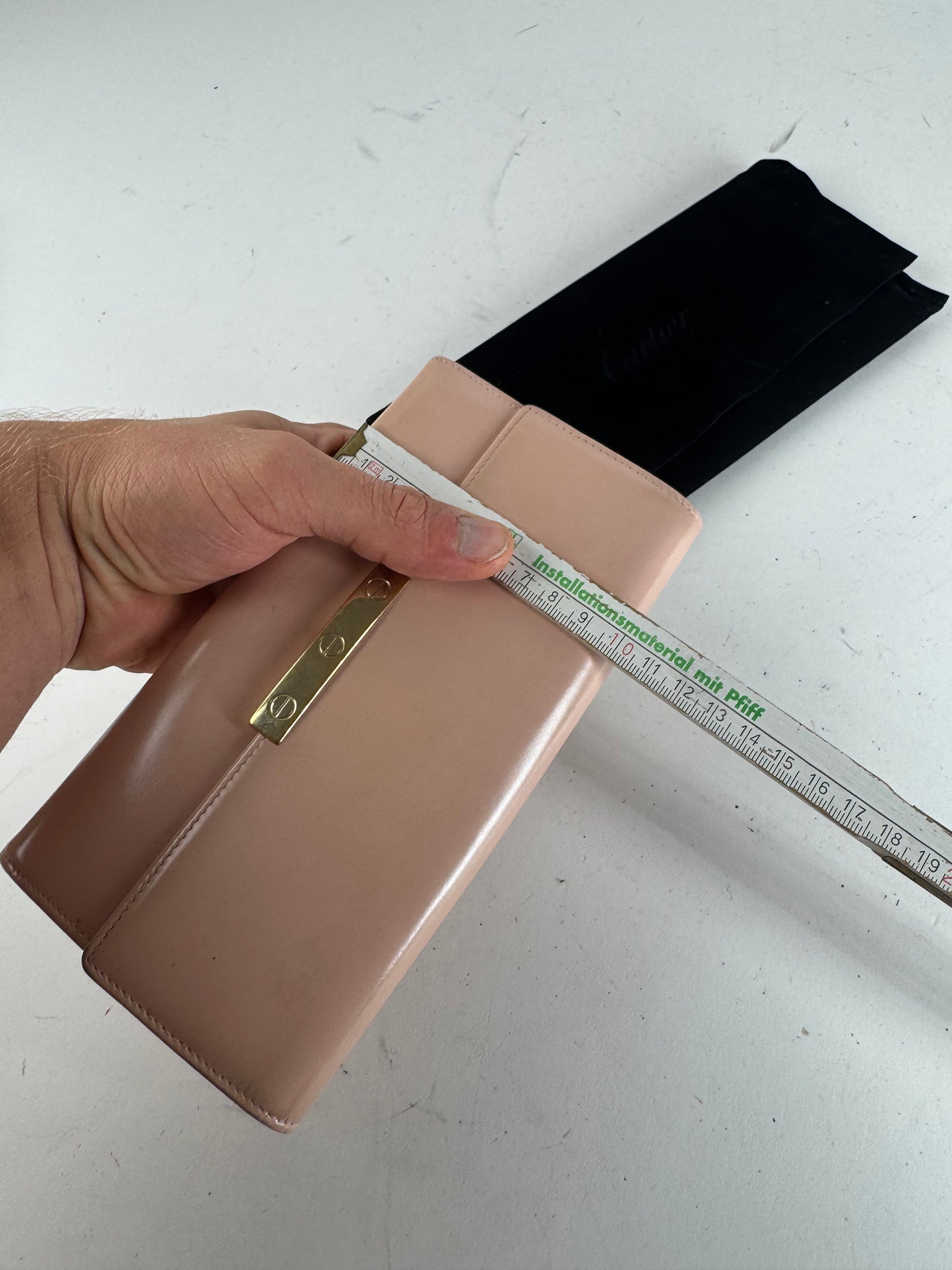 This elegant vintage wallet is finely crafted of pink patent leather. Cartier, founded in Paris in 1847, is renowned for its timeless elegance and exceptional craftsmanship across fine jewelry and luxury leather goods. The wallet features gold-tone steel hardware and a snap button closure.