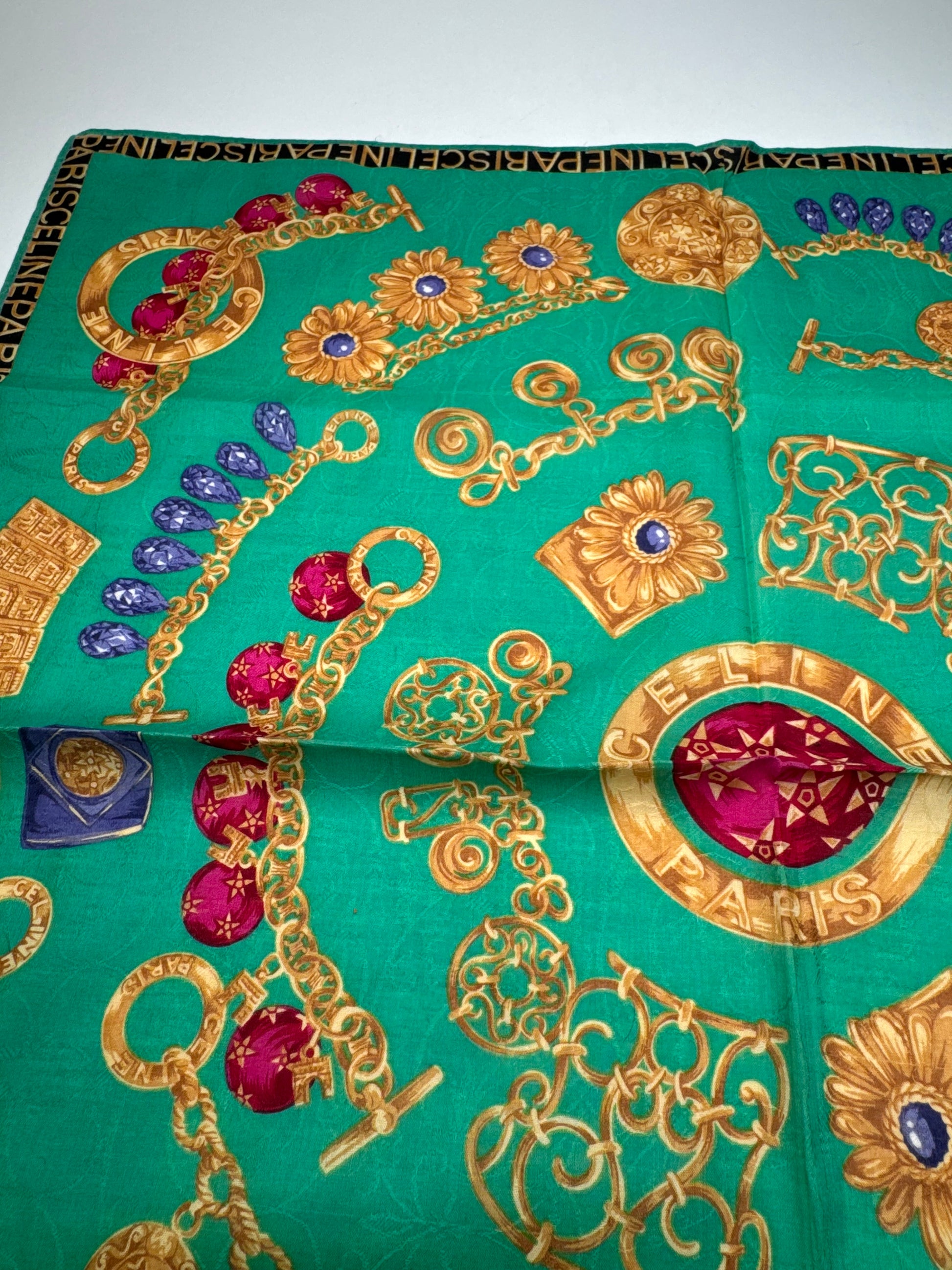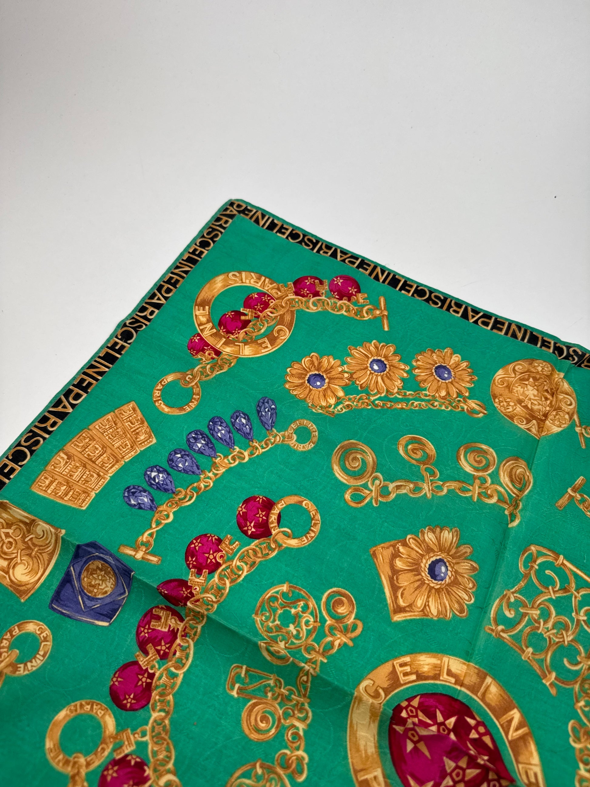 This chic accessory features a green base with gold-toned jewelry-inspired chains, rings, and decorative motifs. The black border is adorned with golden CELINE PARIS lettering.