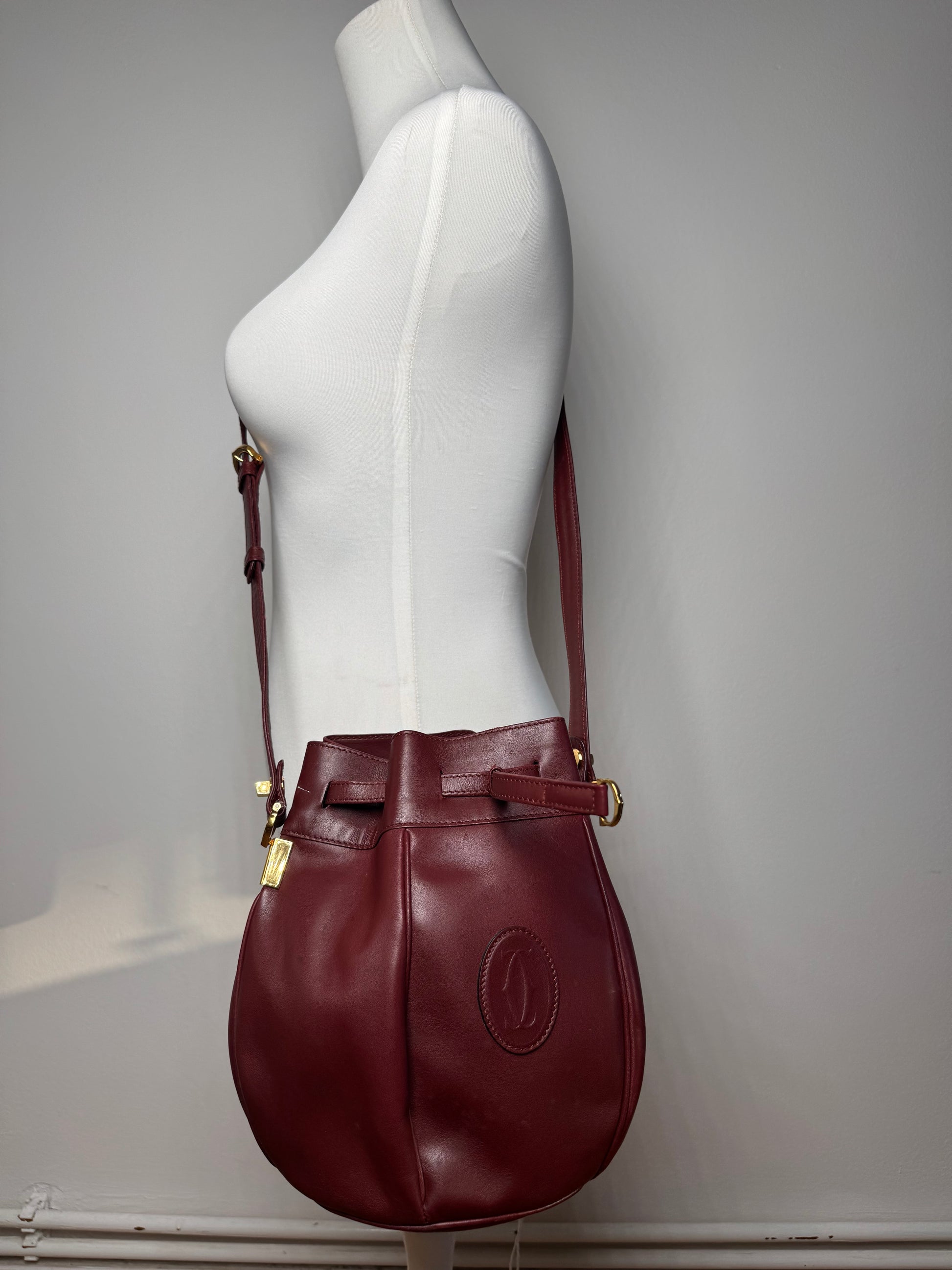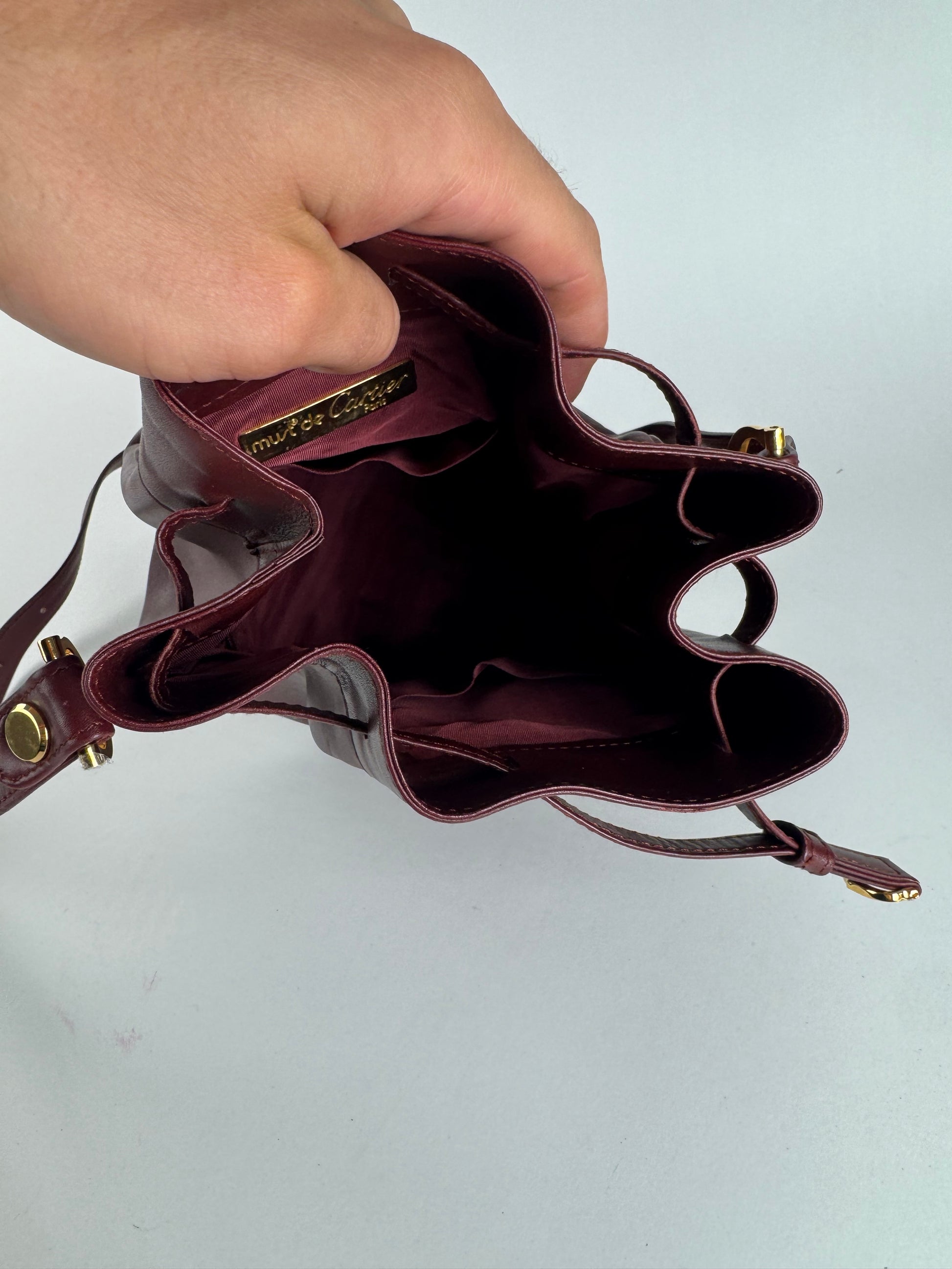 This elegant handbag is finely crafted of burgundy leather with a matching burgundy canvas lining. The bag features a drawstring closure, gold-tone steel hardware, and an adjustable shoulder strap. The iconic Cartier double C logo is embossed on the front—a timeless emblem introduced in the 1970s that reflects the house’s legacy of Parisian refinement and luxury craftsmanship.