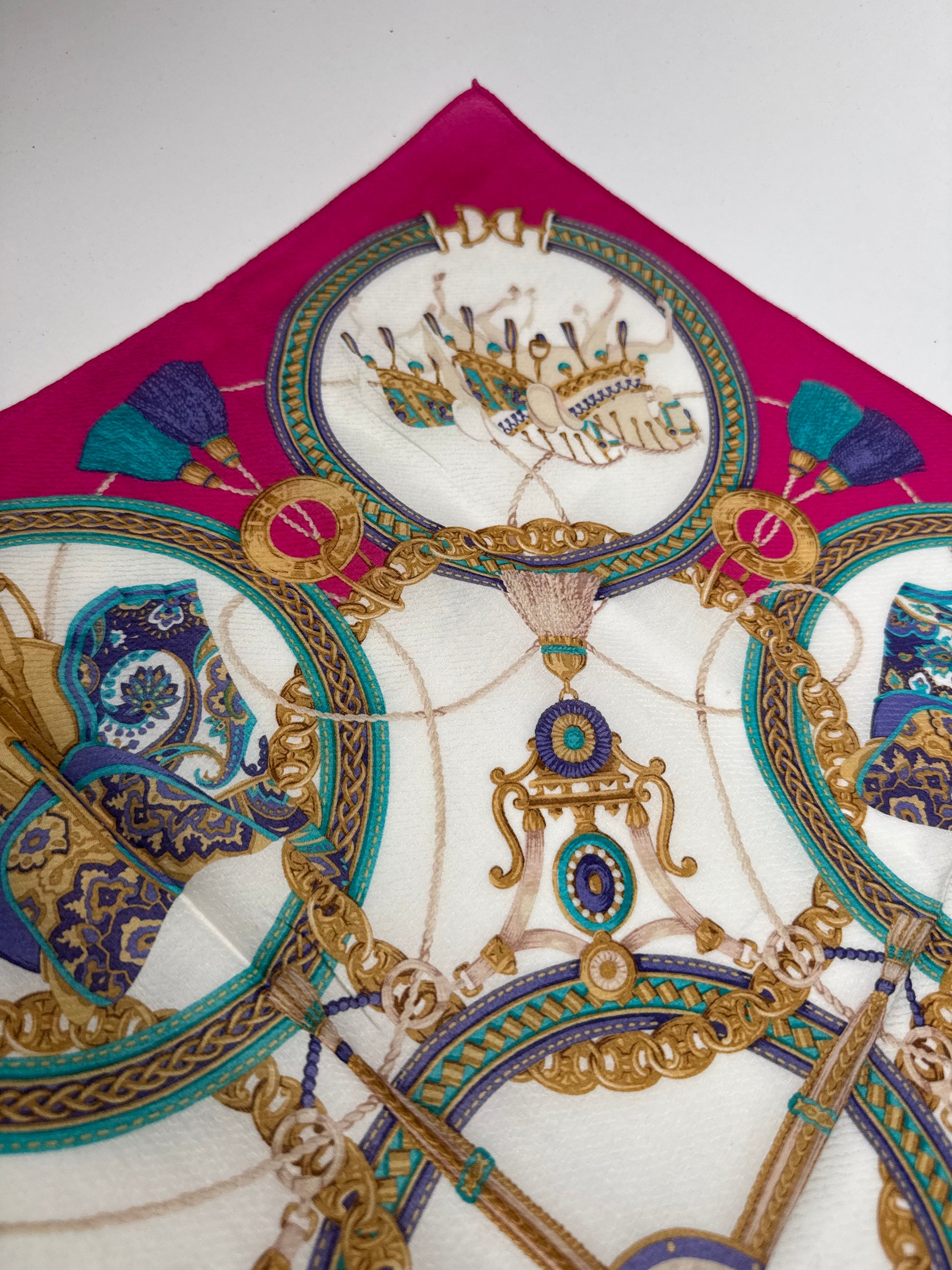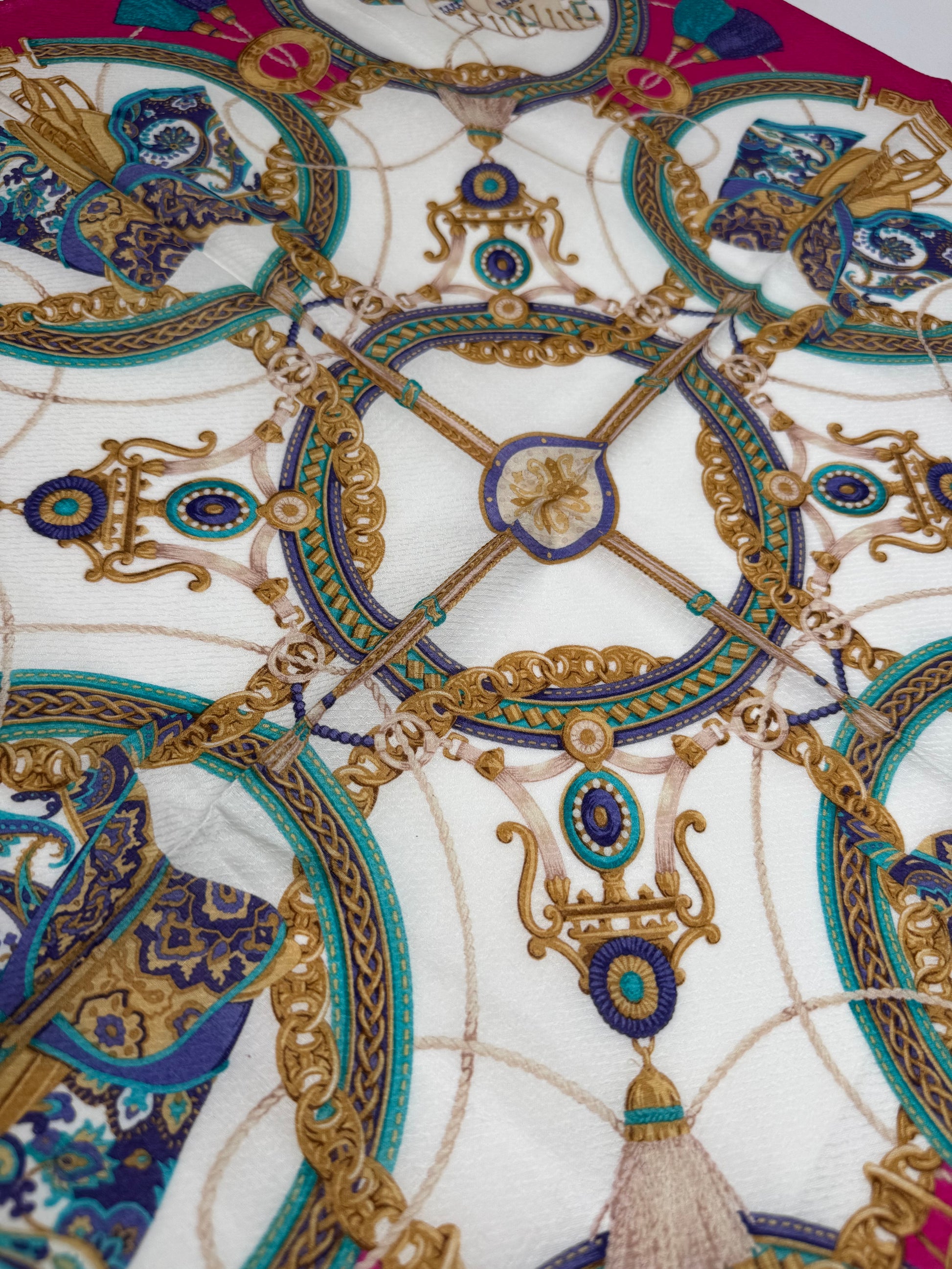 This vintage scarf is finely crafted of silk and canvas with a pink base, featuring ornate baroque-style motifs of carriages, saddles, and decorative jewelry. A luxurious and timeless accessory with Céline’s signature equestrian elegance.