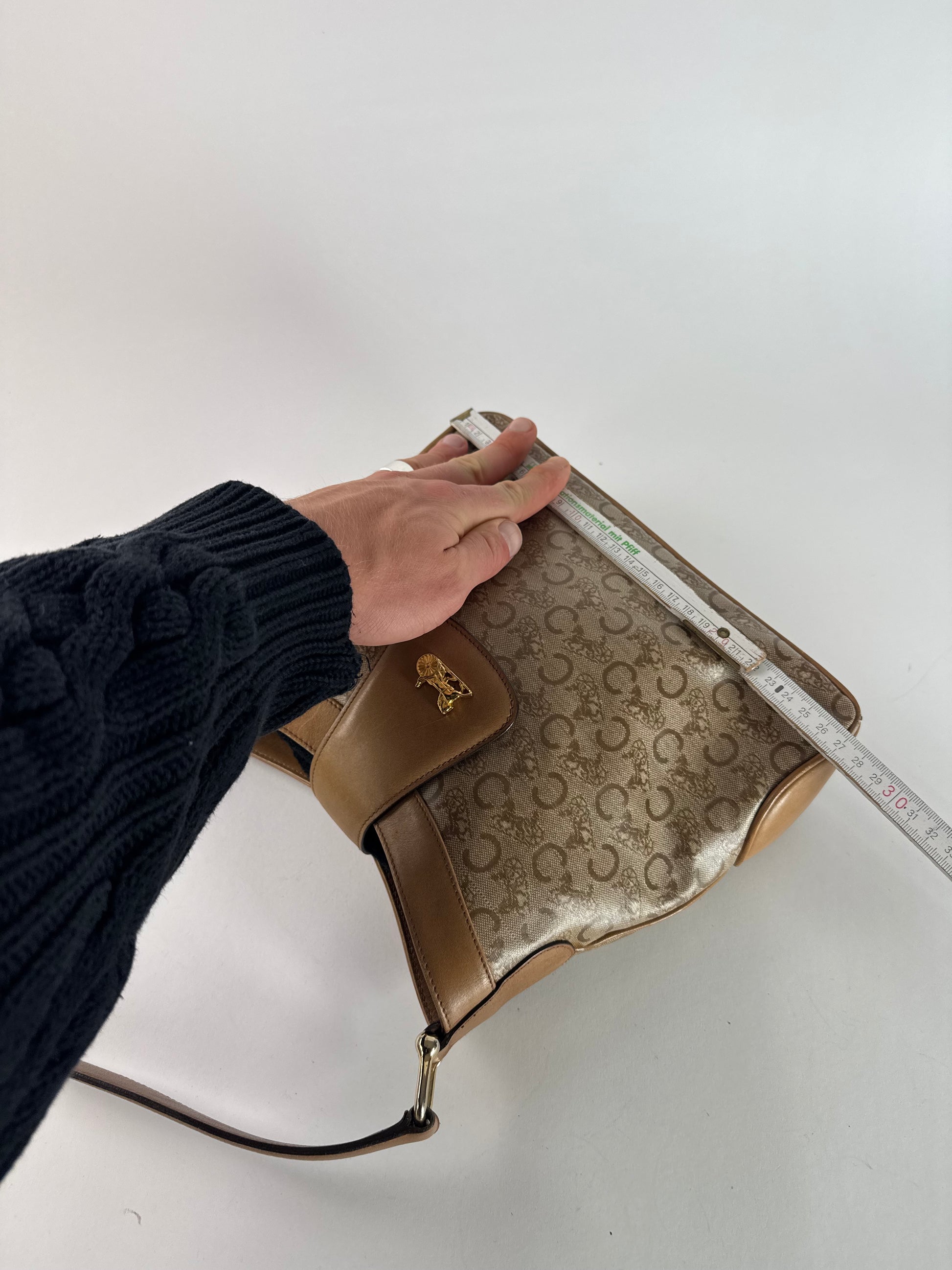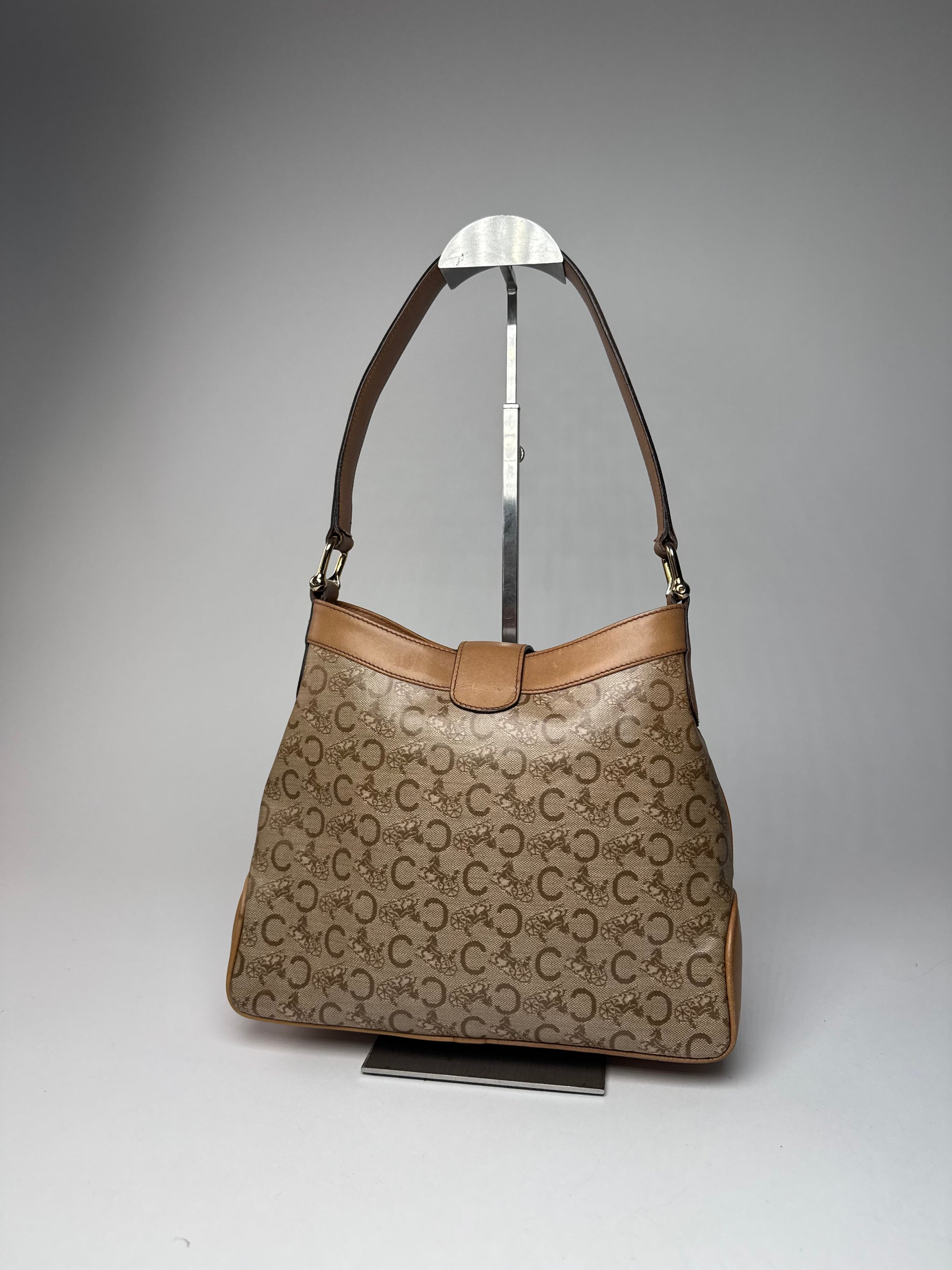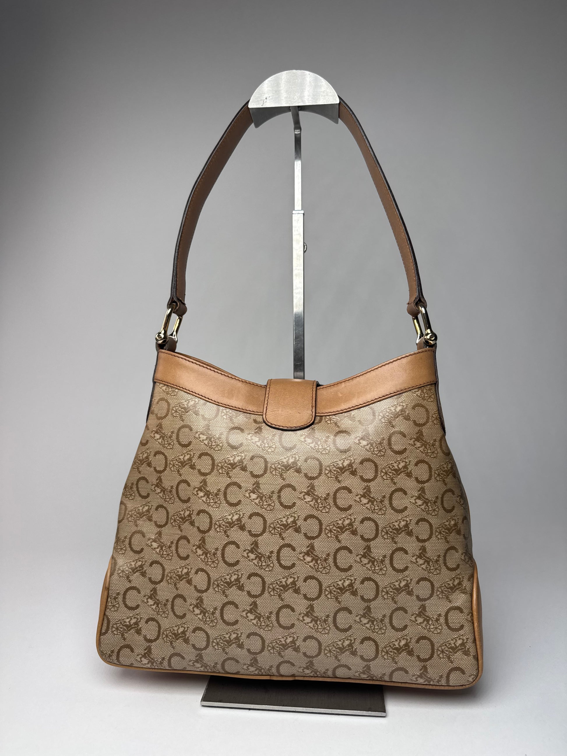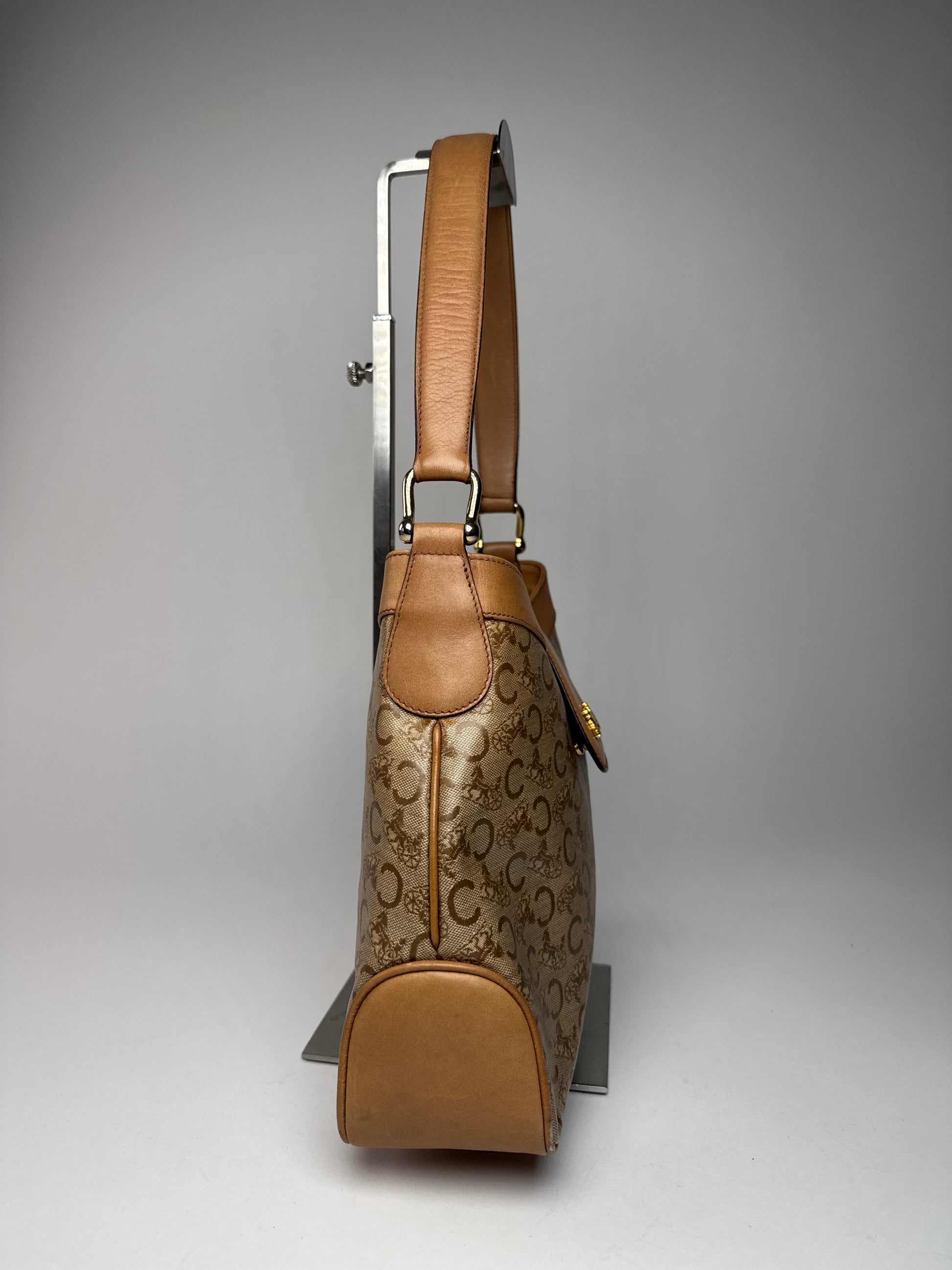 This chic vintage handbag is finely crafted from golden-brown leather featuring the iconic CELINE Triumph Carriage monogram. Introduced in the 1970s, the carriage motif became one of CELINE’s most recognisable emblems, symbolising Parisian elegance and the house’s heritage of refined leather craftsmanship. Additional elements are crafted from beige-brown leather, and the front is adorned with a gold-tone steel carriage logo. The bag features a single handle that can be worn over the shoulder or carried by hand. It closes with a snap-button fastening, and the interior is lined in beige leather. Made in Italy, likely from the 1980s or 1990s.