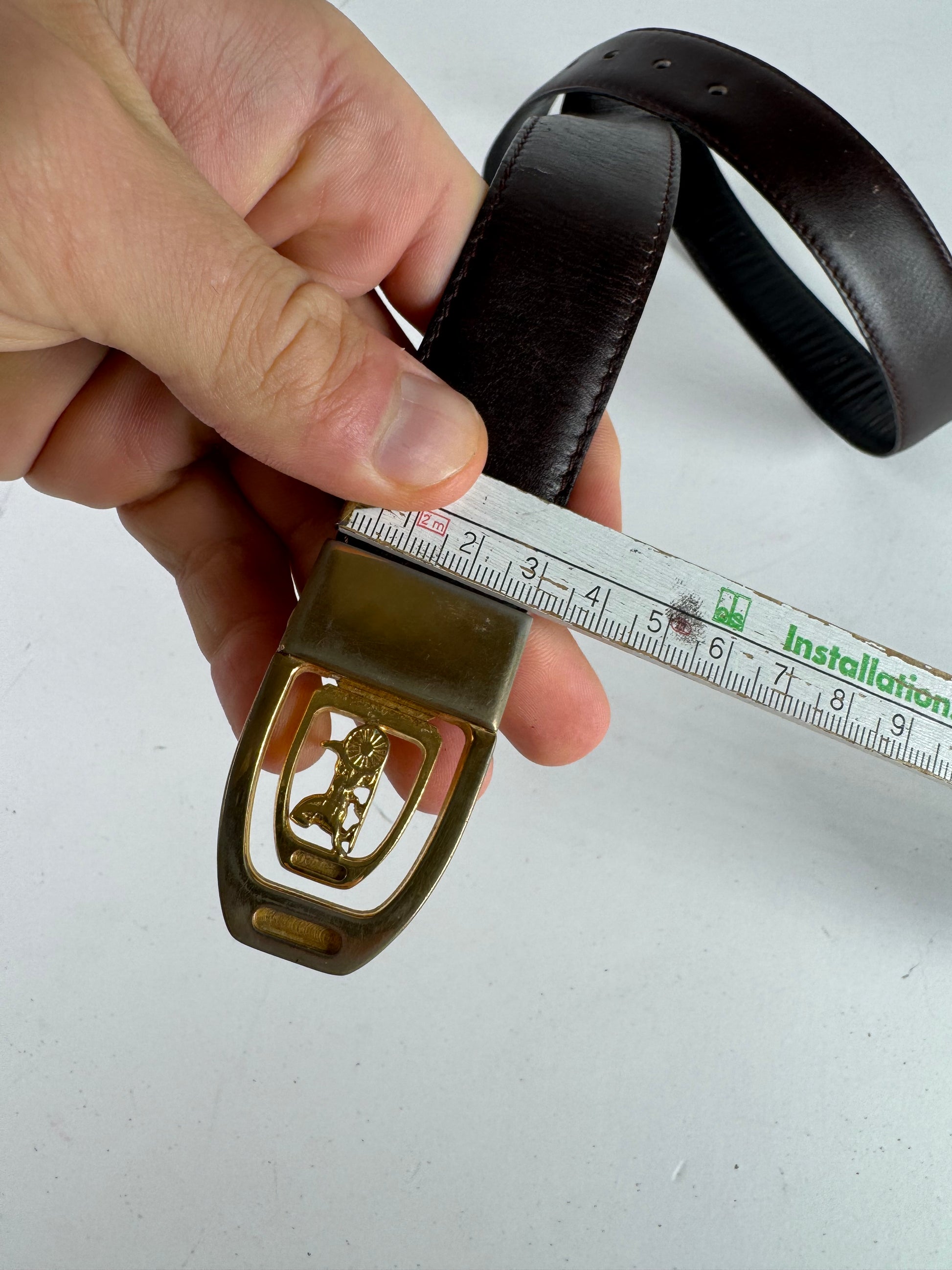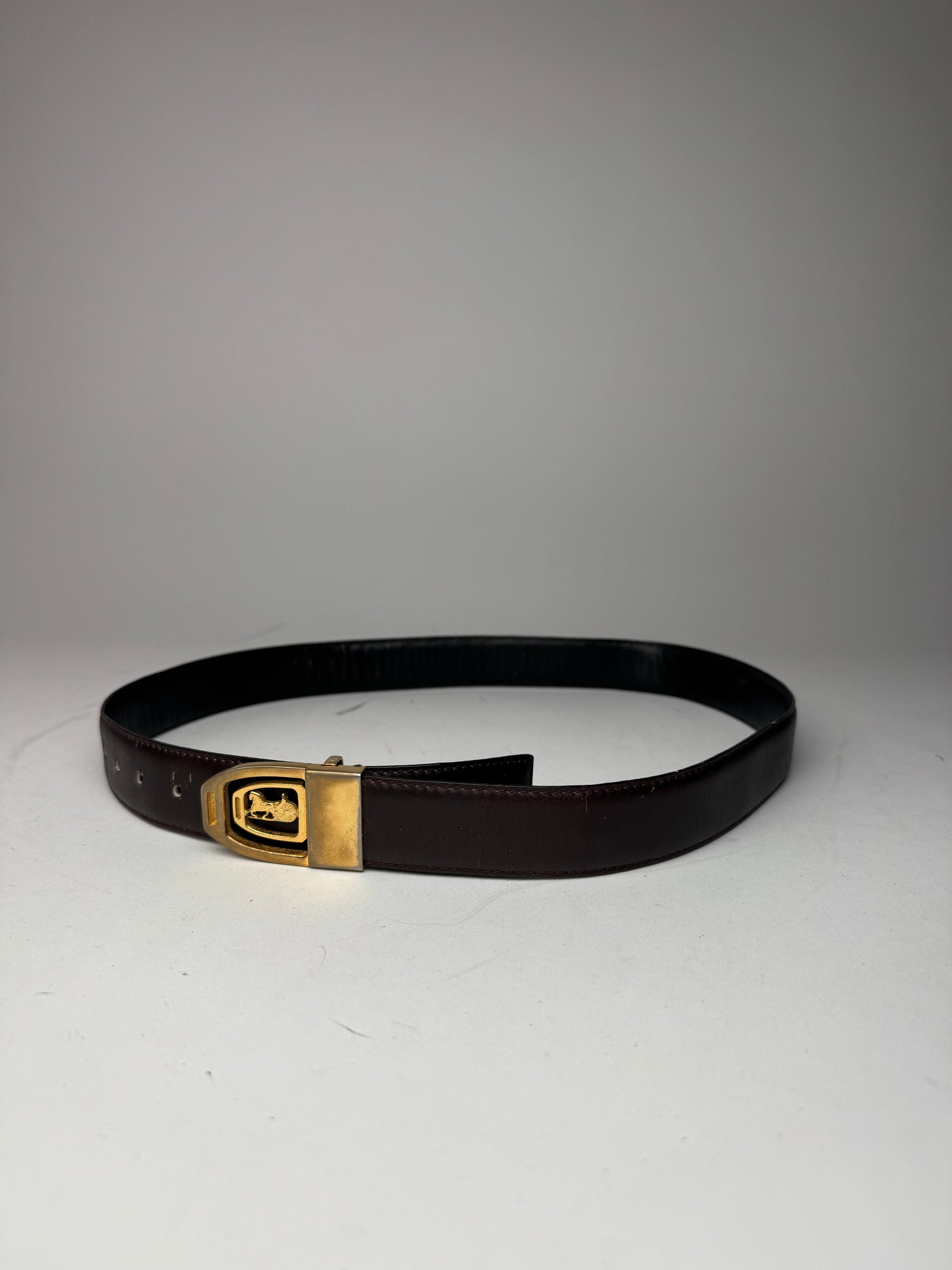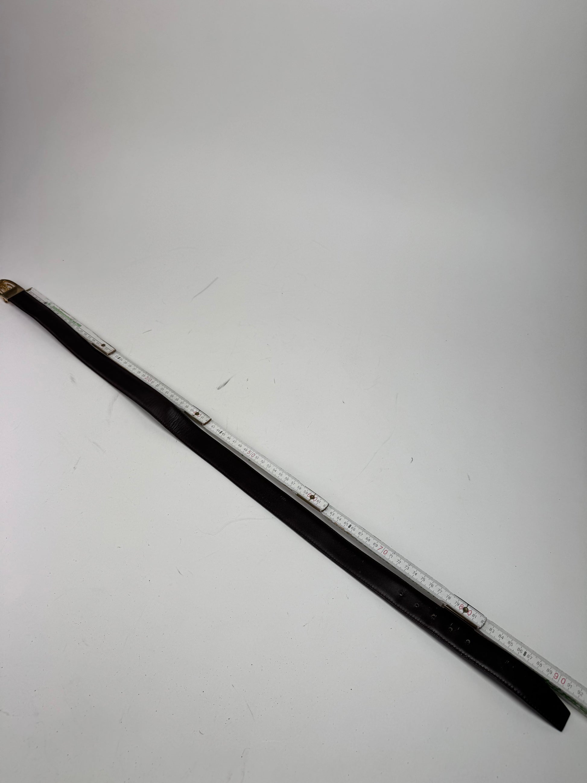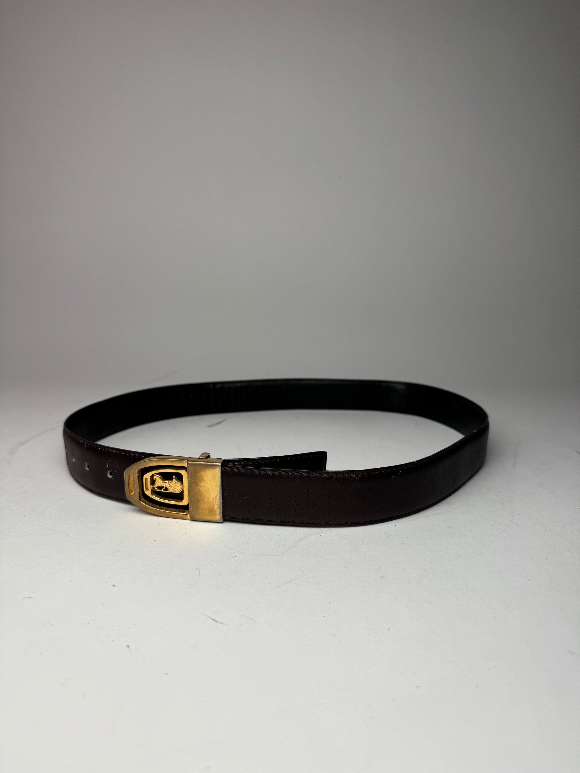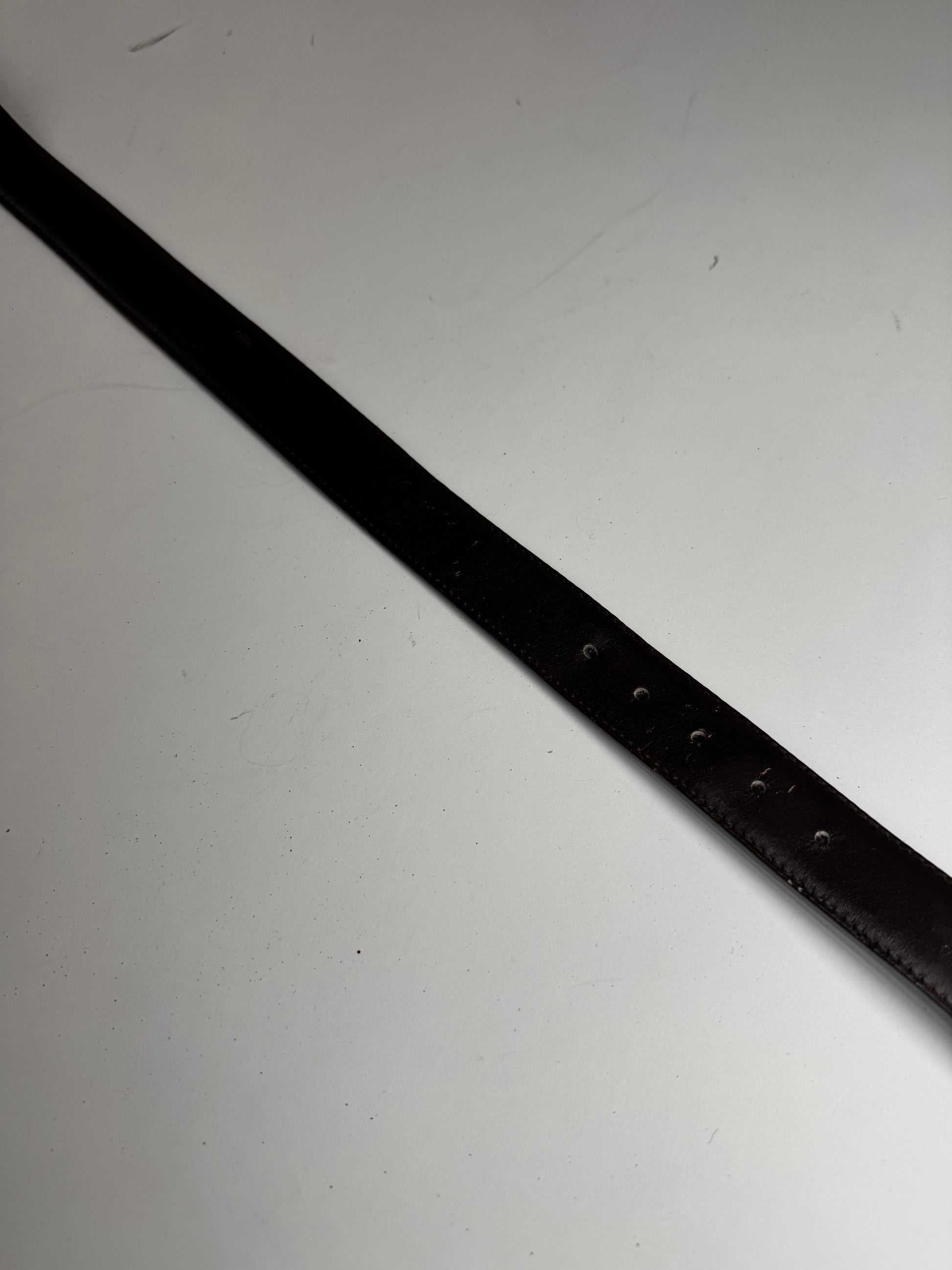 CELINE PARIS Vintage Belt. This chic accessory is finely crafted of brown leather and features a gold-tone steel buckle with CELINE’s signature carriage logo embedded in the design. First introduced as a nod to the brand’s Parisian heritage and equestrian elegance, the carriage emblem has become an iconic symbol of CELINE’s timeless style.