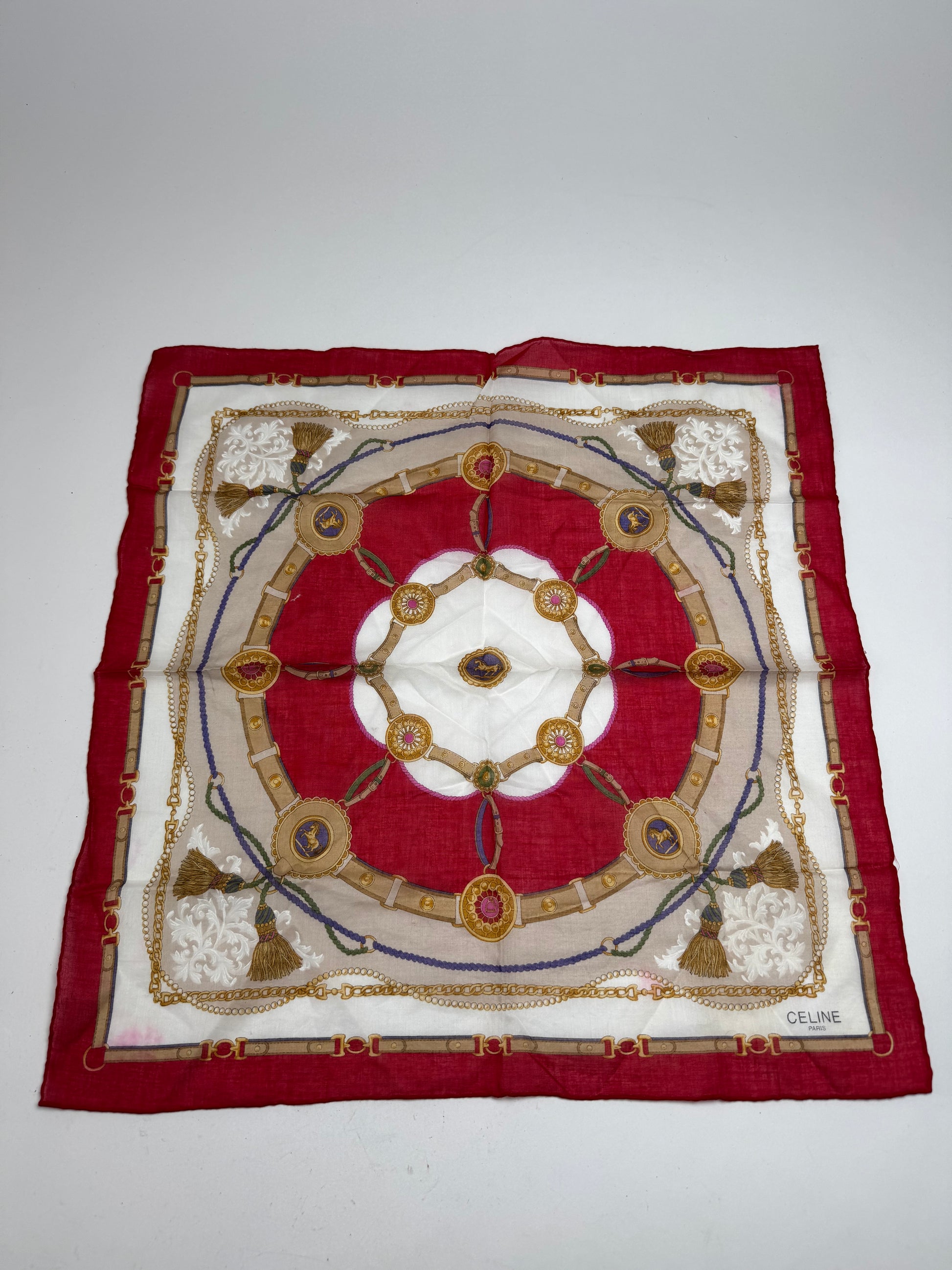 CELINE PARIS Red, White, and Gold Baroque-Patterned Vintage Scarf.