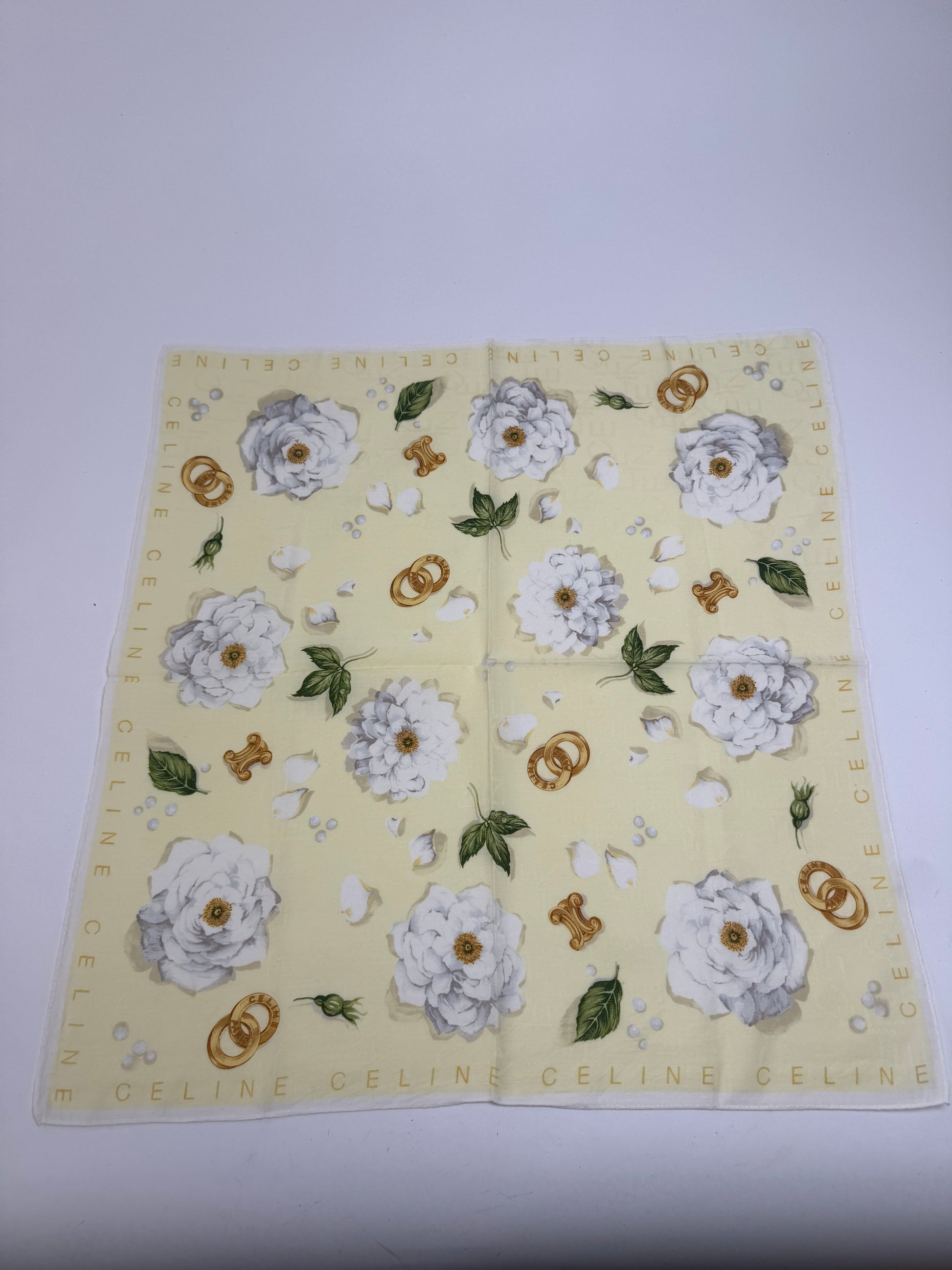 This vintage scarf is finely crafted of silk and canvas with a lemon-yellow base, featuring white flowers, green leaves, golden rings, and signature golden Céline Triomphe logos throughout. A bright and elegant accessory that reflects the house’s classic decorative codes.