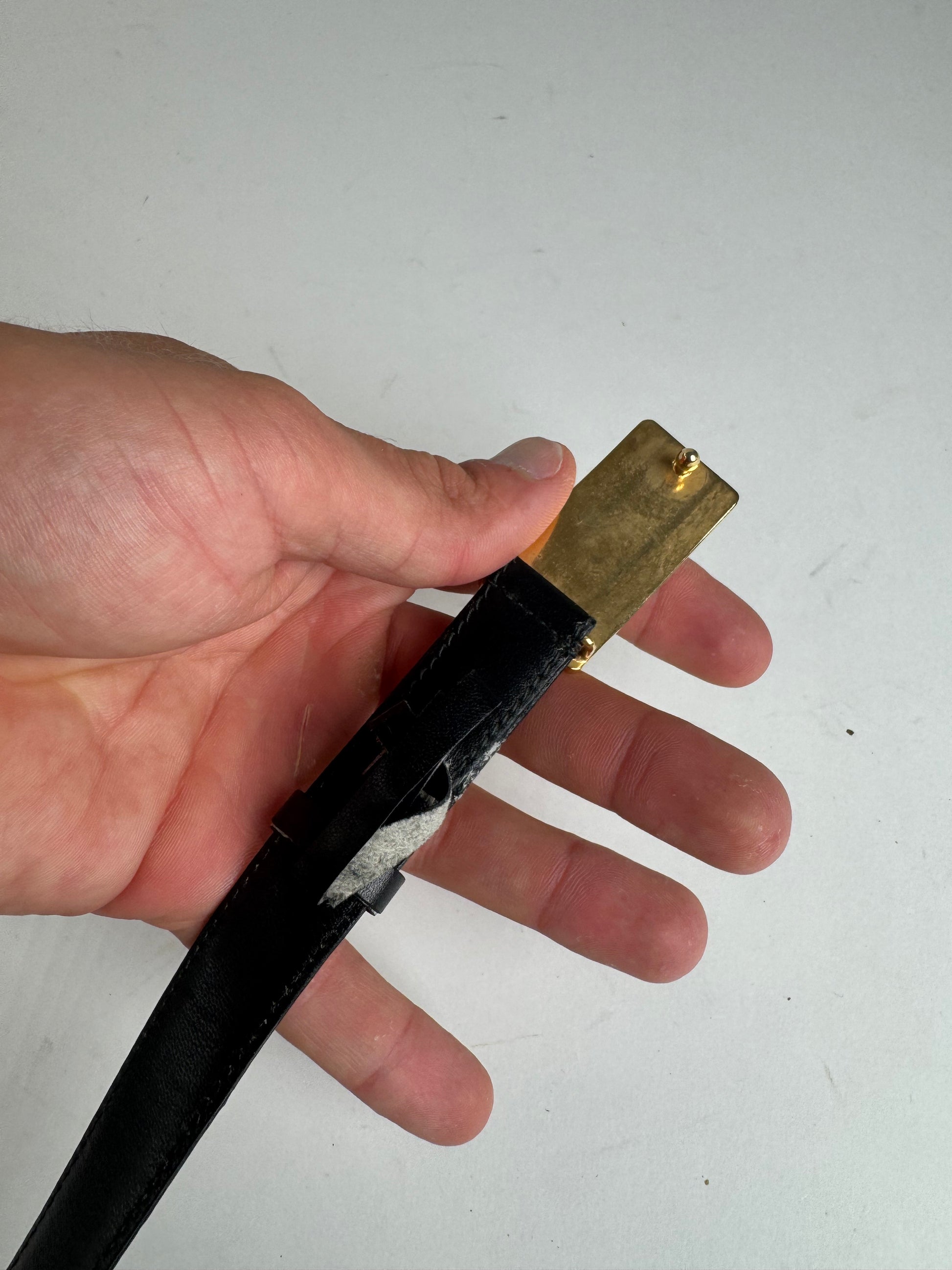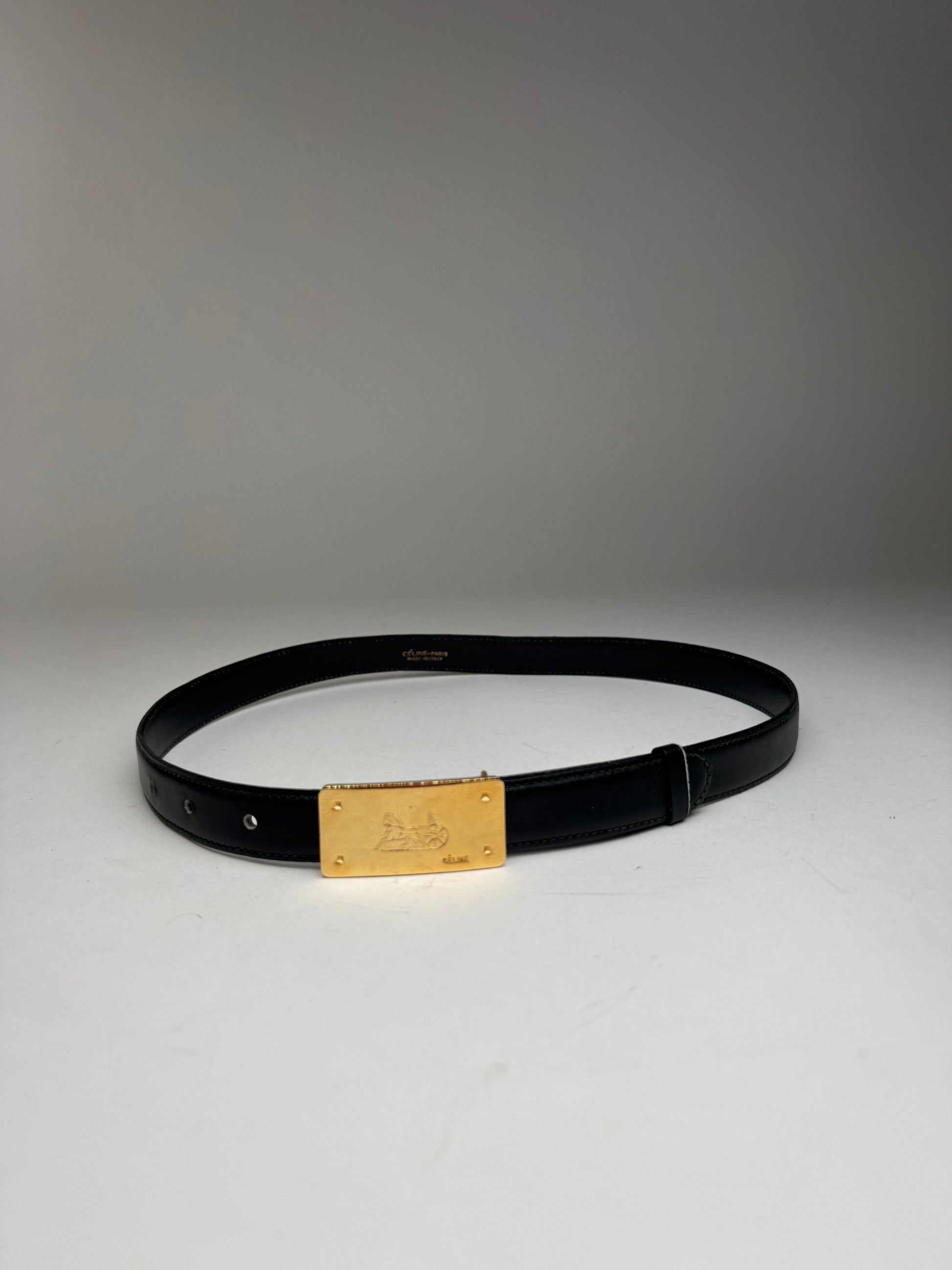 CELINE PARIS Vintage Carriage Logo Belt. This refined unisex belt is crafted of black leather and features a rectangular gold-tone steel buckle engraved with the CELINE horse-and-carriage logo. Introduced in the 1970s, the logo pays tribute to the brand’s Parisian roots and timeless elegance, symbolizing tradition and luxury craftsmanship. Made in Italy.