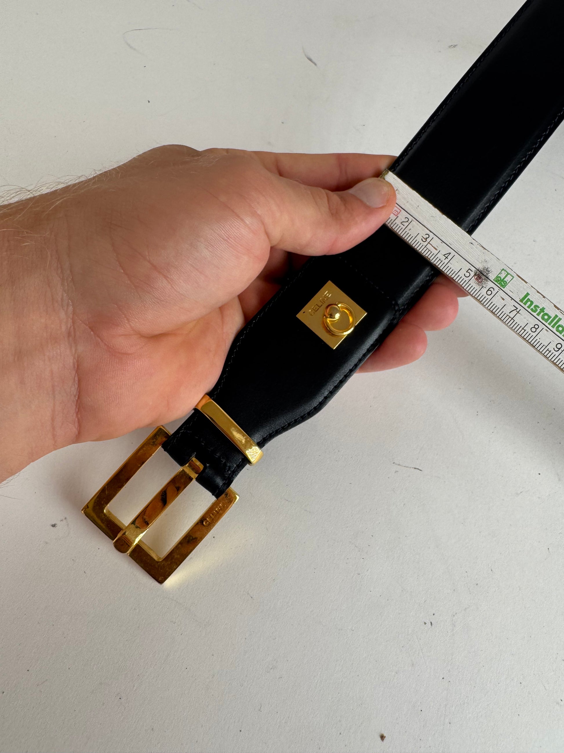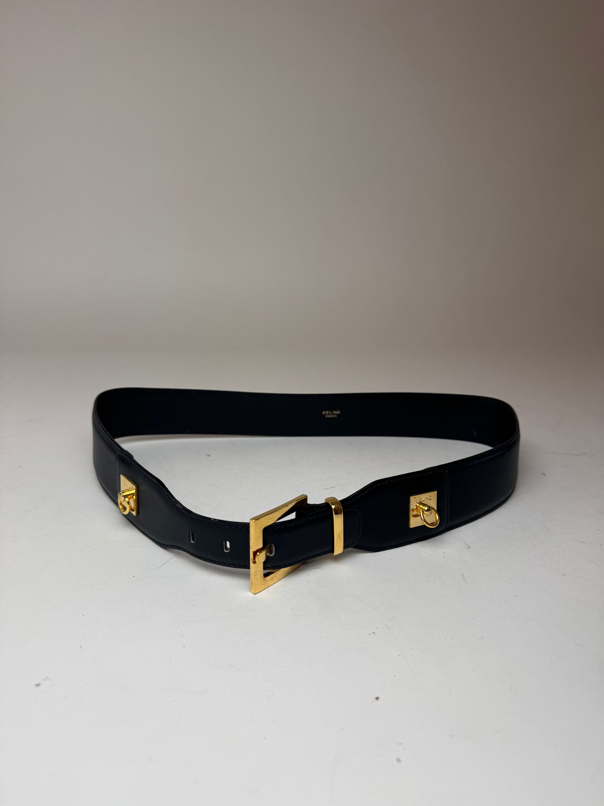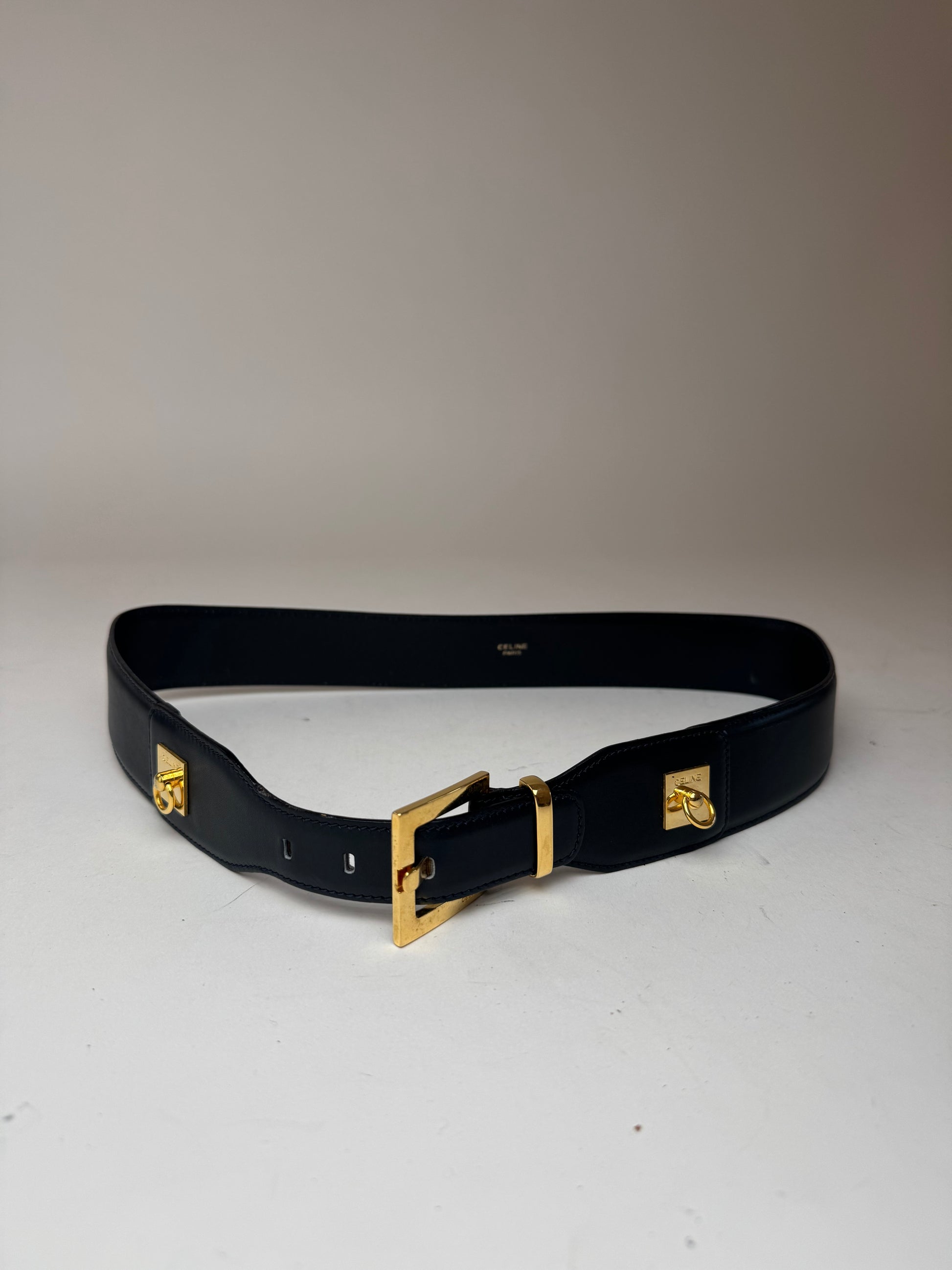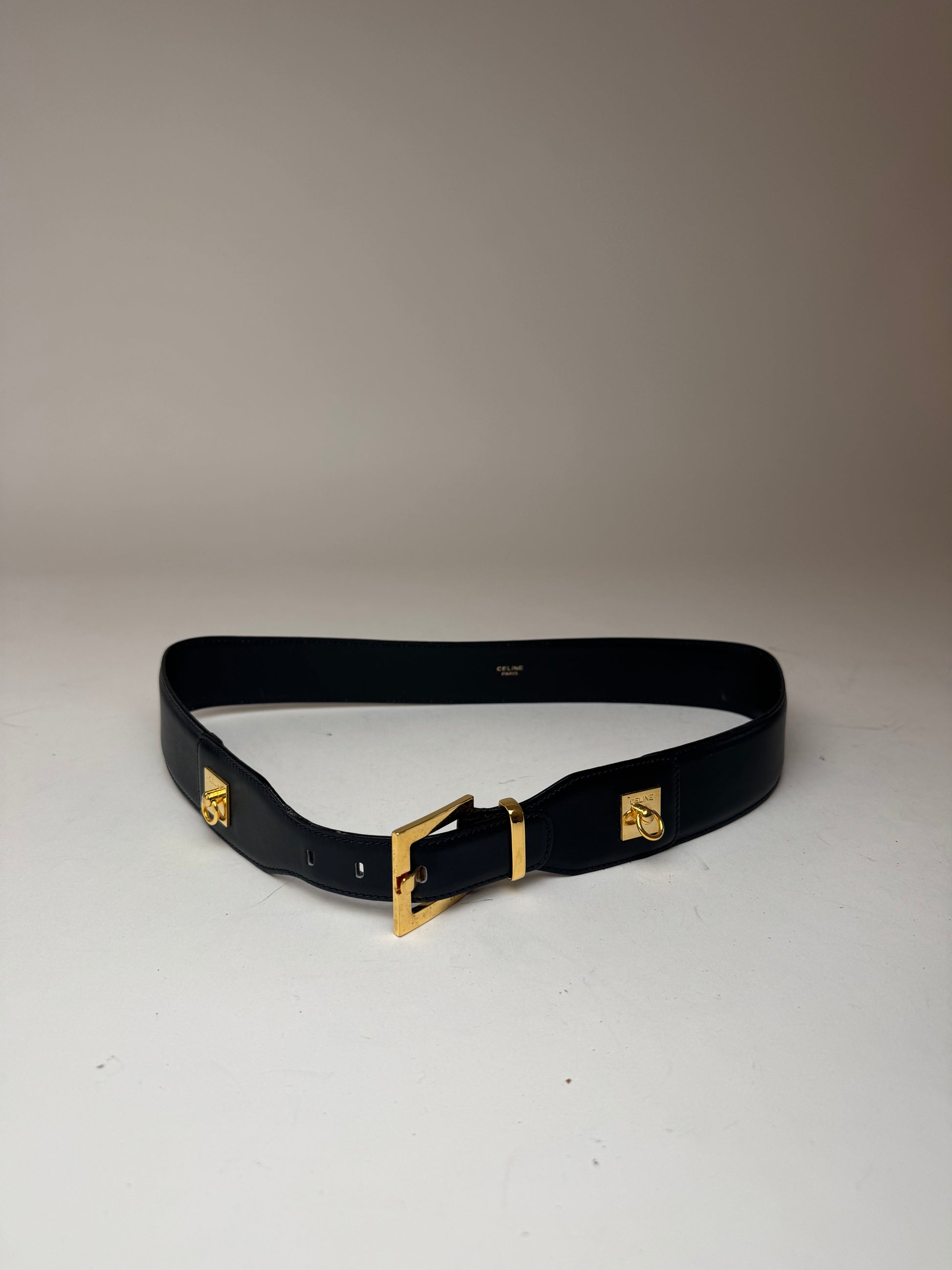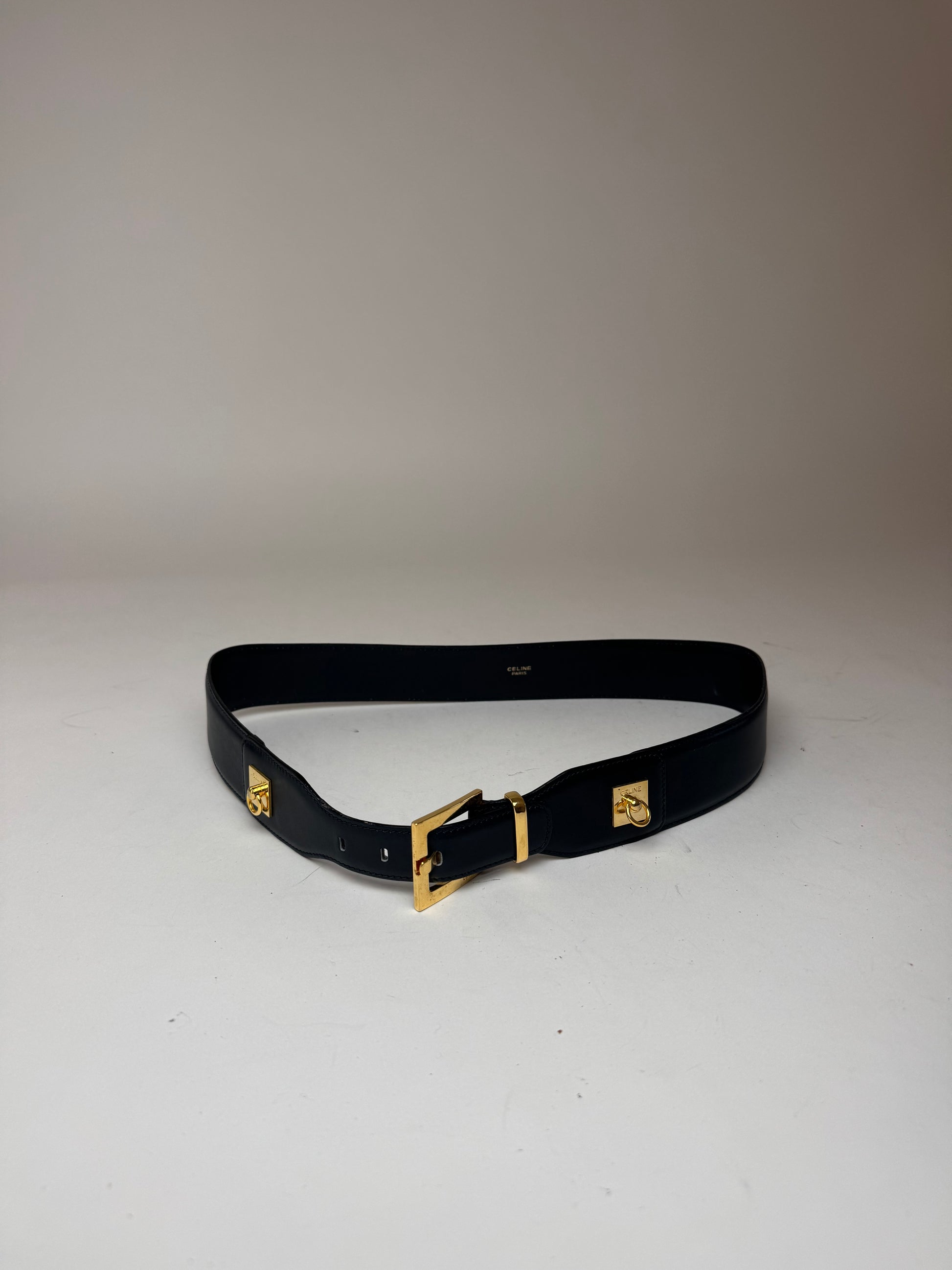 CELINE PARIS Vintage Belt. This elegant belt is finely crafted of black leather. The piece features two gold-tone steel Céline carriage logos on the front and a matching gold-tone steel buckle.