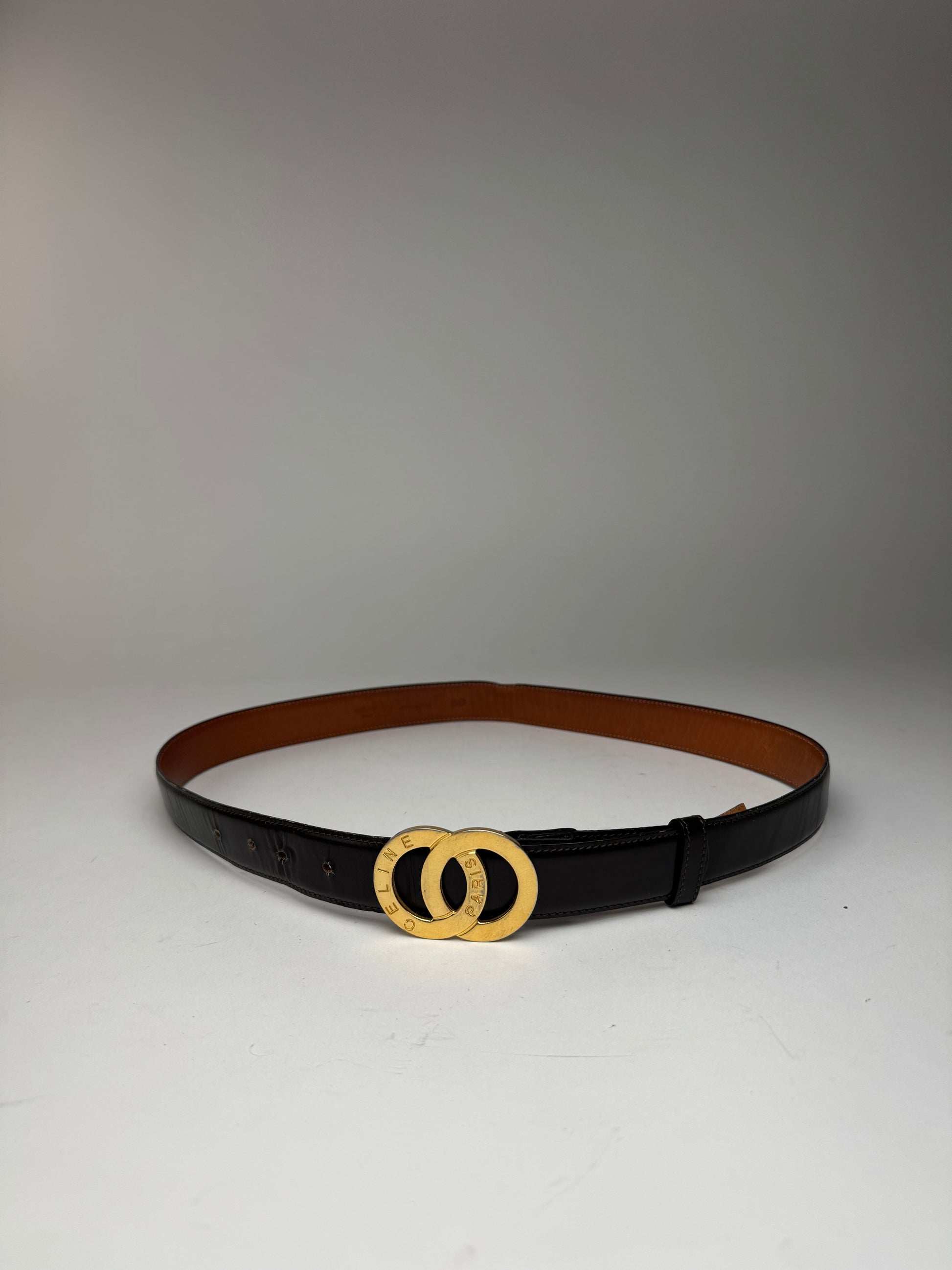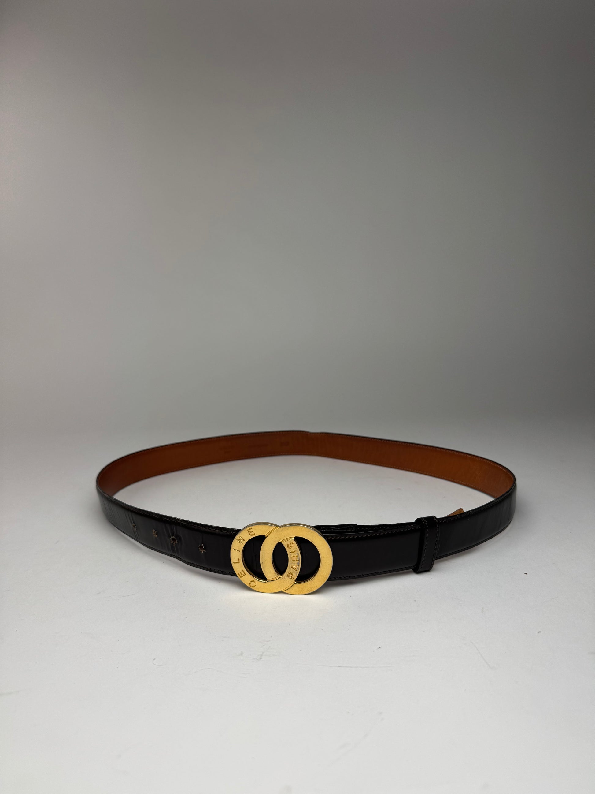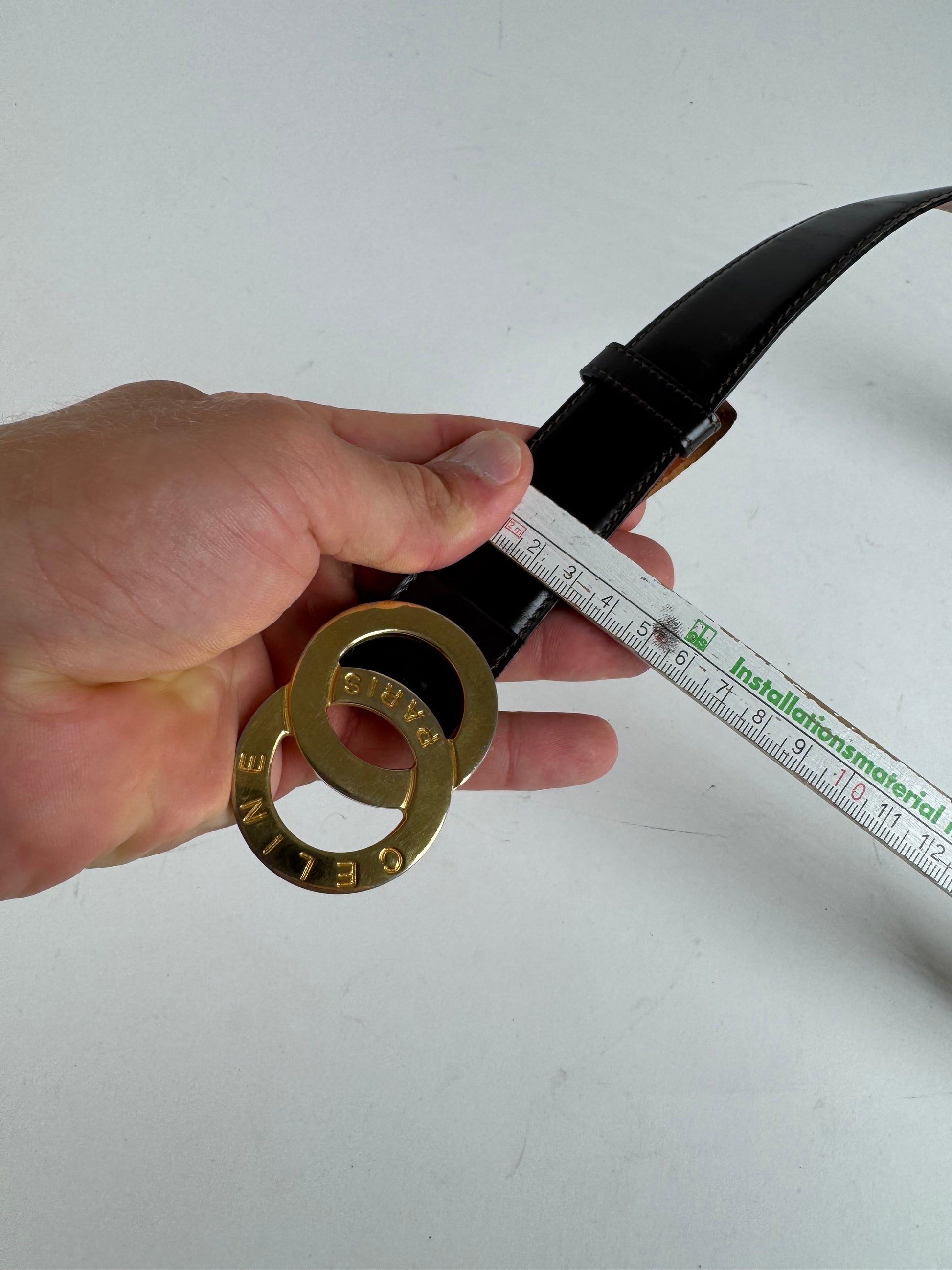 CELINE PARIS Vintage Ring Buckle Belt. This sleek belt is crafted of black leather and features a double-ring buckle in gold-tone steel with an engraved Céline Paris logo. The interior is lined in brown leather. Made in Italy.