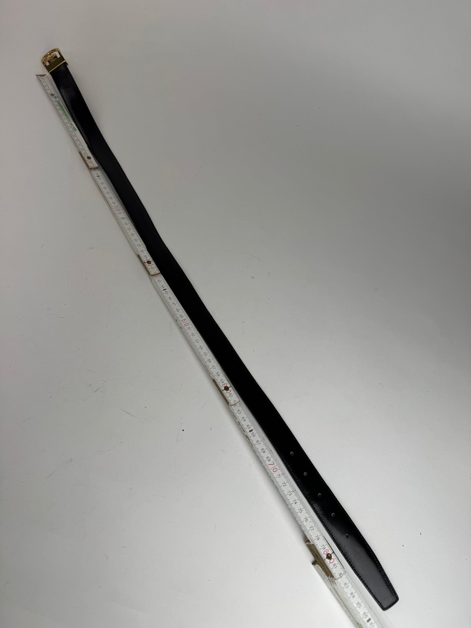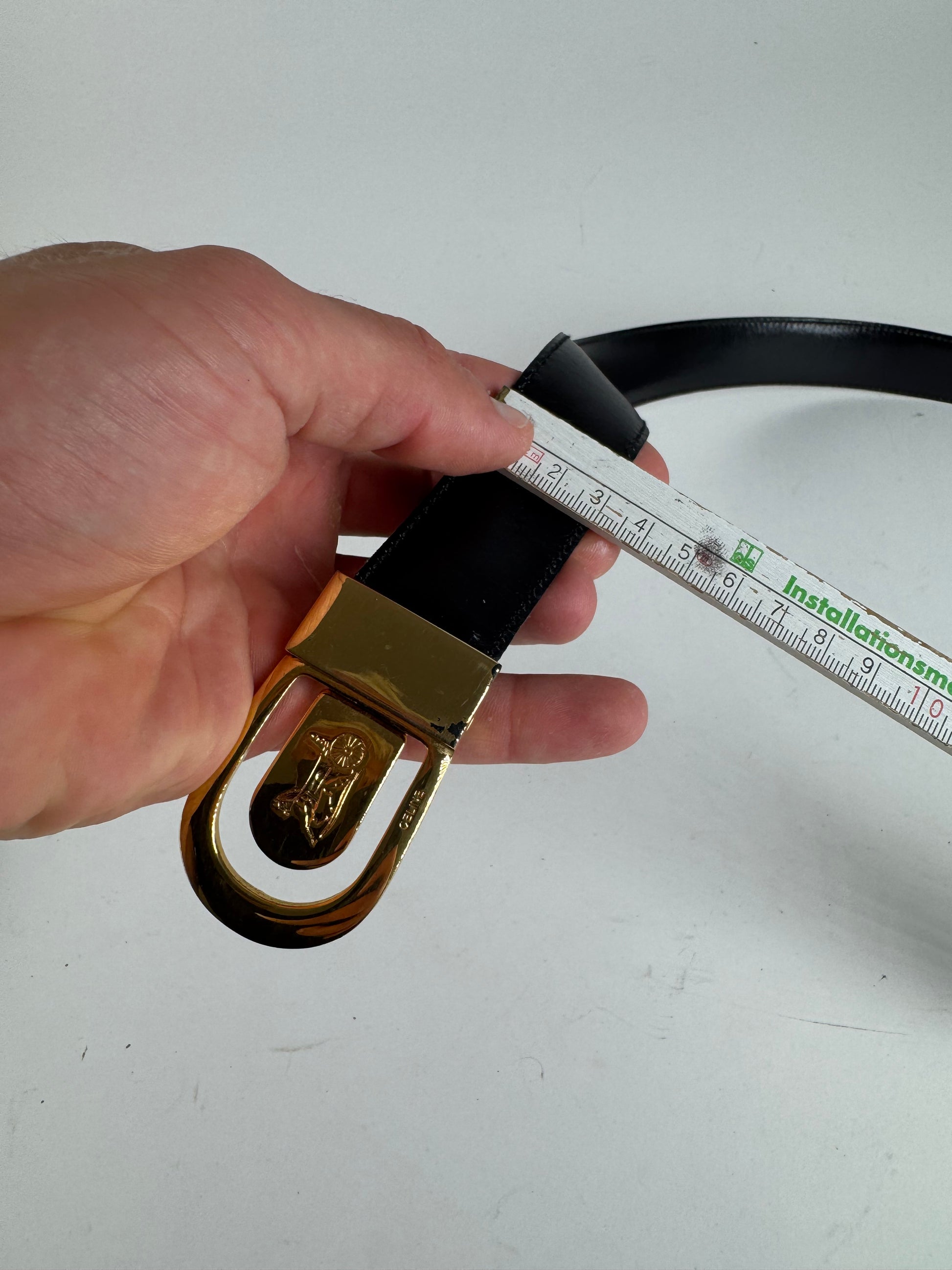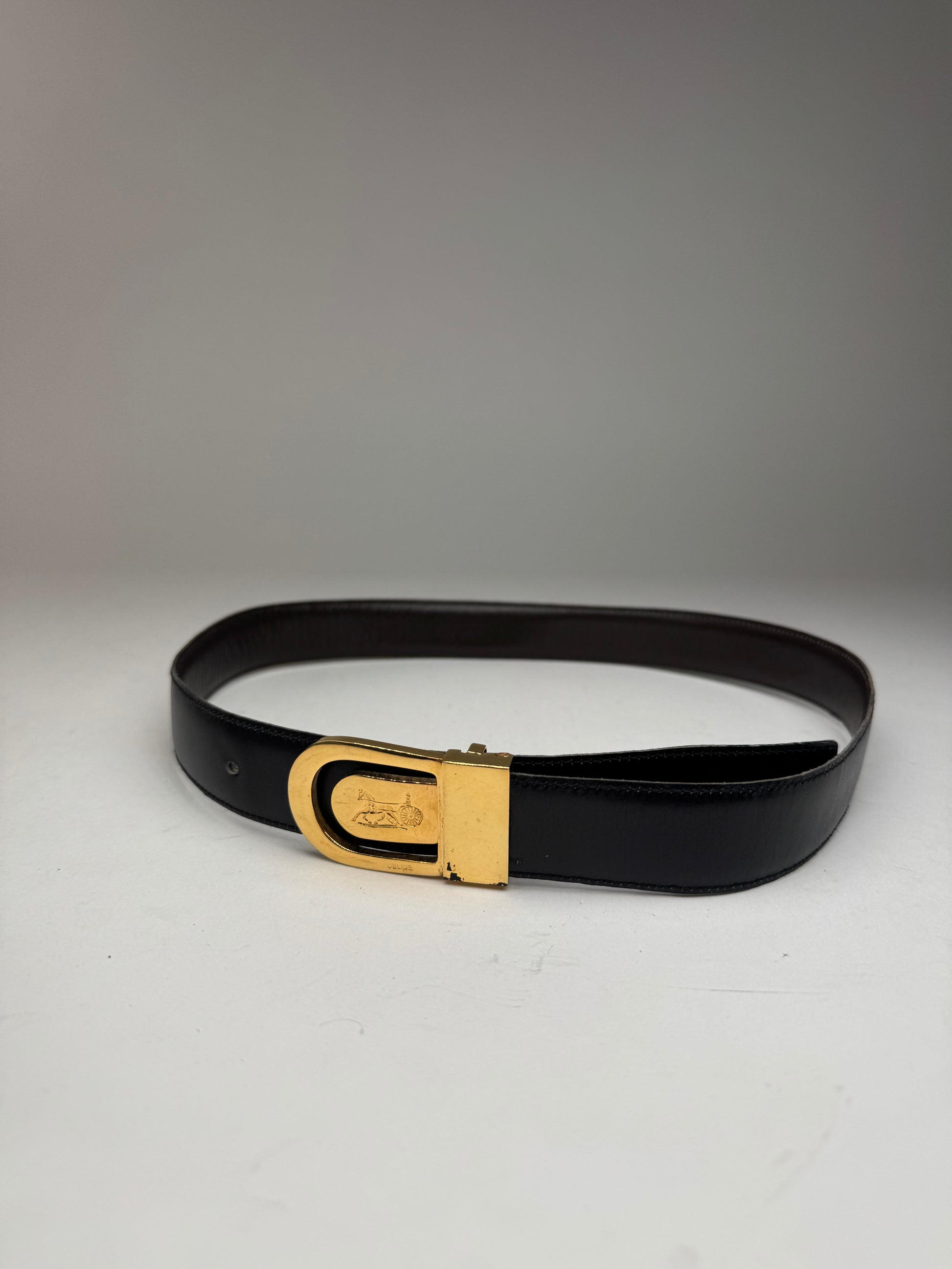 CELINE PARIS Vintage Carriage Logo Belt. This elegant belt is crafted of black leather with a gold-tone steel buckle featuring the CELINE carriage logo. Introduced in the 1970s, the horse-and-carriage emblem reflects CELINE’s Parisian heritage and was inspired by the brand’s early beginnings as a made-to-measure children’s shoe atelier, evoking timeless sophistication and classic French craftsmanship. The interior is lined in dark brown leather. Made in Italy.
