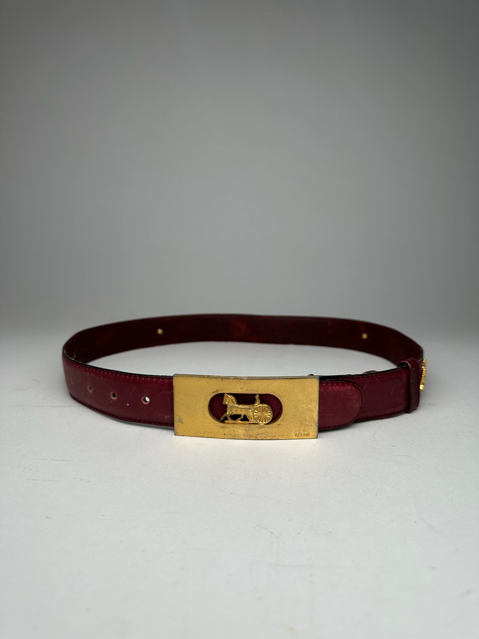 CELINE PARIS Vintage Triomphe Leather Belt. This chic belt is finely crafted of burgundy leather. It features a gold-tone steel buckle with the iconic CELINE carriage logo, along with decorative rider appliqués near the buckle.