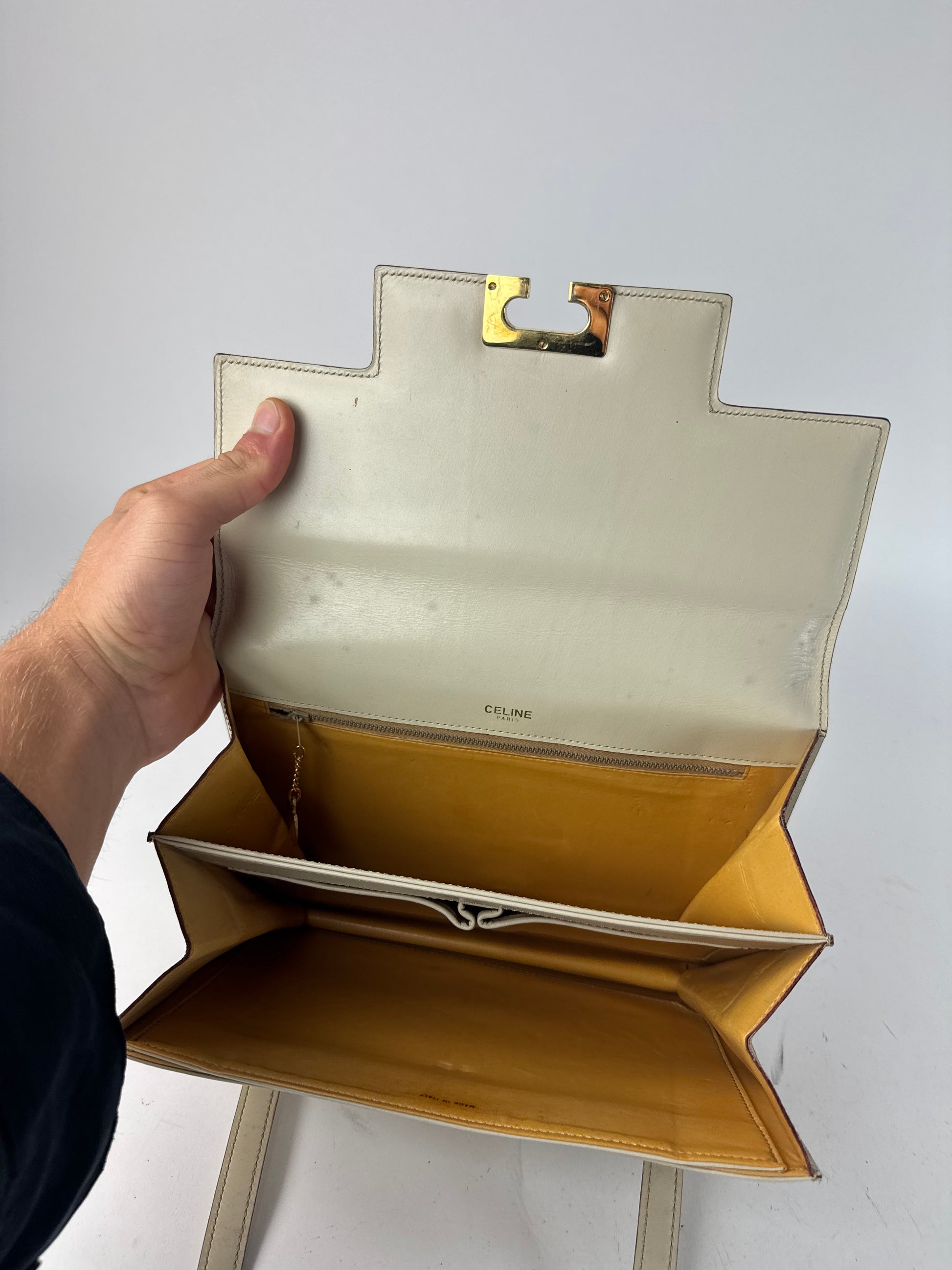The bag includes two medium-length handles in matching leather, a flap closure, and a beautifully finished yellow leather interior with two compartments for practical organization. Made in Italy, this piece perfectly captures CELINE’s timeless balance of luxury and simplicity.
