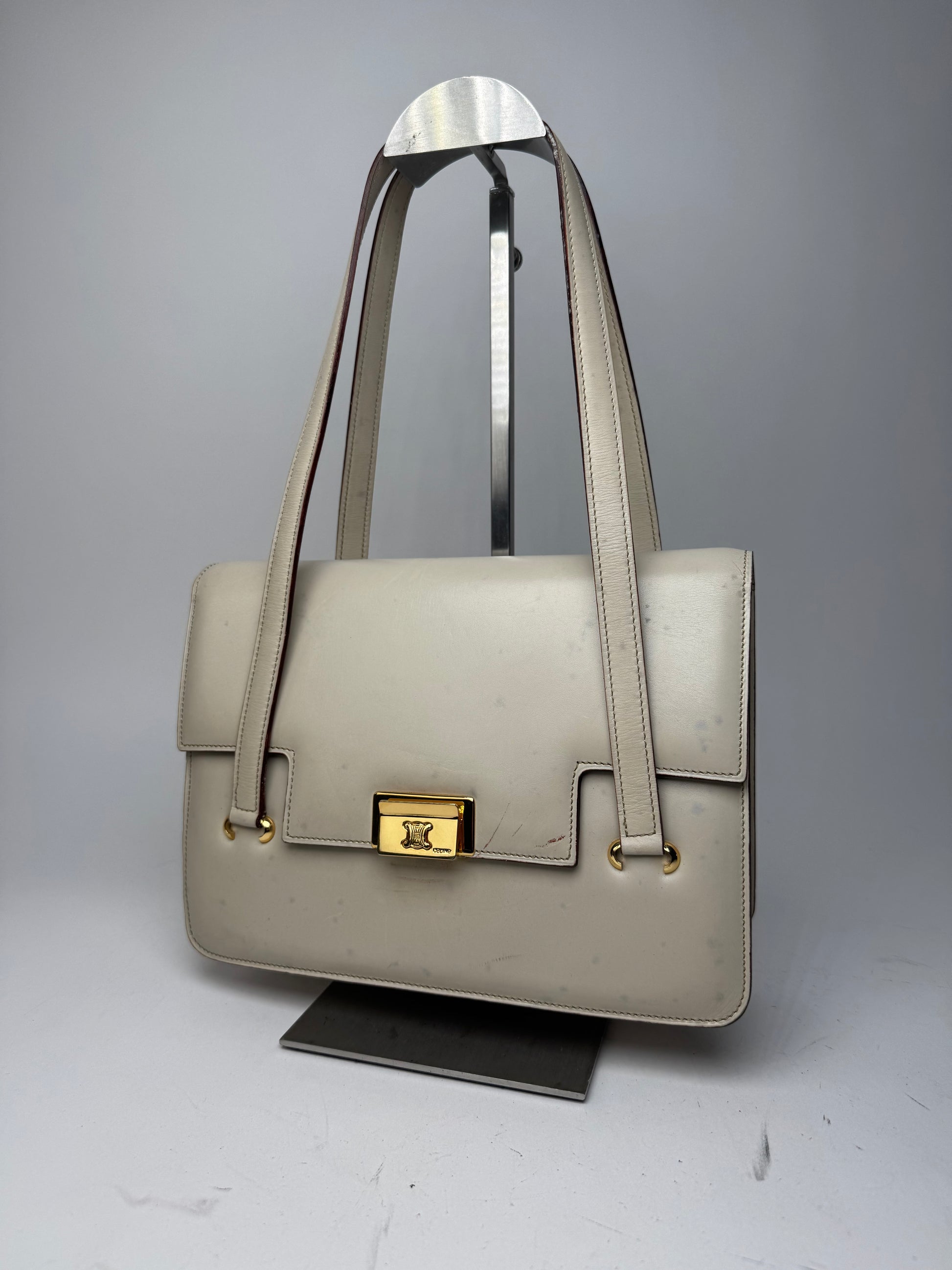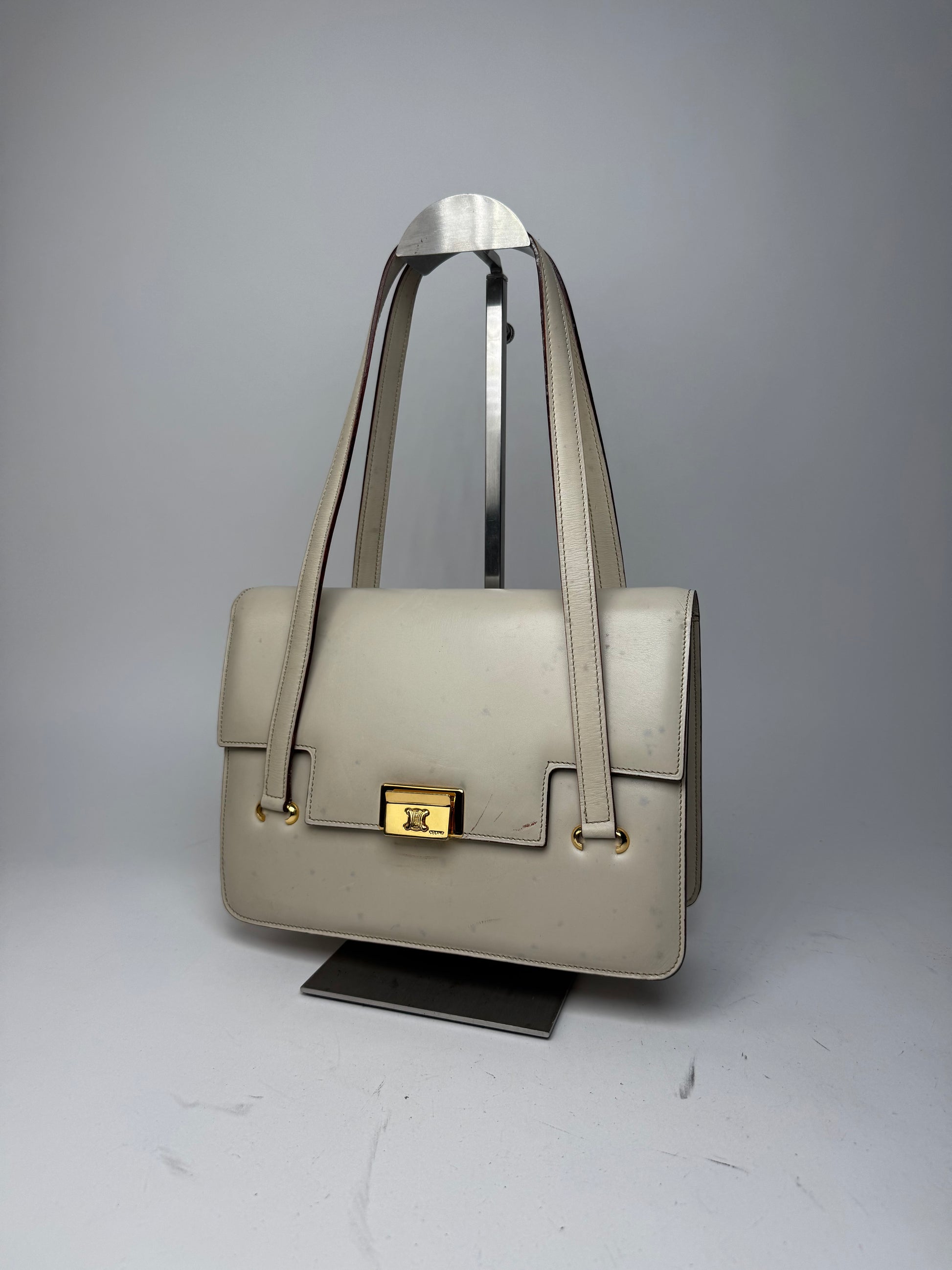 This sophisticated vintage handbag is crafted from ecru-coloured leather and features gold-tone steel hardware with the signature CELINE TRIUMPH logo displayed prominently on the front flap. Originally introduced in the 1970s, the TRIUMPH emblem has become one of CELINE’s most iconic symbols, representing Parisian elegance and the brand’s enduring heritage of refined craftsmanship.