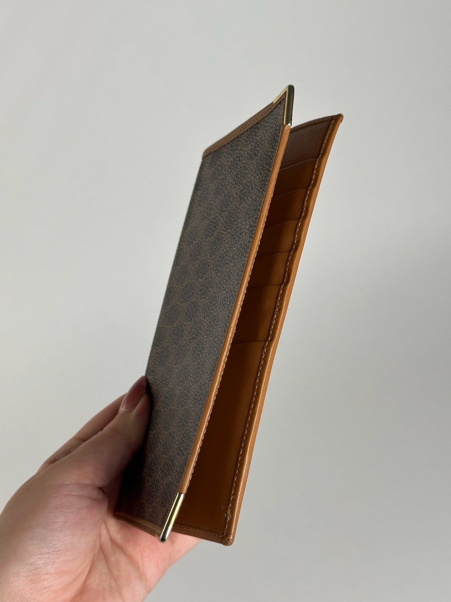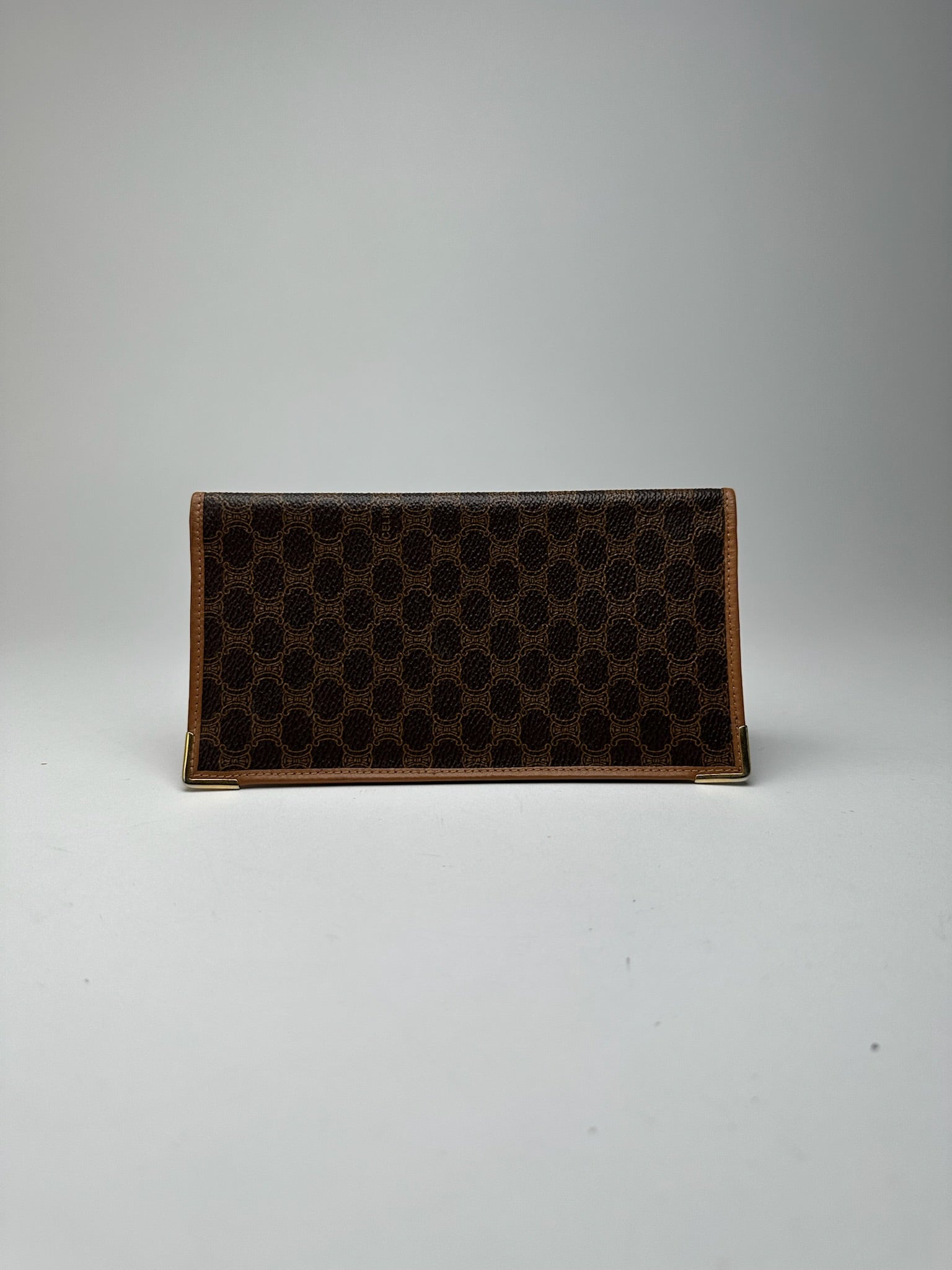 CELINE PARIS Vintage Macadam Leather Cardholder. This chic cardholder is finely crafted of dark brown CELINE Macadam monogram leather with light brown leather trim. The corners on the right side are capped in gold-tone stainless steel. The interior is lined in light brown leather.