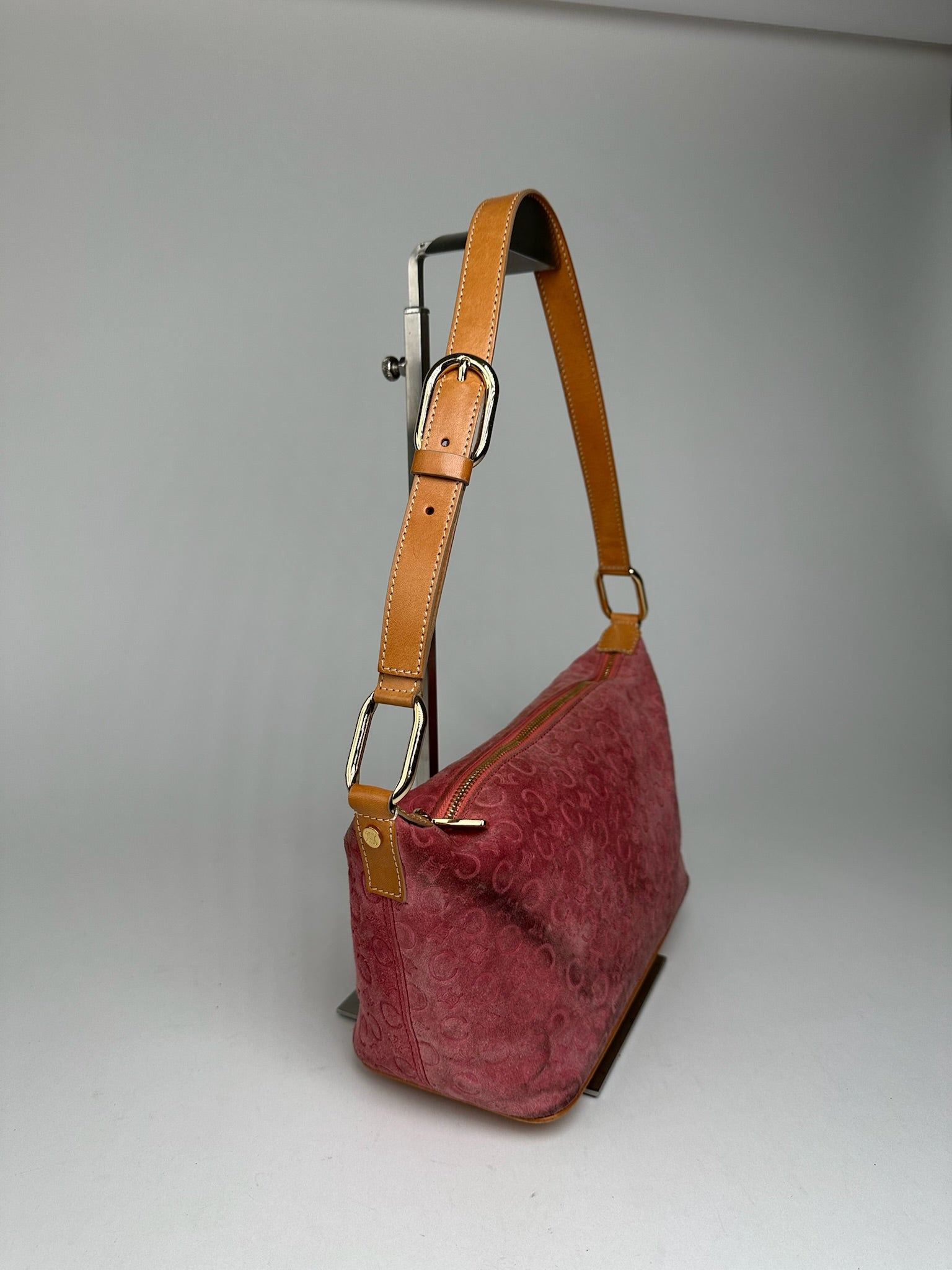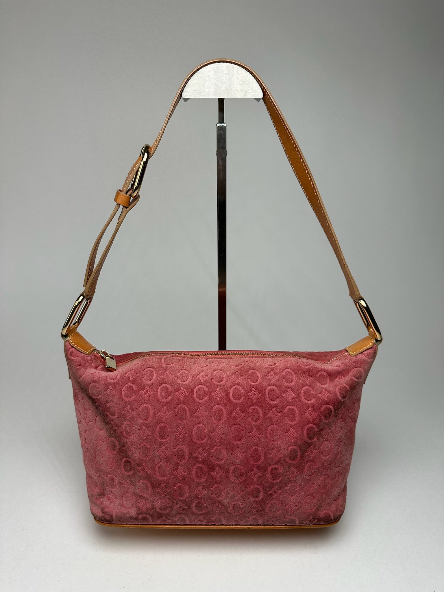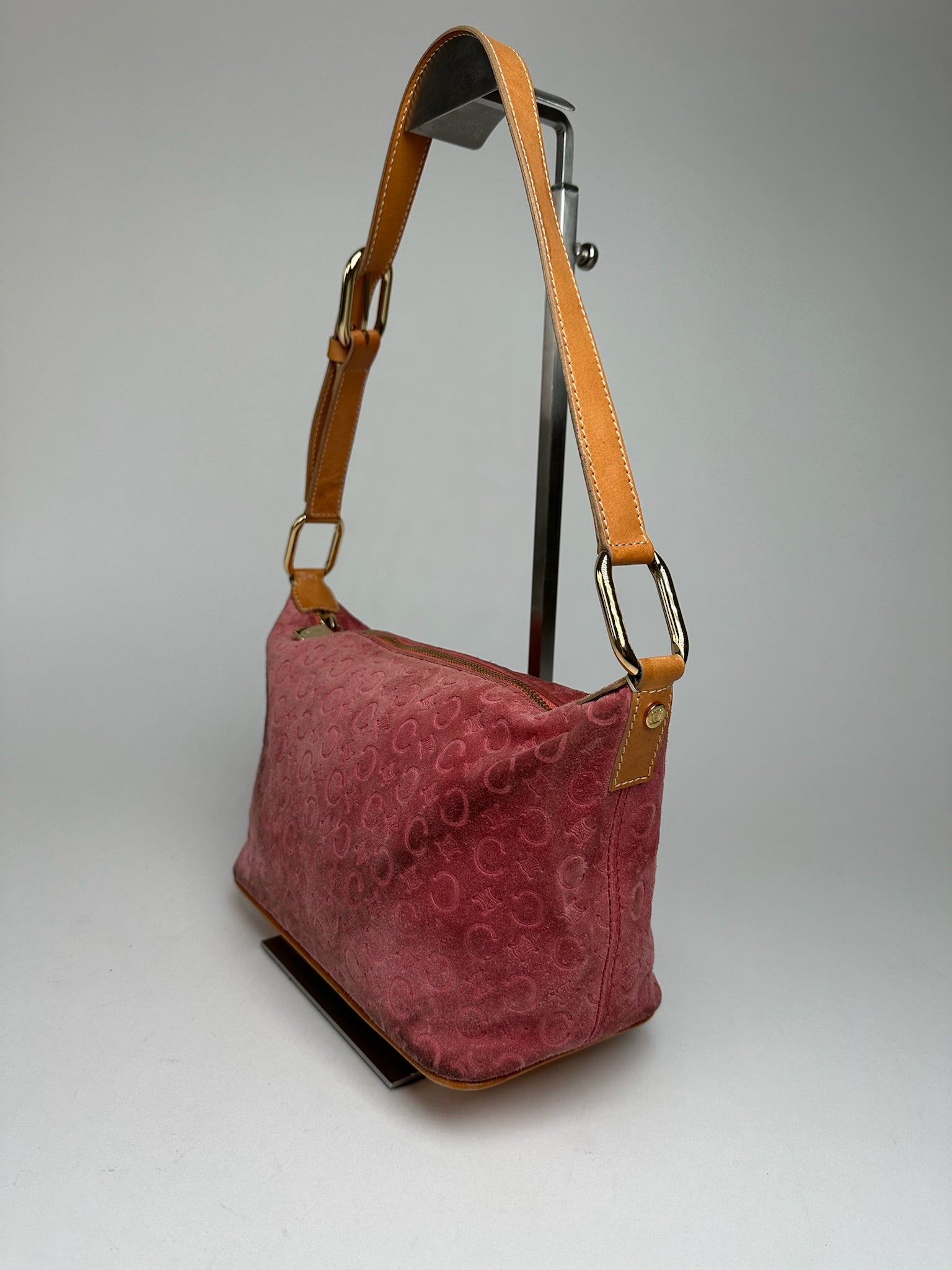 CELINE PARIS Vintage Handbag. This chic handbag is finely crafted of pink suede leather with caramel brown leather accents. It features gold-tone steel hardware and a vibrant pink canvas interior.