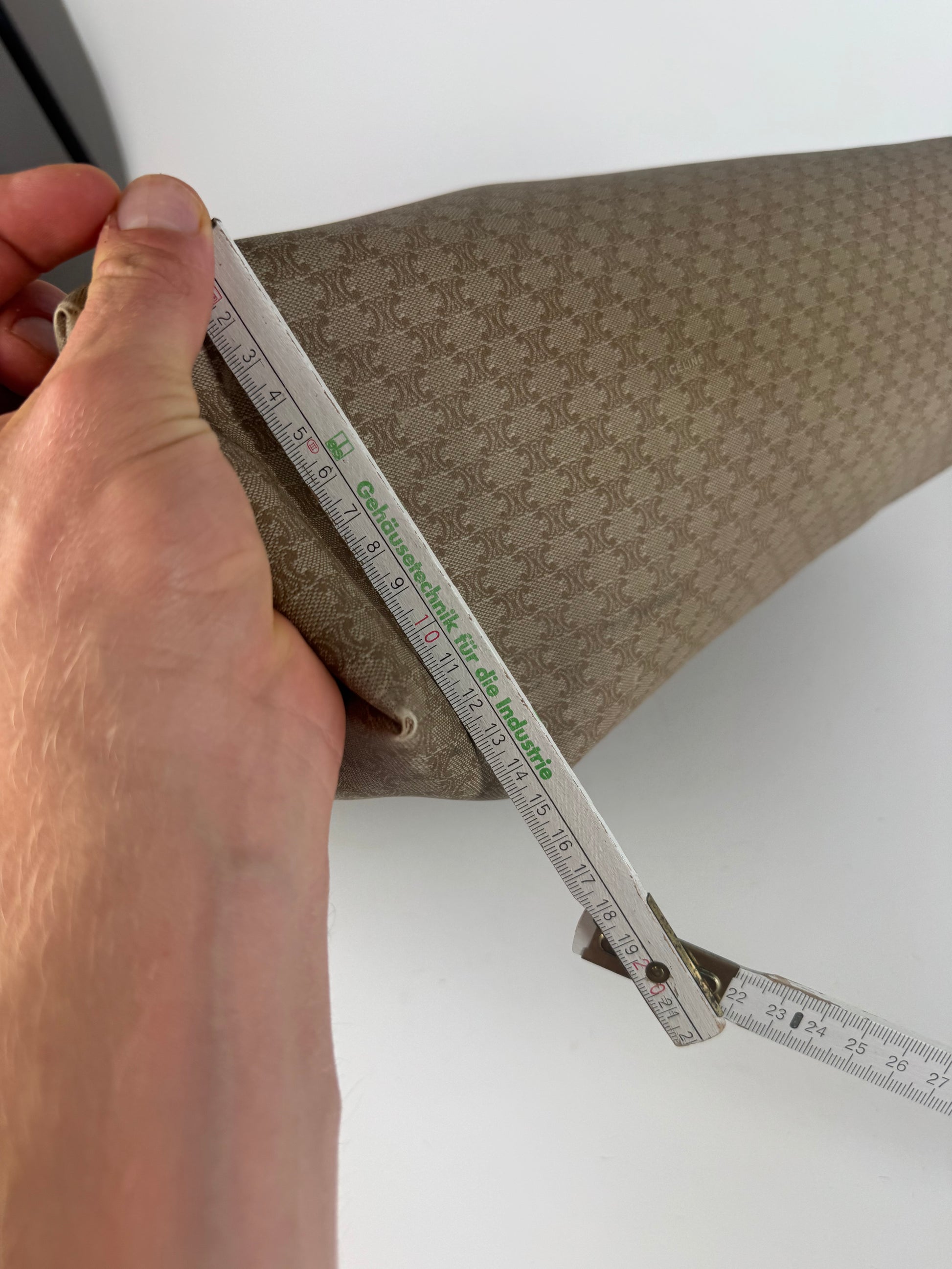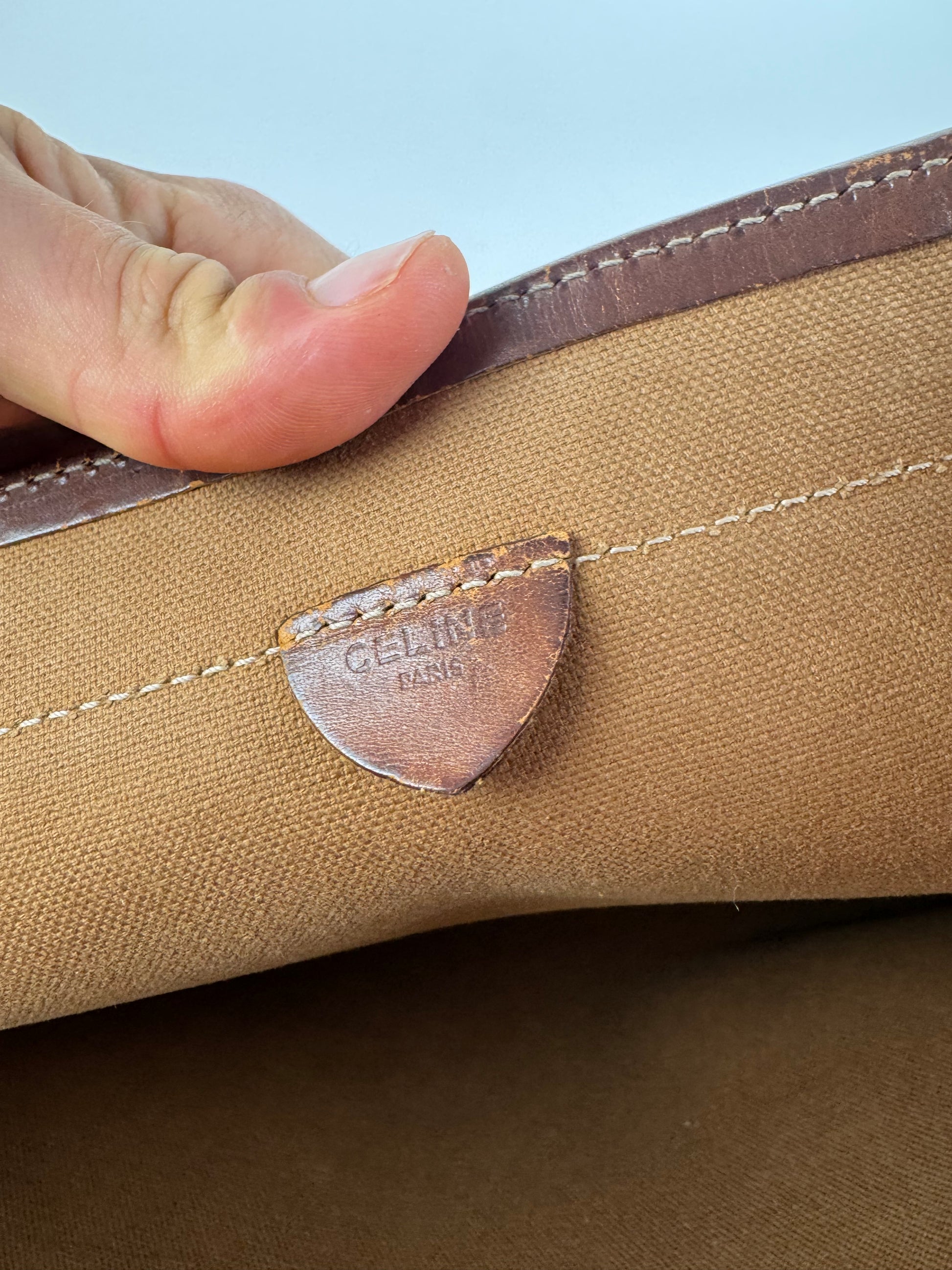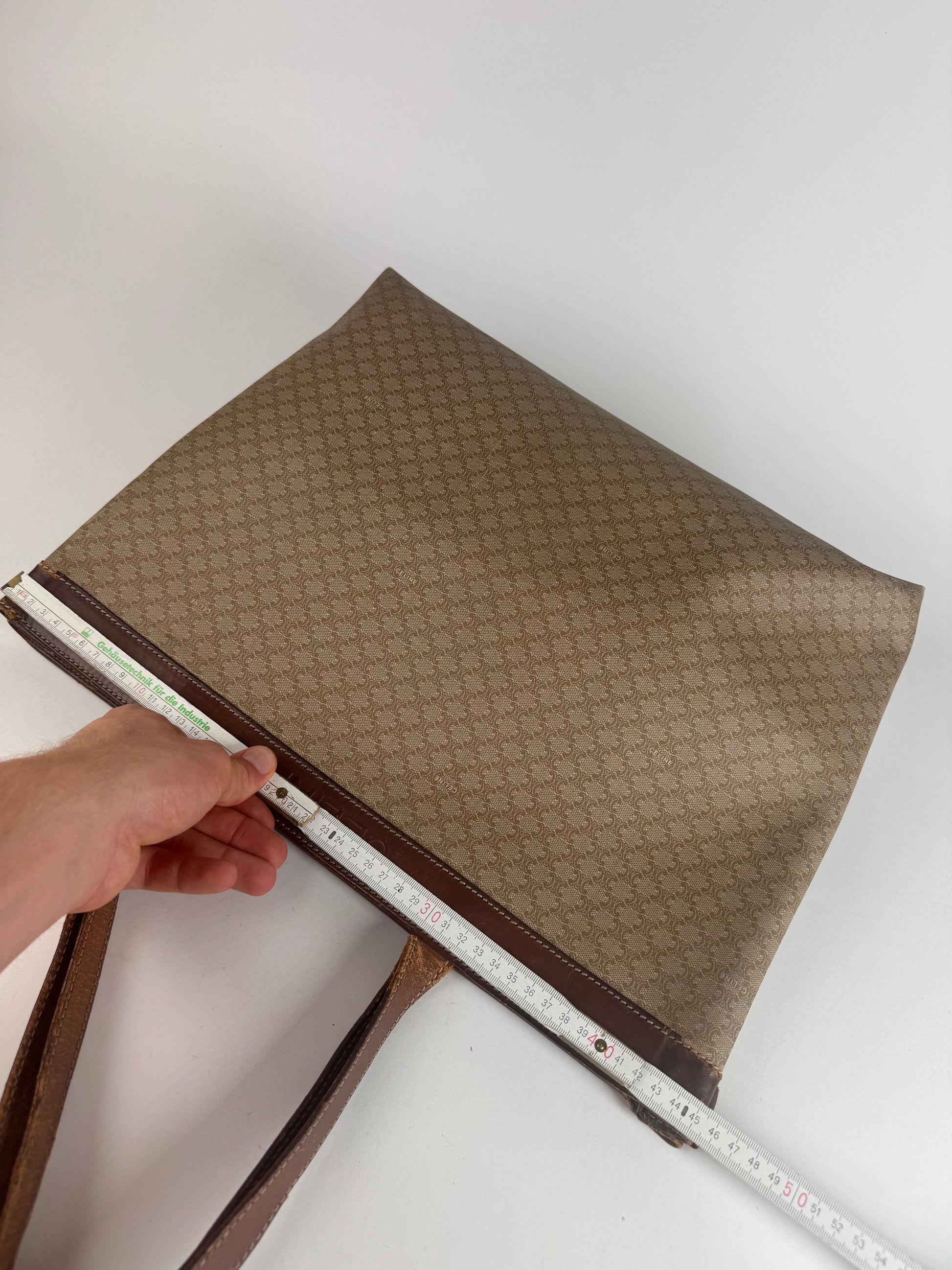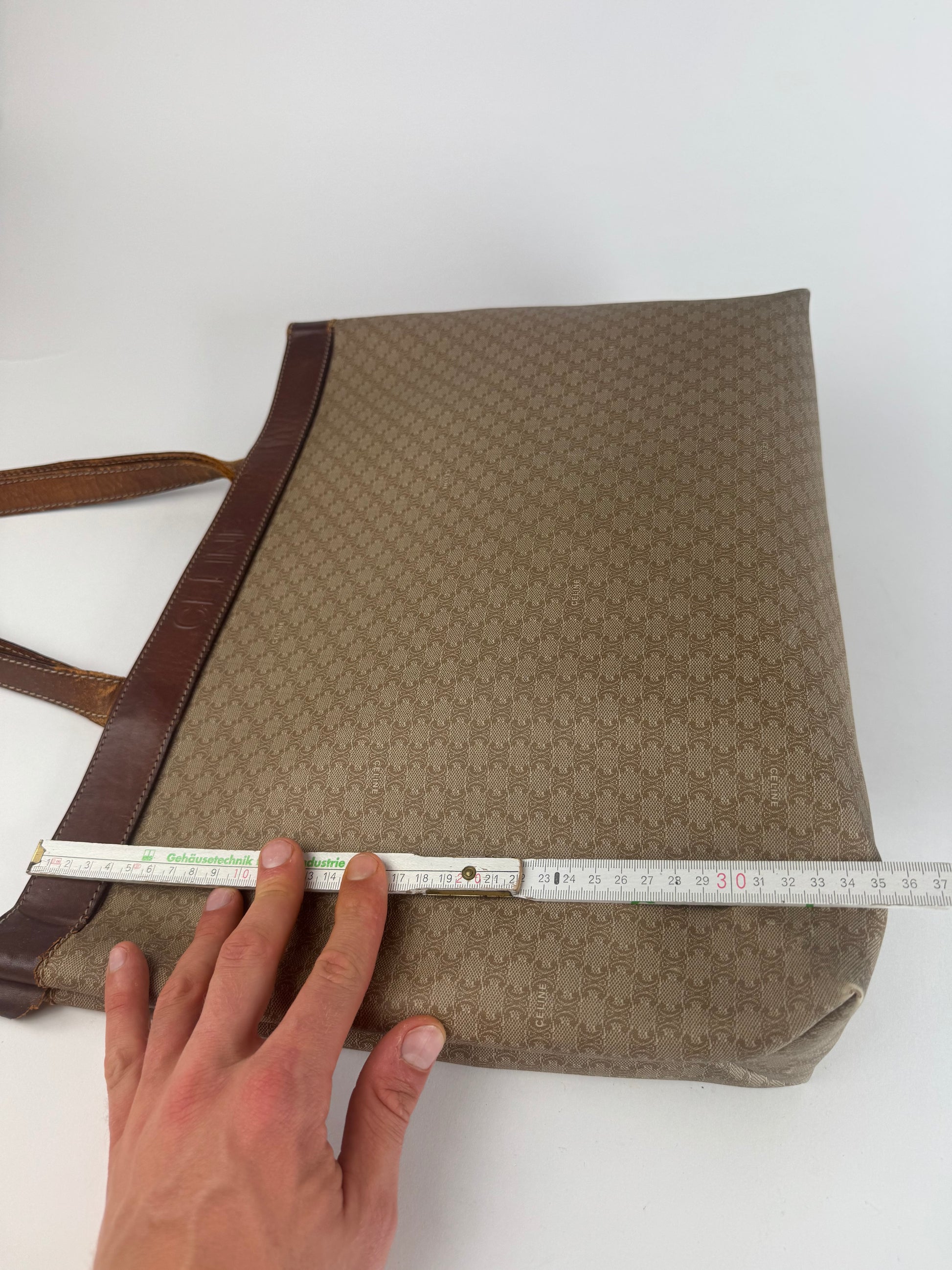 This stylish vintage handbag is finely crafted from beige leather with the iconic CELINE Monogram pattern. The handles and trim are made from contrasting brown leather, adding a touch of elegance to its spacious design. The bag features a snap-button closure and is lined with brown canvas for a refined finish. Proudly made in Italy, it dates back to 2007.
