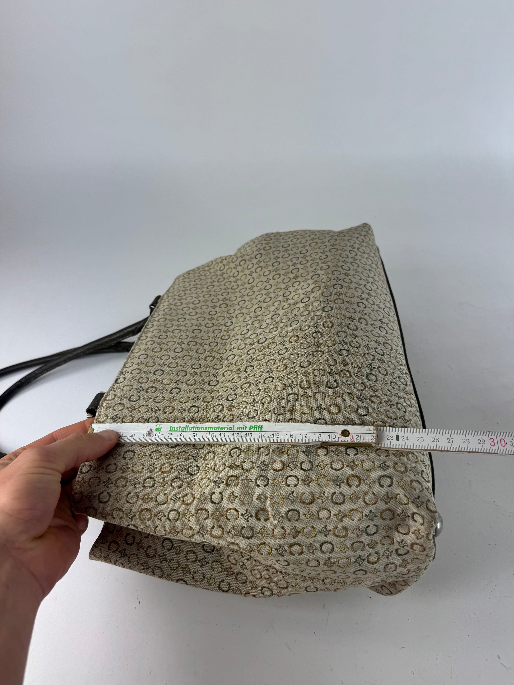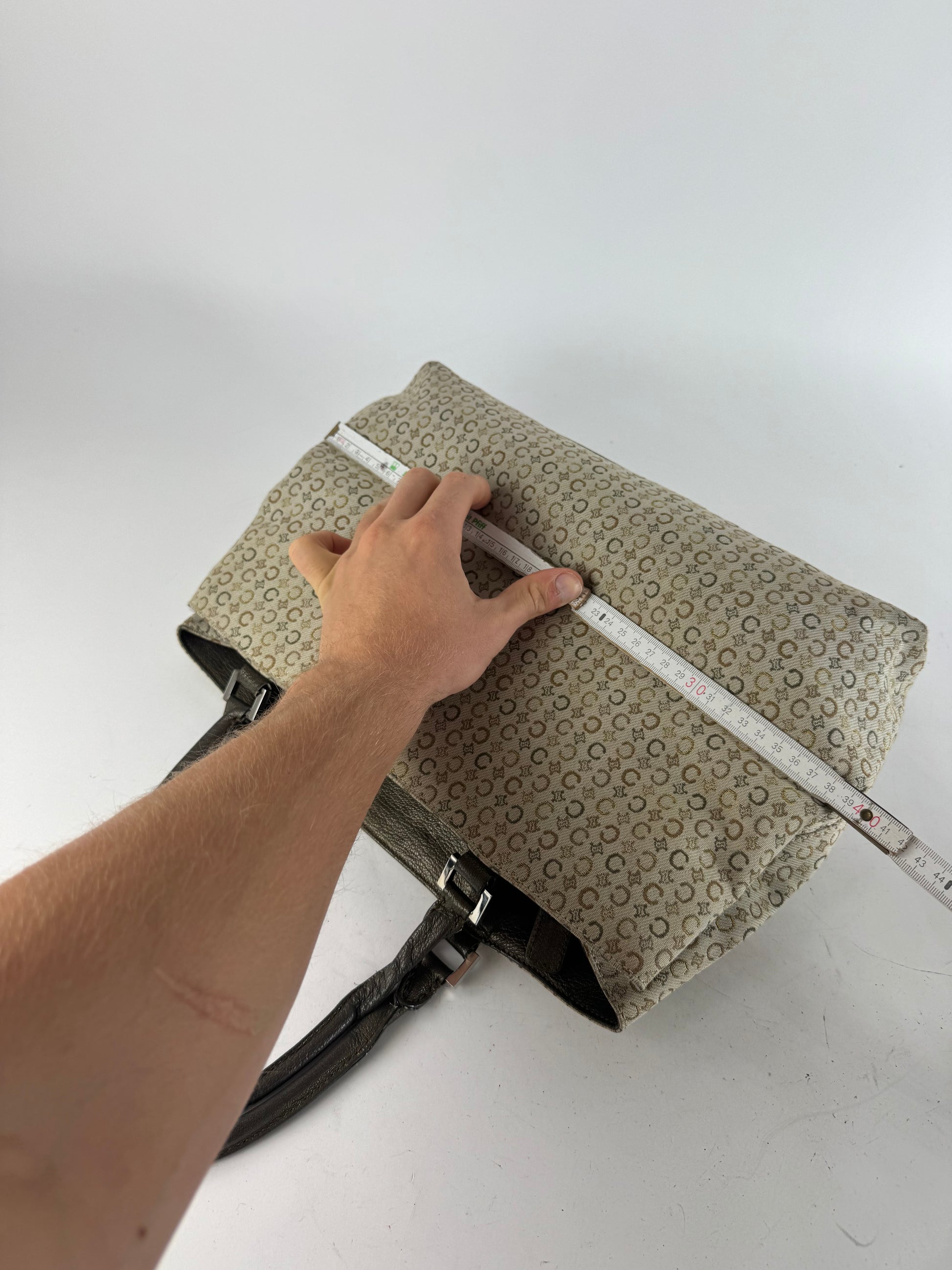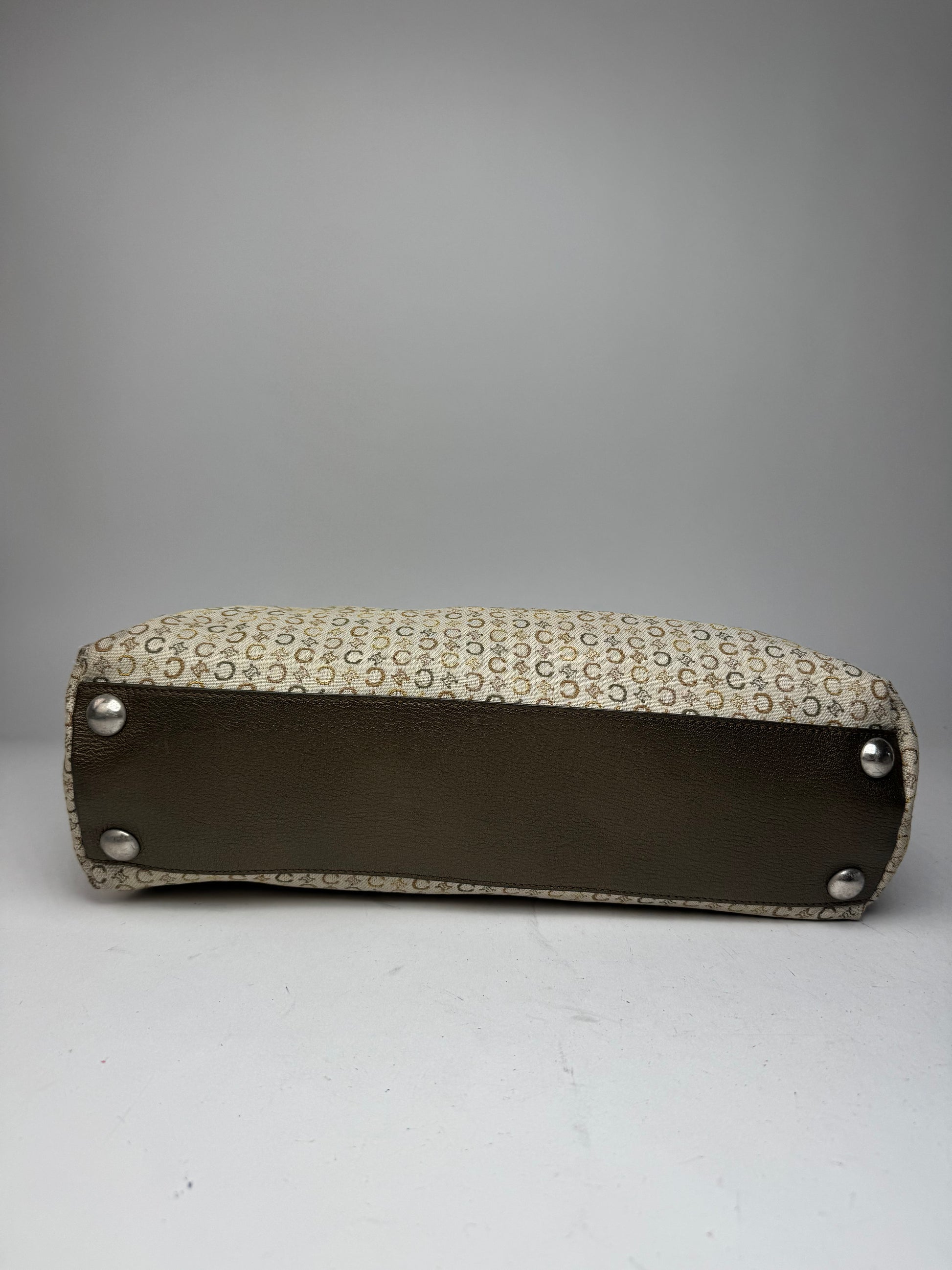 This exquisite vintage tote bag is finely crafted from beige canvas featuring the brown and grey Celine “C” and Triomphe monogram pattern. It includes bronze-toned leather handles and trim, complemented by silver-tone steel hardware. The interior is lined with brown canvas and offers three compartments for organized storage. Made in Italy, this piece perfectly captures Celine’s timeless Parisian refinement.