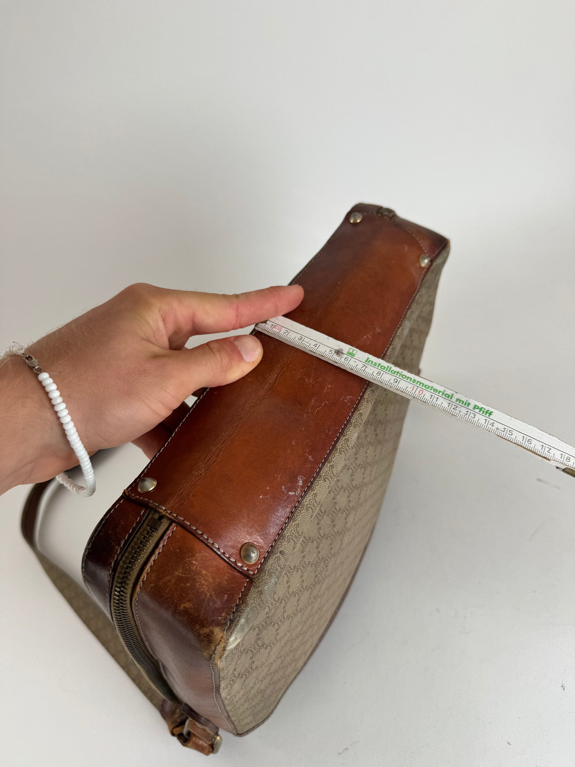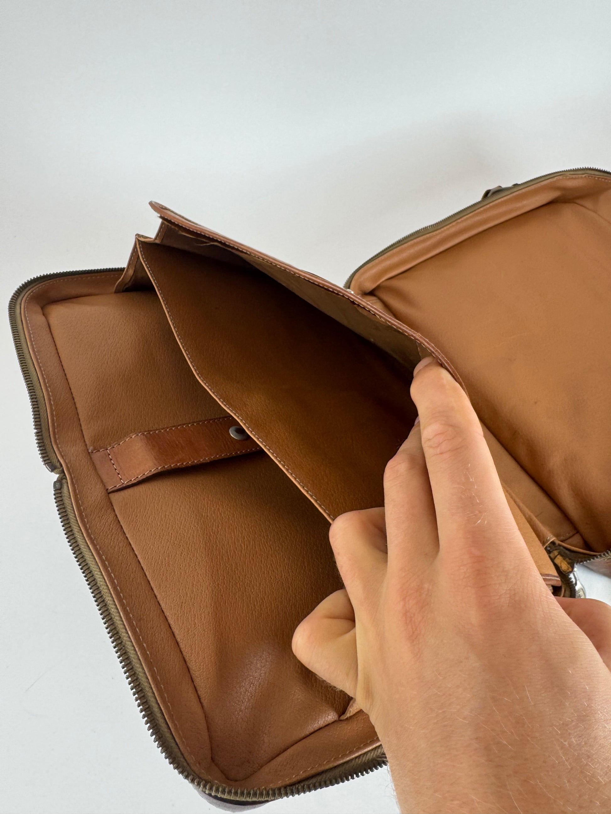 Condition Details: The exterior leather remains overall in good vintage condition with worn corners, light stains, and general signs of use. One of the two front zippers is partially defective and functions inconsistently; replacement is recommended. The handle and strap are strong and secure. The hardware, in gold-tone steel, shows minor scratches. The interior leather lining is clean and well-kept with ample storage space.