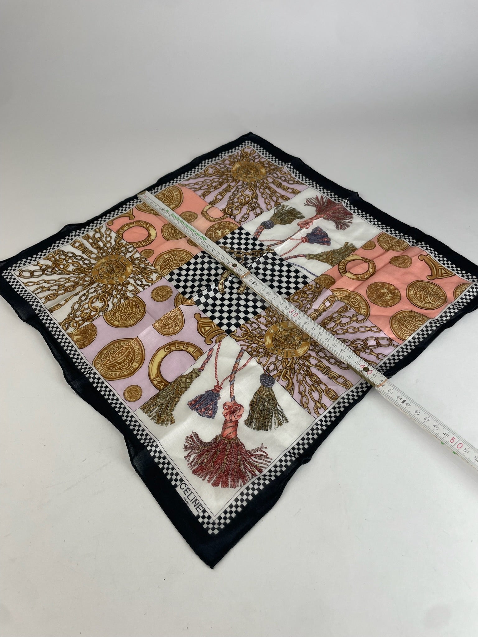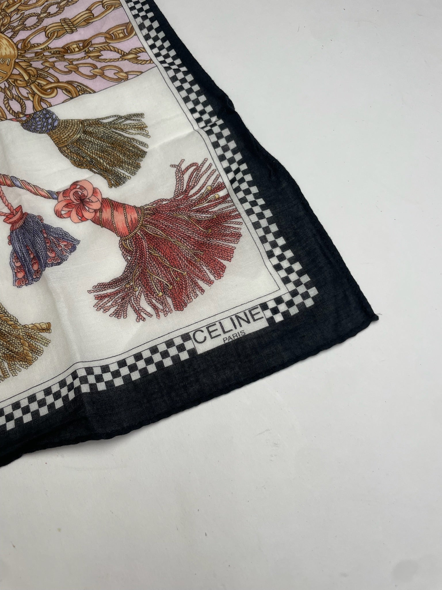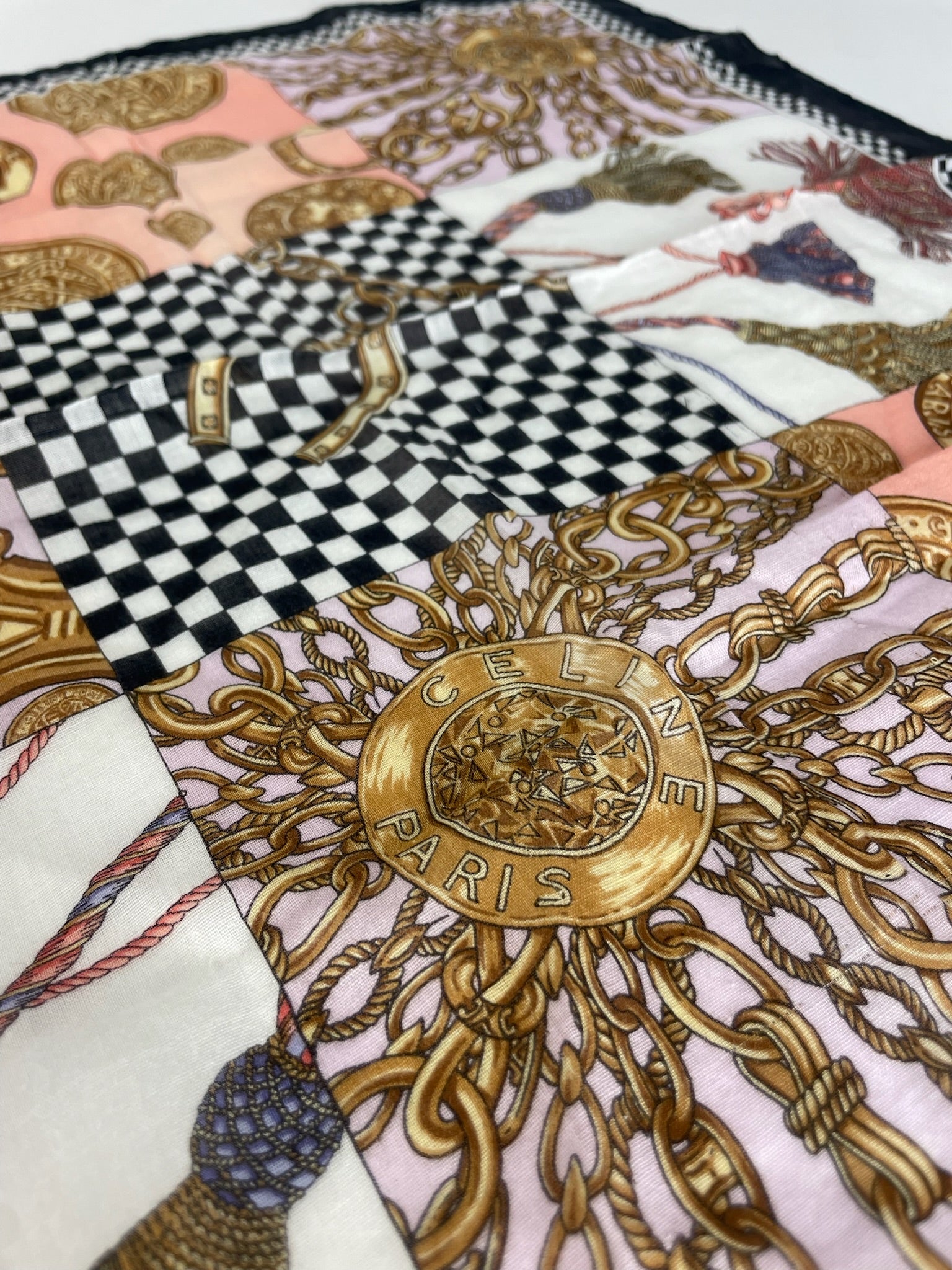 CELINE PARIS Vintage Scarf. This distinctive vintage scarf is finely crafted of silk and cotton and features a multi-layered design. The scarf is finished with a black outer border, followed by a black-and-white checkered border, and showcases nine different patterns and motifs, offering a unique and eclectic aesthetic.