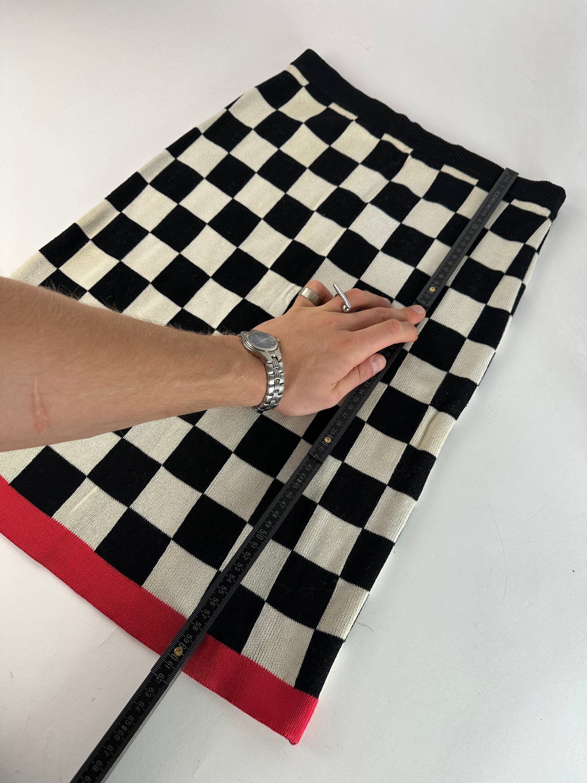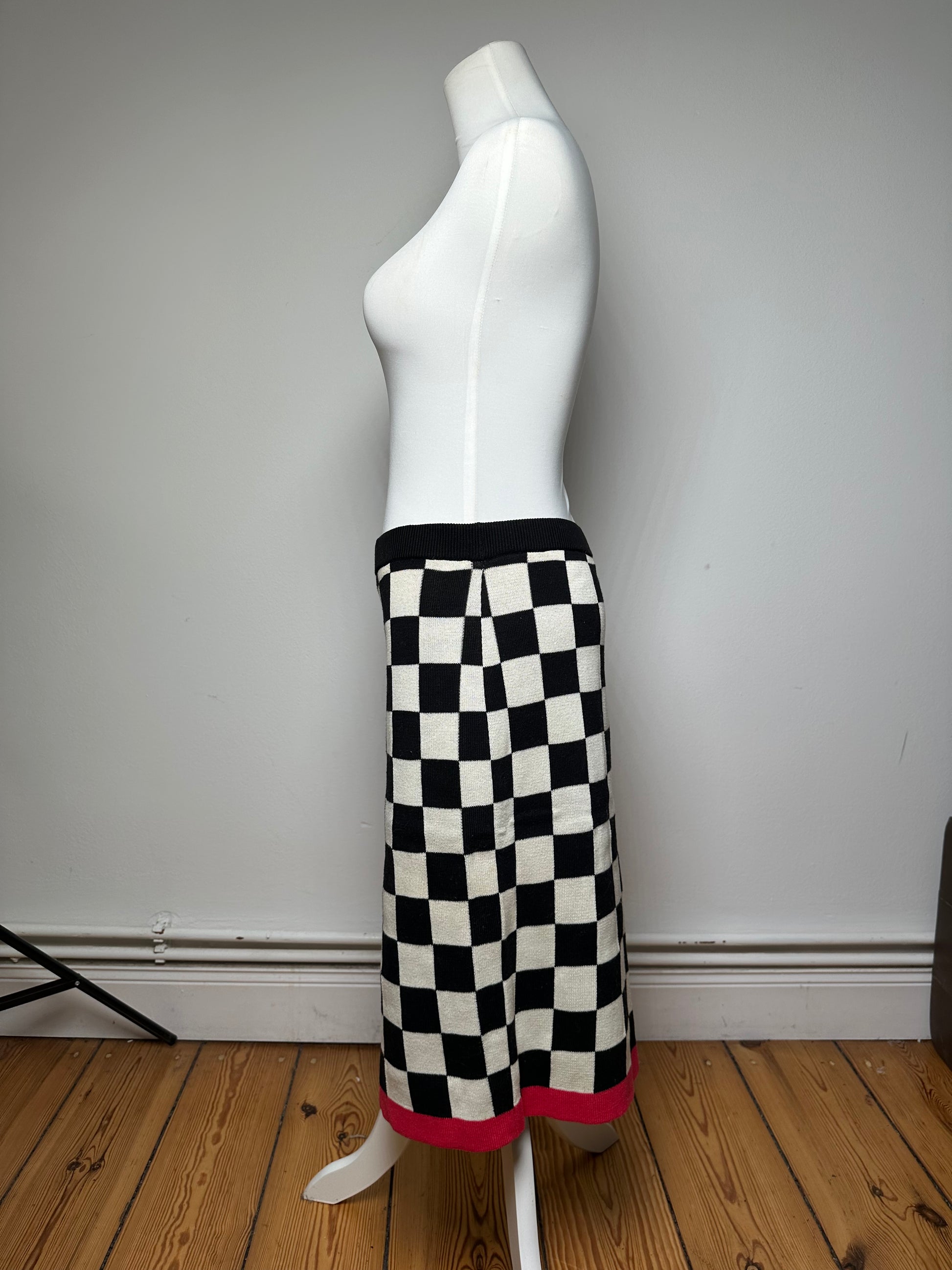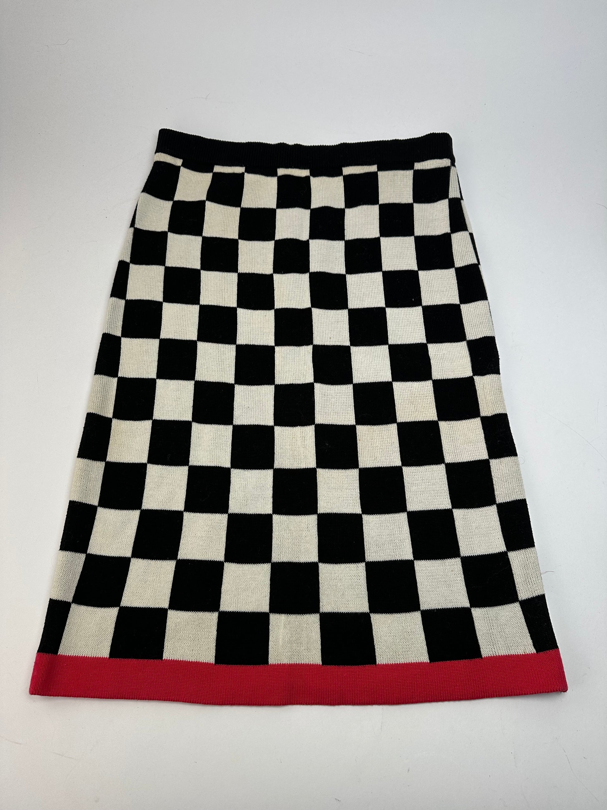 CELINE Vintage Skirt. This stylish skirt is crafted of black and white stretch cotton in a checkerboard pattern with a contrasting red stripe at the hem. The design offers a flattering silhouette with comfortable elasticity. The mannequin in the photos is size 38/M.