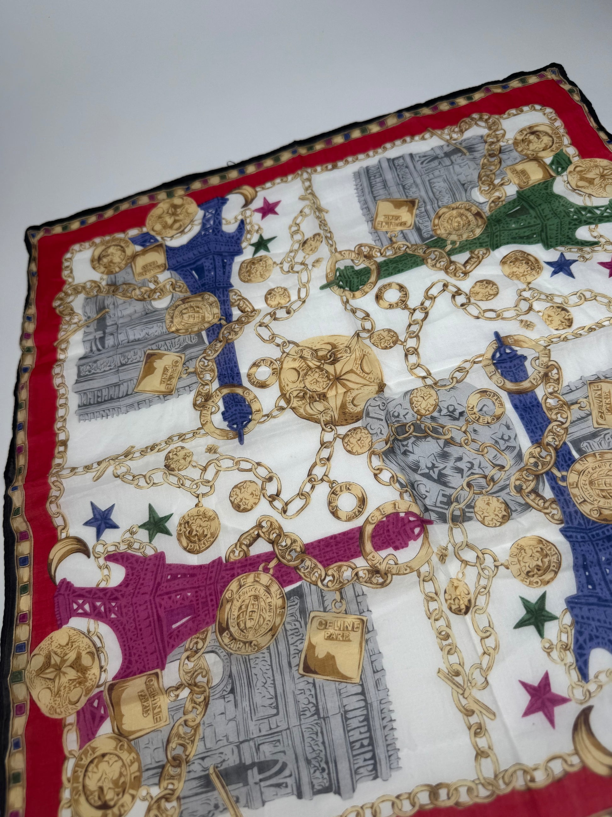 This vibrant vintage scarf is finely crafted with a baroque-inspired multicolored pattern. The design features iconic motifs like the Eiffel Tower, interwoven with luxurious chain illustrations. Framed with a bold red border, this unisex accessory is both stylish and timeless. Despite light creasing, the scarf remains in very good condition.